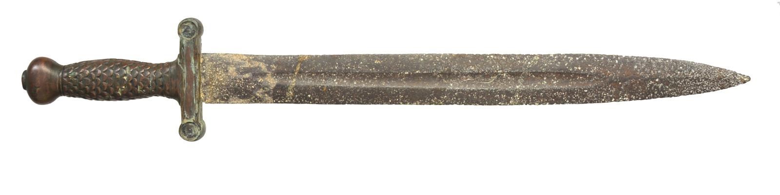 Overall length: 24 3/4". Blade length: 18 3/4". Blade exhibits a central fuller. Hilt is solid cast brass w/ fish scale grip. There are no rivets in the grip. Pommel is plain & void of impressed eagles. No scabbard. CONDITION: the excavated blade is very dark & pitted but remains solid. The hilt has a very dark brown excavated patina. (02-14195-1/BF). $600-800.