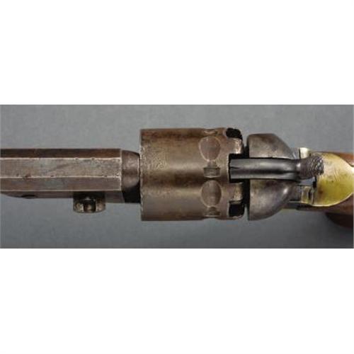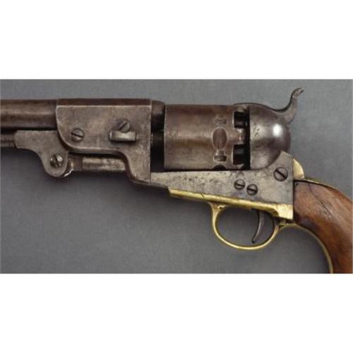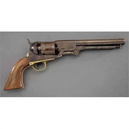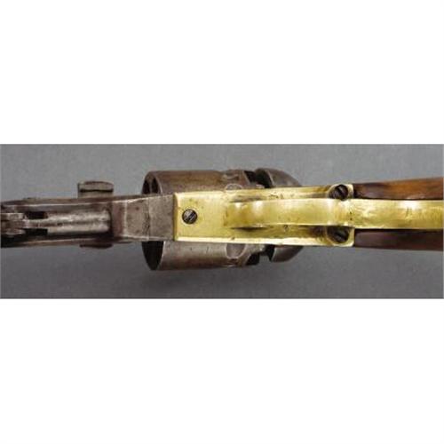 <B>EXCEEDINGLY RARE CONFEDERATE RIGDON, ANSLEY & CO. .36 CALIBER PERCUSSION PATTERN REVOLVER.</B></I> One of two known specimens. Completely unmarked/unnumbered but unquestionably the product of Rigdon and Ansley being a prototype transitional pattern between the six stop Leech & Rigdon and the twelve stop Rigdon & Ansley revolvers. After the dissolution of the firm of Leech & Rigdon, Rigdon formed the Rigdon, Ansley Co. in Augusta Ga., completing the original Leech and Rigdon contract and beginning production of an improved revolver. This gun represents the transition between those two models. William A. Gary, author of “Confederate Revolvers” states in a letter of March 28, 1988 that “It is absolutely an authentic Rigdon & Ansley”. And that he examined another specimen in the Washington on the Brazos museum in Texas which is identically “unmarked, unnumbered and has the cylinder stops ground out in exactly the same manner. Additional documentation of the revolver’s lineage and identification are included. The revolver was originally discovered in California in the mid 1960s and the subsequent discovery of the identical specimen in the Washington on the Brazos museum provided the final clue to establishing the gun’s true significance. Certainly one of the most important Rigdon, Ansley & Co. Revolvers known. <BR><BR><B>Condition:</B></I> In addition to its incredible rarity this is certainly one of the finest condition Rigdon & Ansley revolvers extant. All metal with smooth dark untouched patina mixing with scattered vestiges of blue, just a few minor dents by the wedge. Sharp and crisp, mechanically perfect, excellent bore and completely original in every respect.<BR>Brass straps with pleasing color, untouched, exhibiting a few minor casting flaws and some minor dents. Grips also excellent and untouched with traces of varnish. Overall really superb.<BR><BR><b>Shipping:</b> Requires 3rd Party Shipping (<a target="_blank" href="http://www.heritageauctions.com/common/shipping.php">view shipping information</a>)