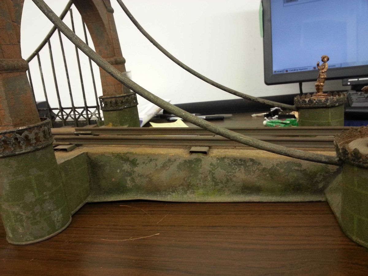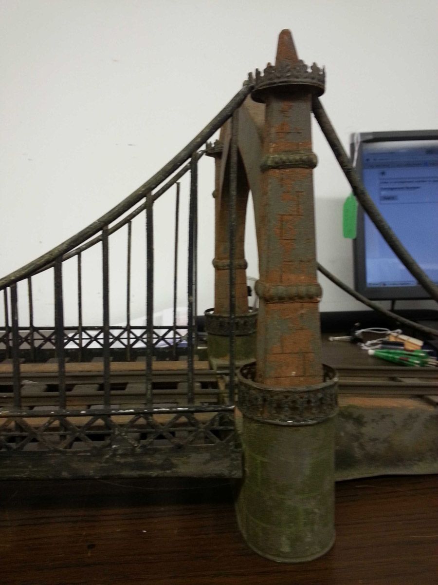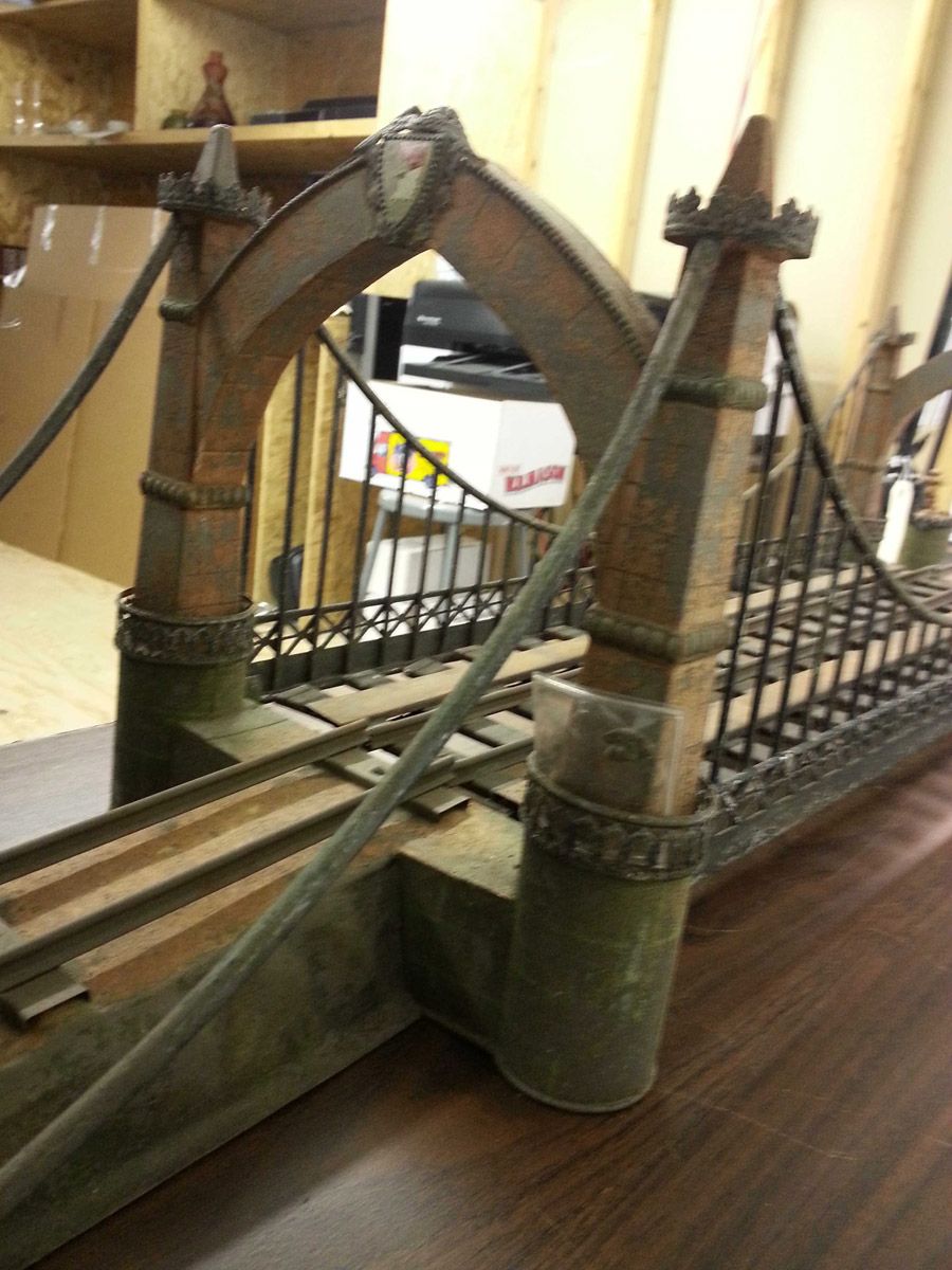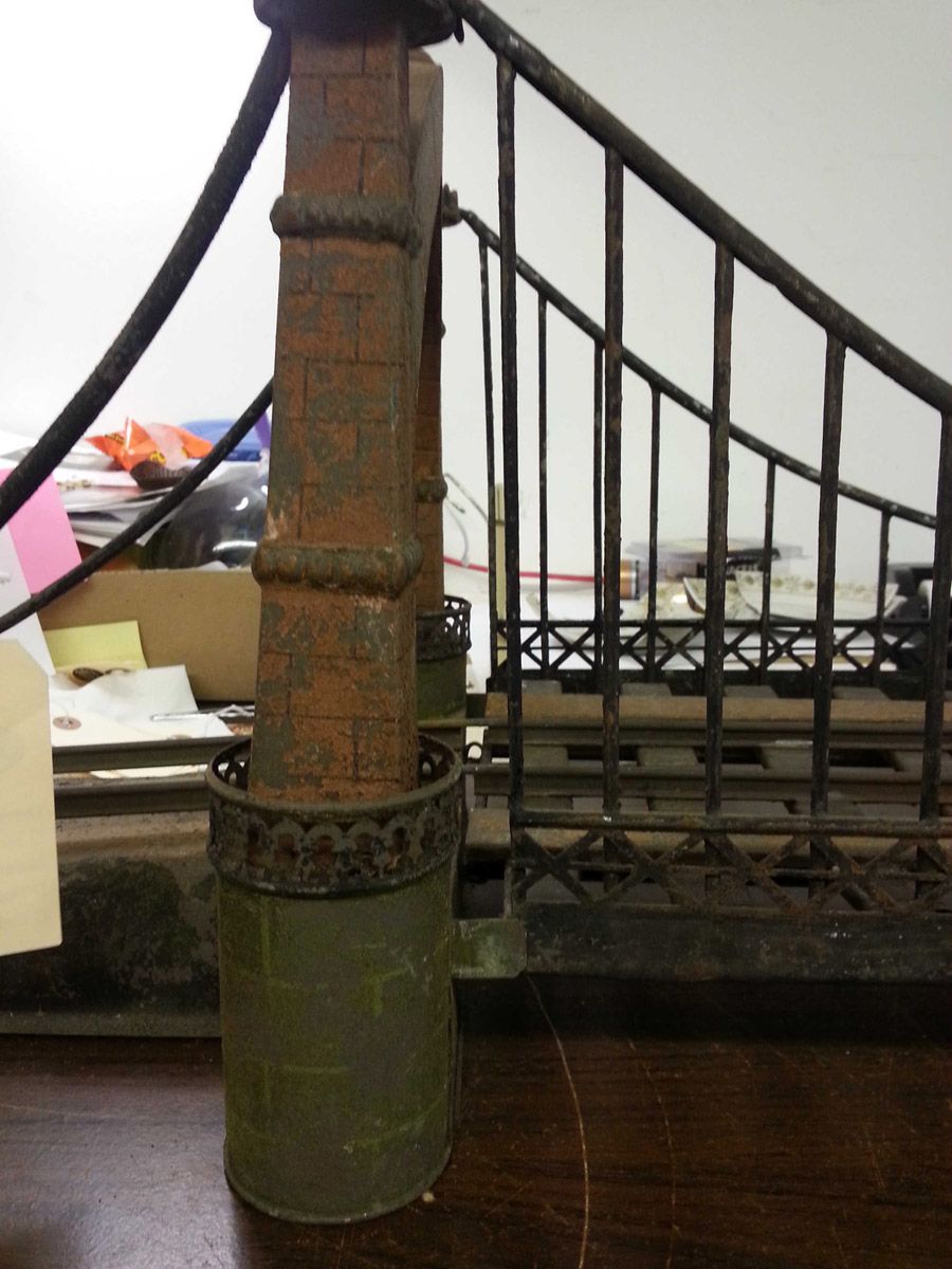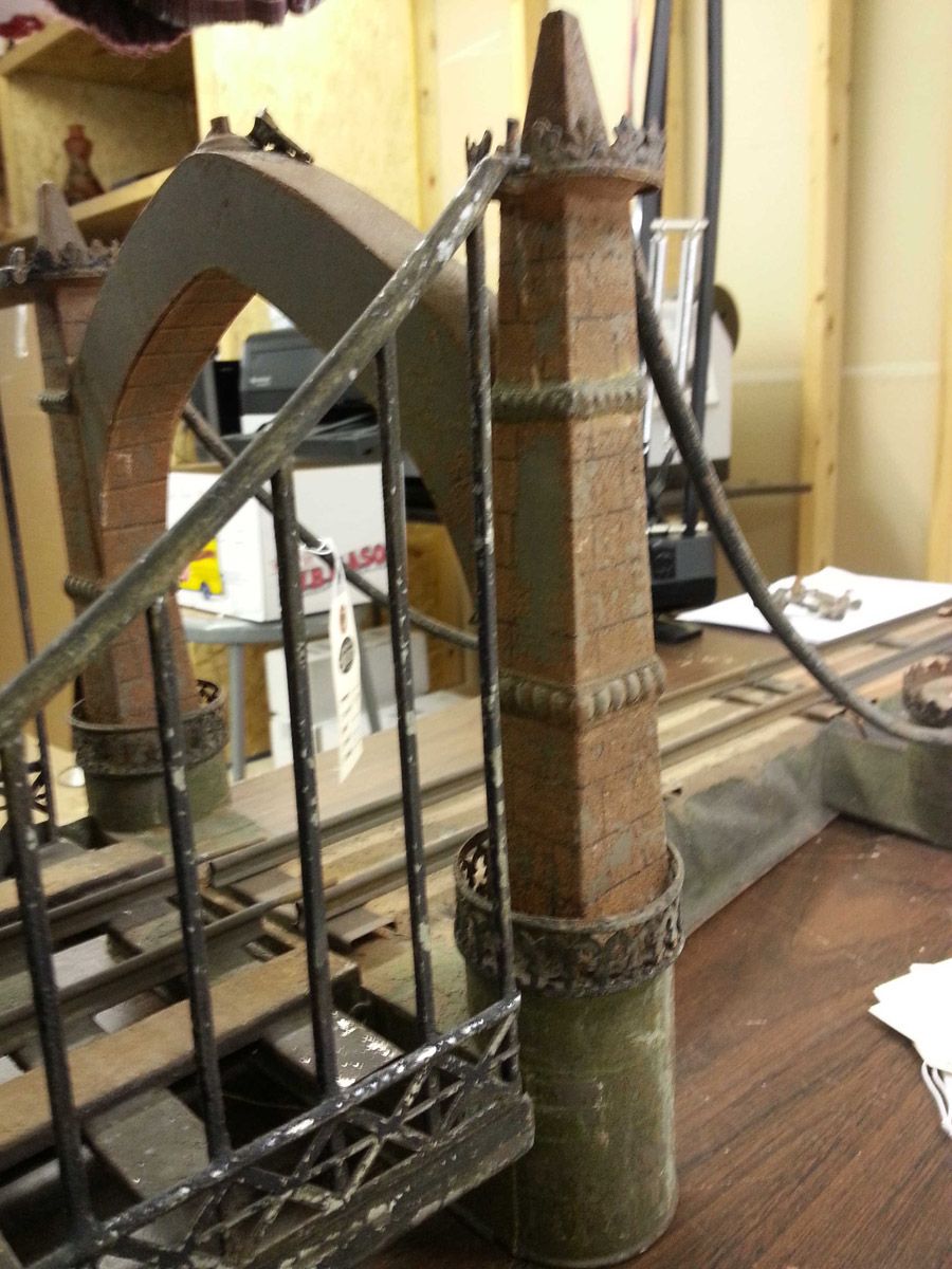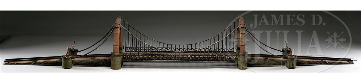 This is an exemplary bridge from the early 20th century by the famed German toymaker Marklin. In as found, untouched original finish this toy came from a Rhode Island estate. Beautiful simulated stone work on the upright pillars with a plethora of fanciful trims such as the shields and the intricate wire suspension span. Fine filigree throughout, simulated grass mounds on the ramps along with the 4 figures that adorn the entrance pillars. One could only imagine traveling through Europe and driving by this ornately styled bridge. The Marklin firm always used real life models and duplicated them in miniature form. It is easy to comprehend why Marklin toys are so highly regarded and sought after by collectors today. SIZE: Approximately 83" in length. CONDITION: Overall fair to good original paint finish. The bridge itself is structurally sound and complete other than some missing flags to top of pillars. Bridge retains 2 original figures on pillars, consignor had 4 replicas made for display purposes. 1-13267