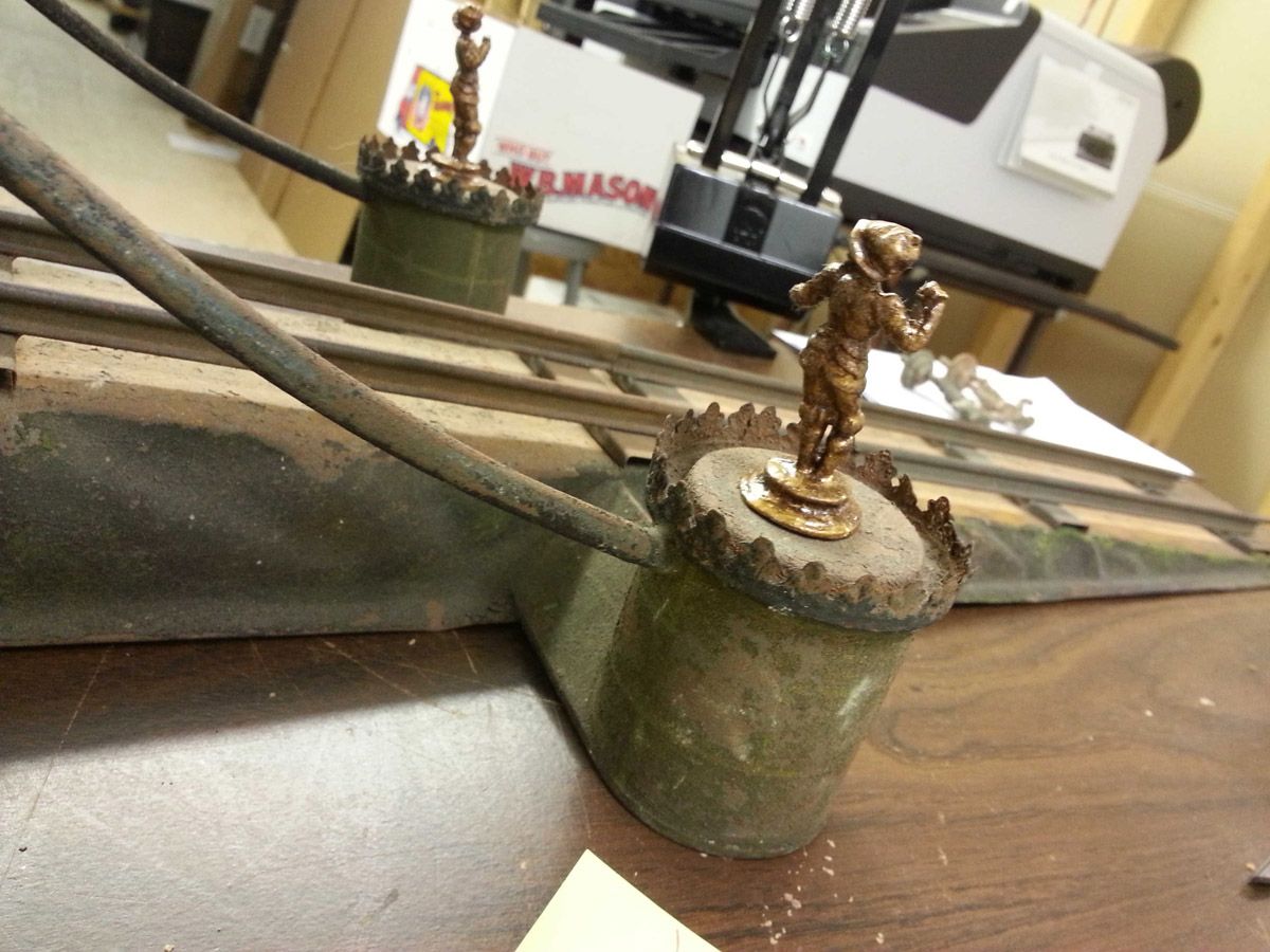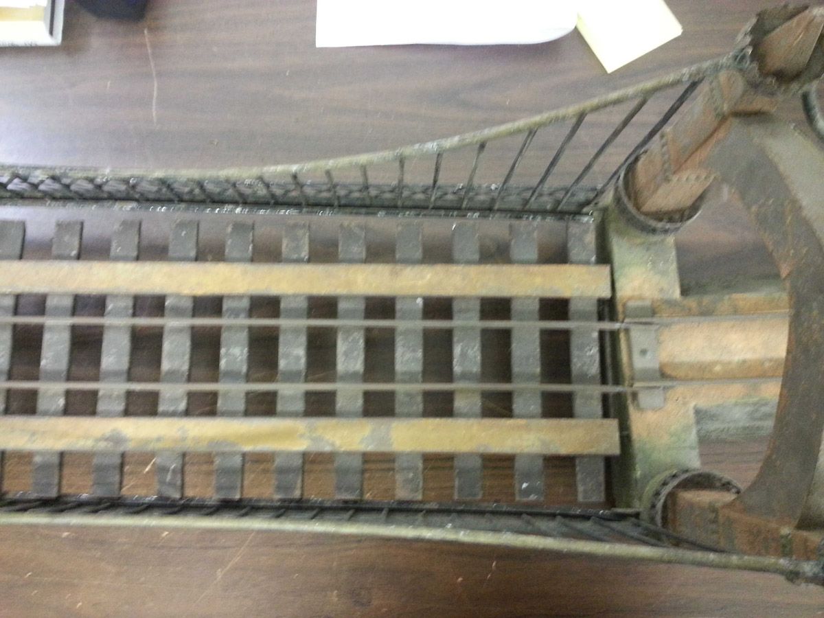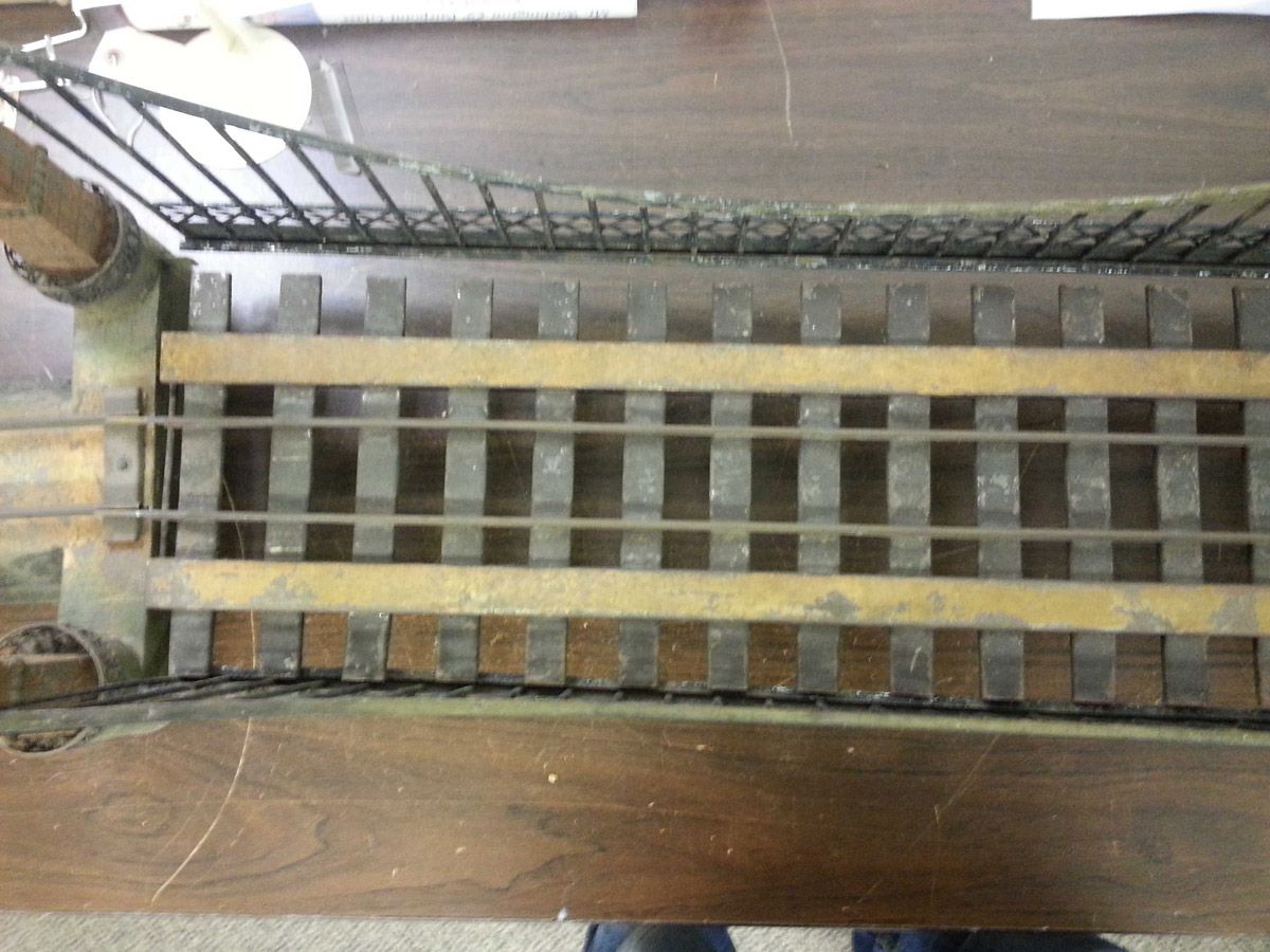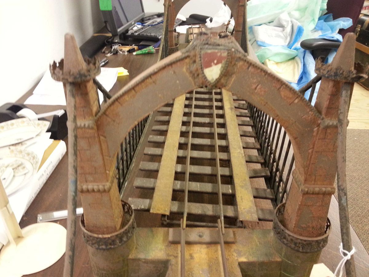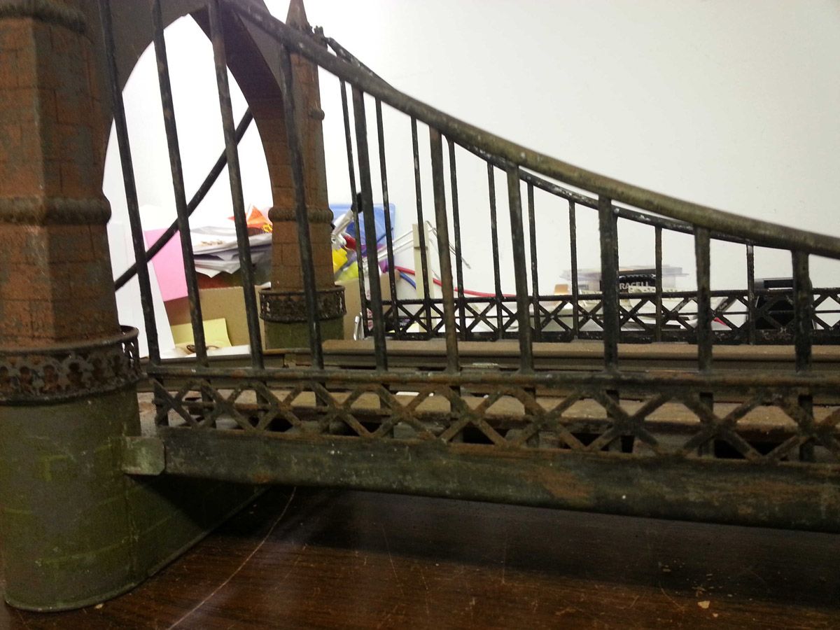 This is an exemplary bridge from the early 20th century by the famed German toymaker Marklin. In as found, untouched original finish this toy came from a Rhode Island estate. Beautiful simulated stone work on the upright pillars with a plethora of fanciful trims such as the shields and the intricate wire suspension span. Fine filigree throughout, simulated grass mounds on the ramps along with the 4 figures that adorn the entrance pillars. One could only imagine traveling through Europe and driving by this ornately styled bridge. The Marklin firm always used real life models and duplicated them in miniature form. It is easy to comprehend why Marklin toys are so highly regarded and sought after by collectors today. SIZE: Approximately 83" in length. CONDITION: Overall fair to good original paint finish. The bridge itself is structurally sound and complete other than some missing flags to top of pillars. Bridge retains 2 original figures on pillars, consignor had 4 replicas made for display purposes. 1-13267