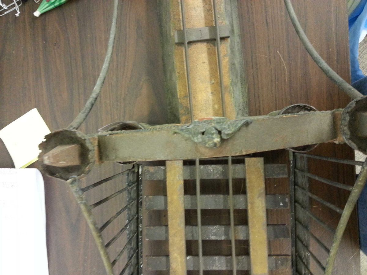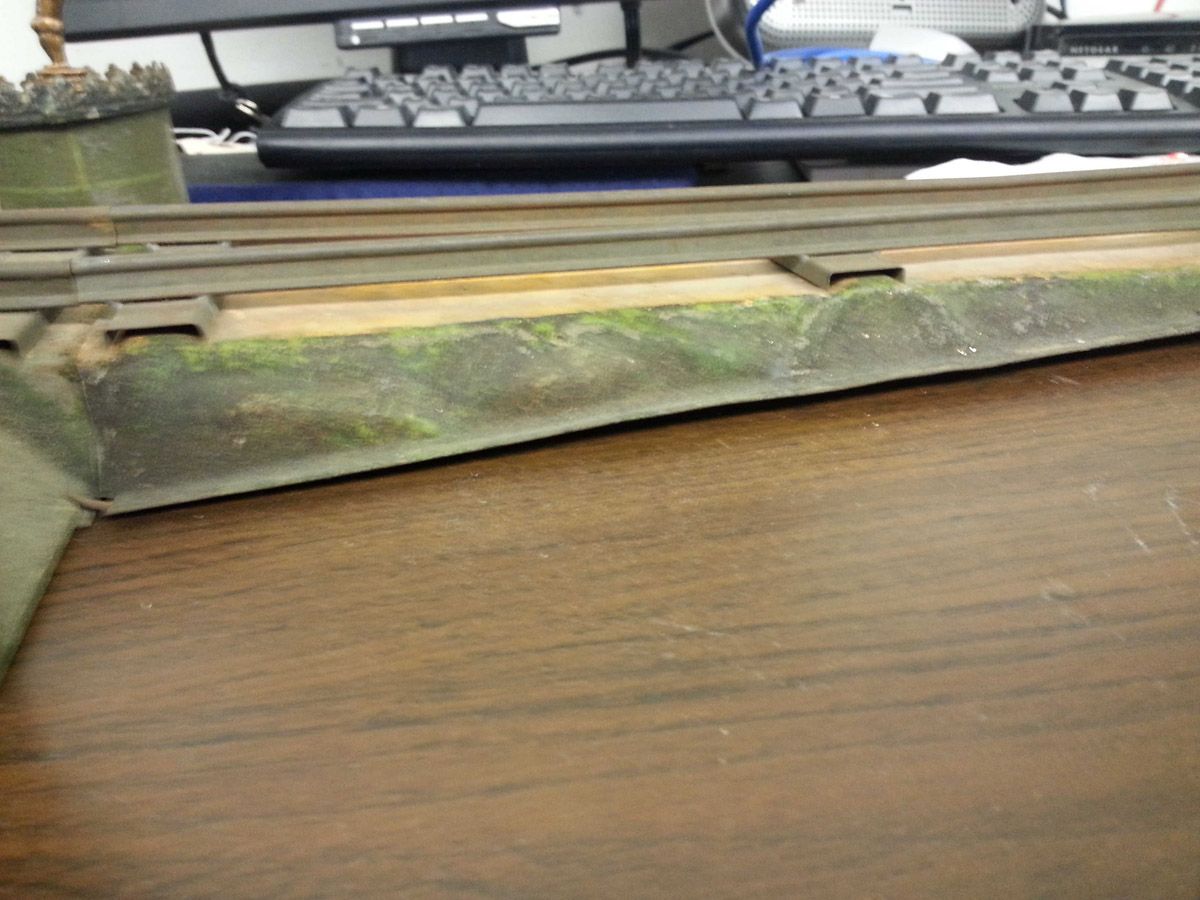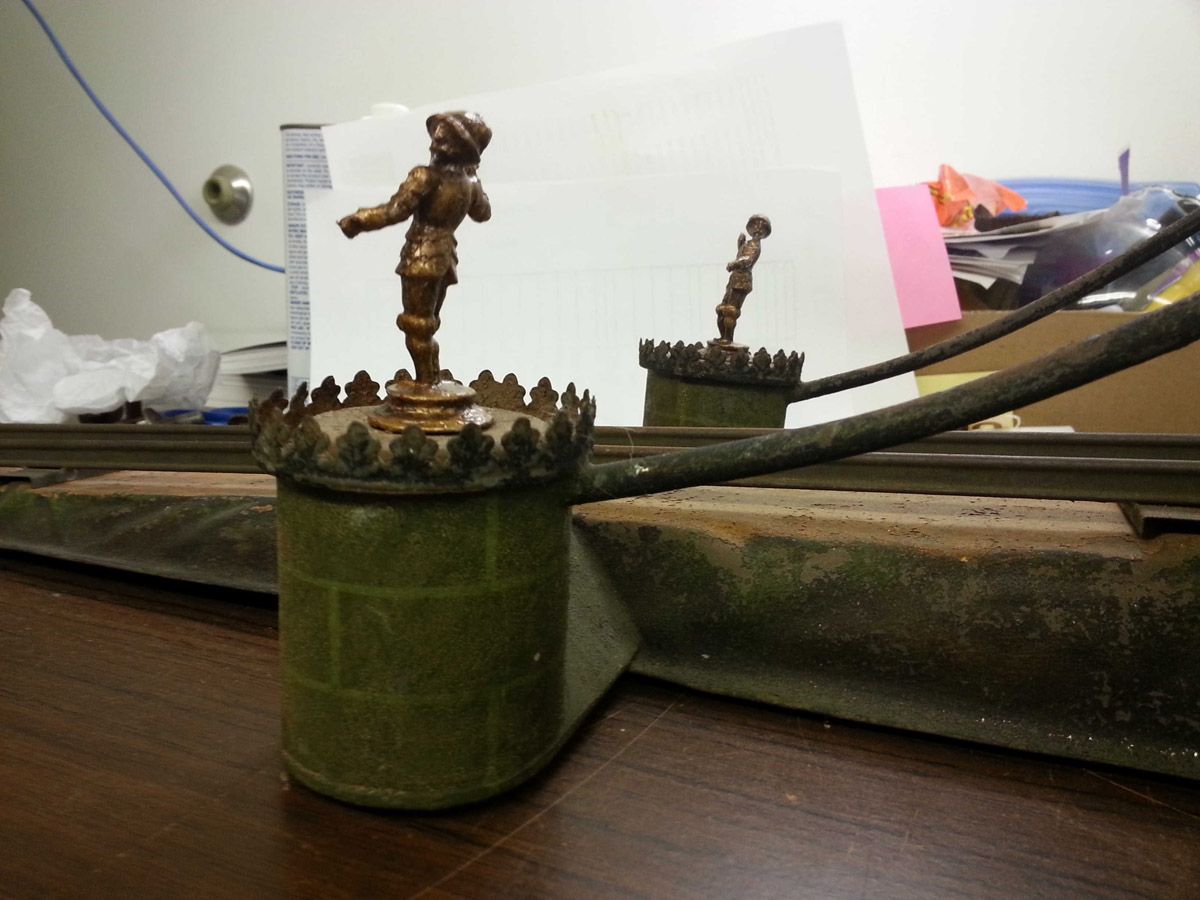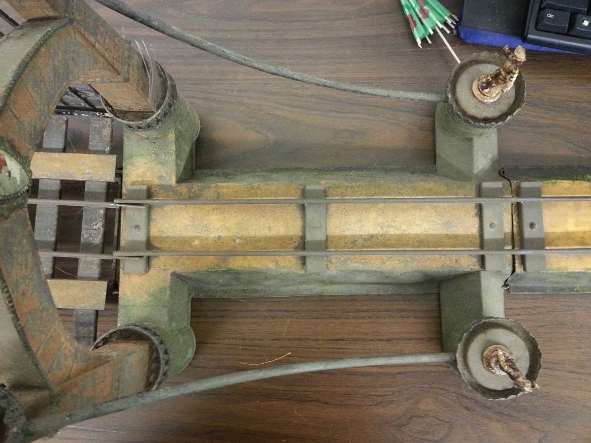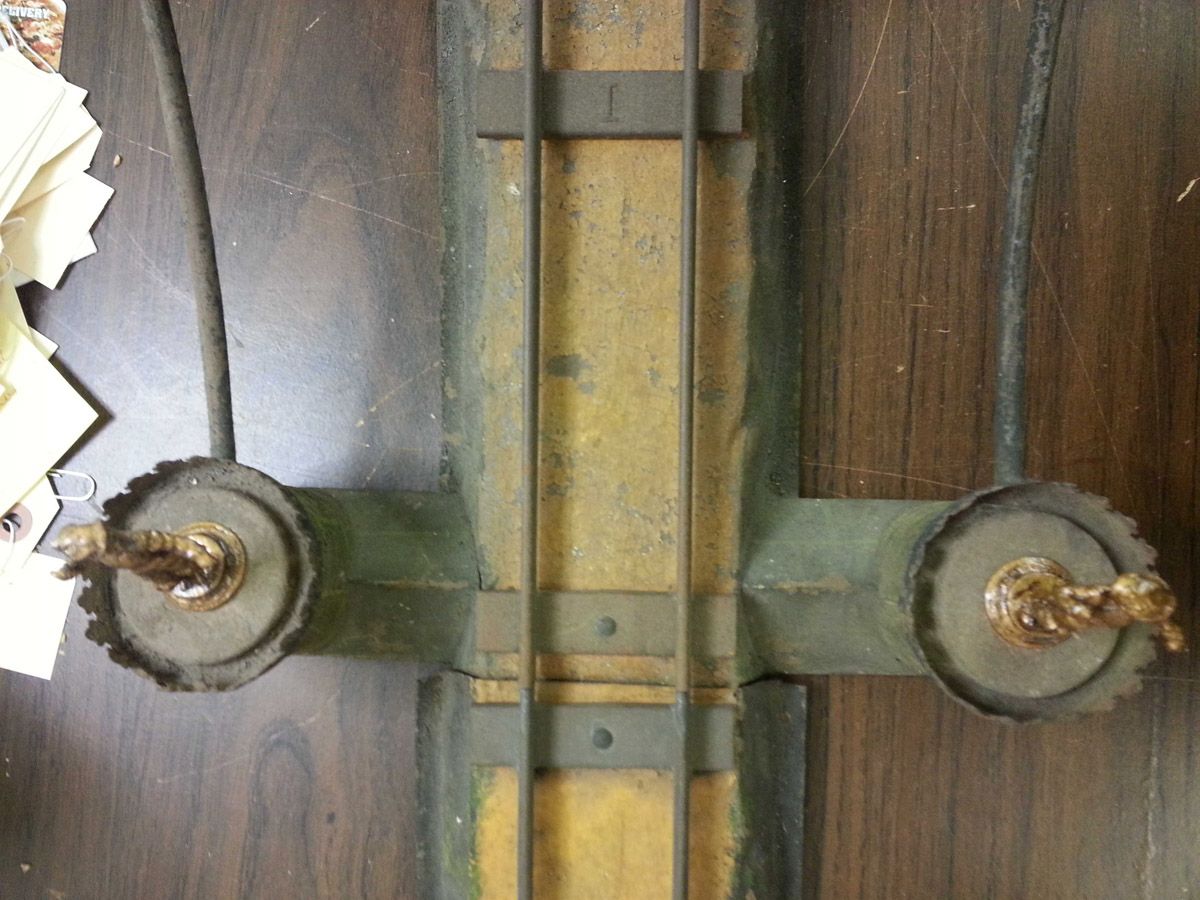 This is an exemplary bridge from the early 20th century by the famed German toymaker Marklin. In as found, untouched original finish this toy came from a Rhode Island estate. Beautiful simulated stone work on the upright pillars with a plethora of fanciful trims such as the shields and the intricate wire suspension span. Fine filigree throughout, simulated grass mounds on the ramps along with the 4 figures that adorn the entrance pillars. One could only imagine traveling through Europe and driving by this ornately styled bridge. The Marklin firm always used real life models and duplicated them in miniature form. It is easy to comprehend why Marklin toys are so highly regarded and sought after by collectors today. SIZE: Approximately 83" in length. CONDITION: Overall fair to good original paint finish. The bridge itself is structurally sound and complete other than some missing flags to top of pillars. Bridge retains 2 original figures on pillars, consignor had 4 replicas made for display purposes. 1-13267