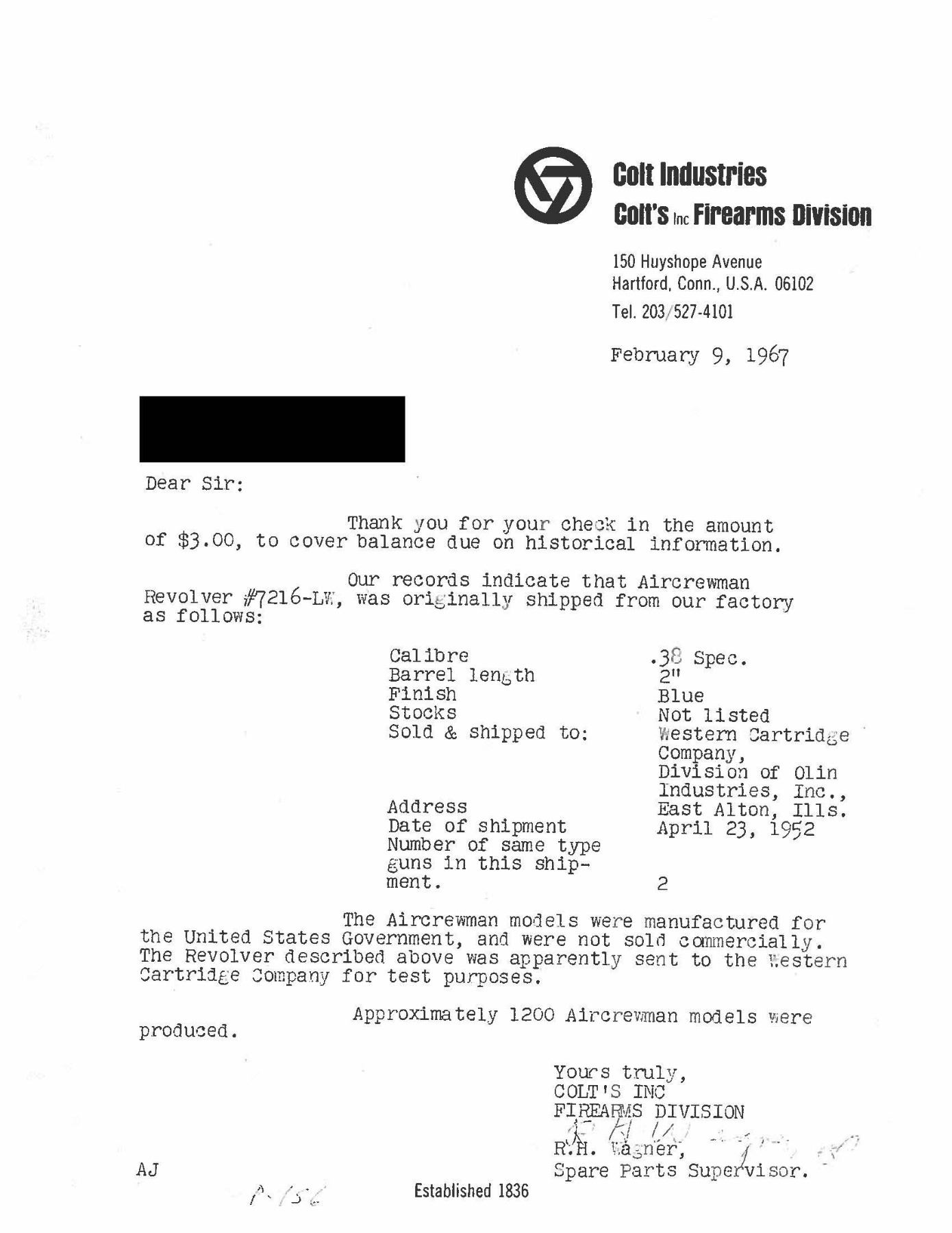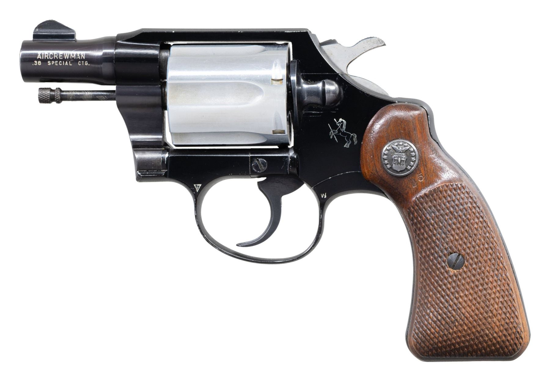 PURPOSE DA REVOLVER. Cal. 38 Spl. S# 7216-LW. Bbl. 2" with serrated ramp front sight. Left side of bbl. is marked "AIRCREWMAN/ .38 SPECIAL CTG.". 6-shot fluted aluminum in-the-white cyl. Anodized aluminum frame. 2-piece checkered walnut grips that overlap the frame with silver Air Force medallions. Left grip is stamped "35" below the medallion. This test model lacks the standard Air Force markings on the grip strap and butt. Approx. 1,156 were mfg. in 1951-1952 within the S# 2900LW-7775LW. While safe for use with specially designed low pressure cartridges, the cyls. were not safe with pressures generated in standard .38 Special ammunition, ultimately leading to their recall and destruction. Perhaps less than 50 survived and made it into commercial channels. UNATTACHED ACCESSORIES: Colt factory letter dated "February 9, 1967" stating: "Our records indicate that Aircrewman Revolver #7216-LW, was originally shipped from our factory as follows: Calibre .38 Spec./ Barrel length 2"/ Stocks Not Listed/ Sold & Shipped to: Western Cartridge Company, Division of Olin Industries, Inc./ Address East Alton, Ills./ Date of shipment April 23, 1952/ Number of same type guns in this shipment 2/ The Aircrewman models were manufactured for the United States Government, and were not sold commercially. The revolver described above was apparently sent to the Western Cartridge Company for test purposes./ Approximately 1200 Aircrewman models were produced.". CONDITION: bbl. retains over 95% blue showing slight edge wear. Frame retains 90% black finish showing slight edge and carry wear. Cyl. has good in-the-white finish, with a single hardness test dot on rear face. Bbl. and frame markings are highlighted in white. Grips show light checkering wear. Sound action. Bright near excellent bore. While the Aircrewman is exceedingly scarce in its own right, apparently only 2 were sent to the Western Cartridge Company for ammunition development and testing. (25-4573/DS). CURIO. $10,000-15,000.