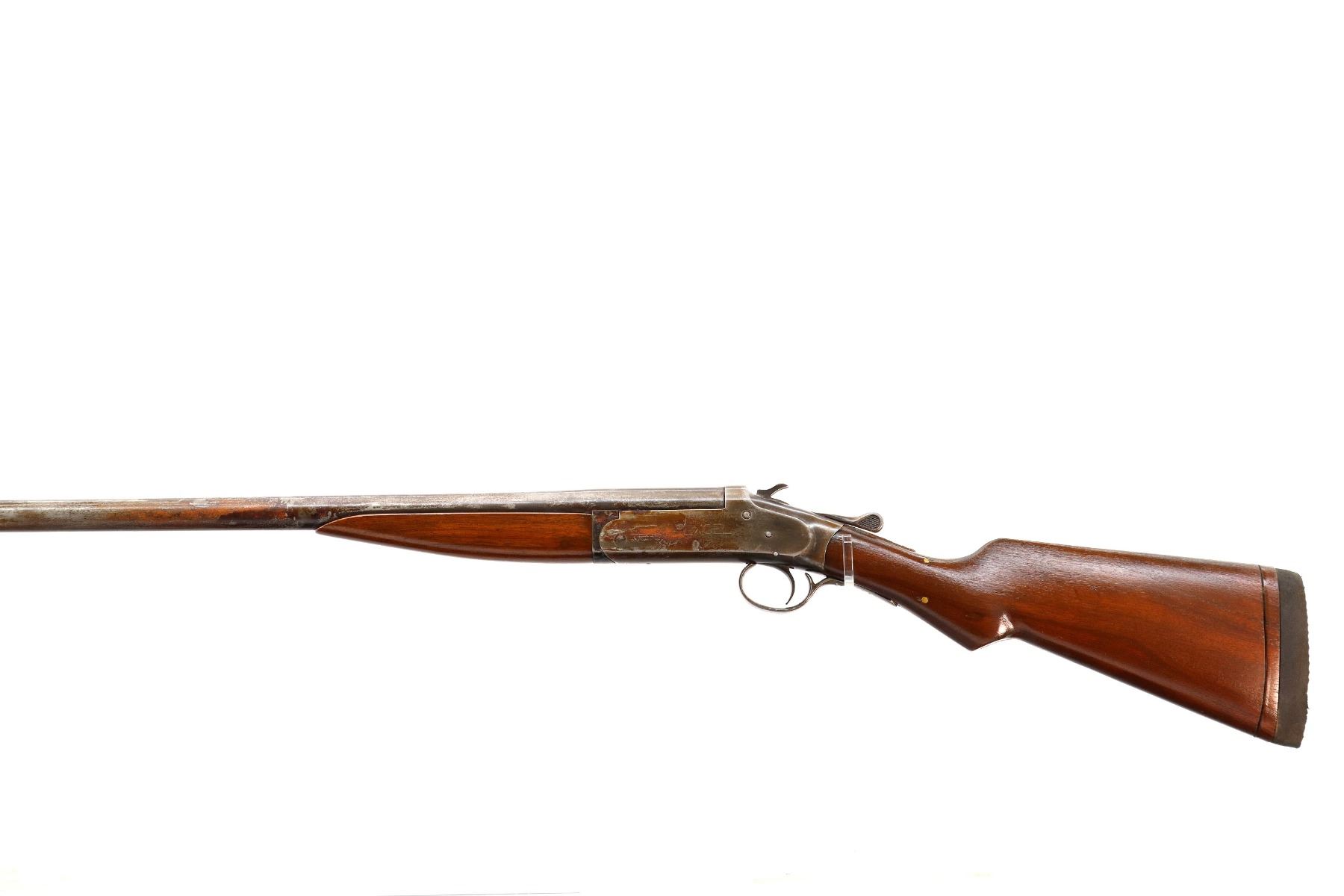 Main Description: Missing bead, threaded hole present, tapered round barrel, checkered spur hammer, extractor. Two piece wood stocks, forearm is cracked on both sides, pistol grip, chipped, cracked and repaired with brass pins, black rubber recoil pad with wood spacer, 13.75" LOP.