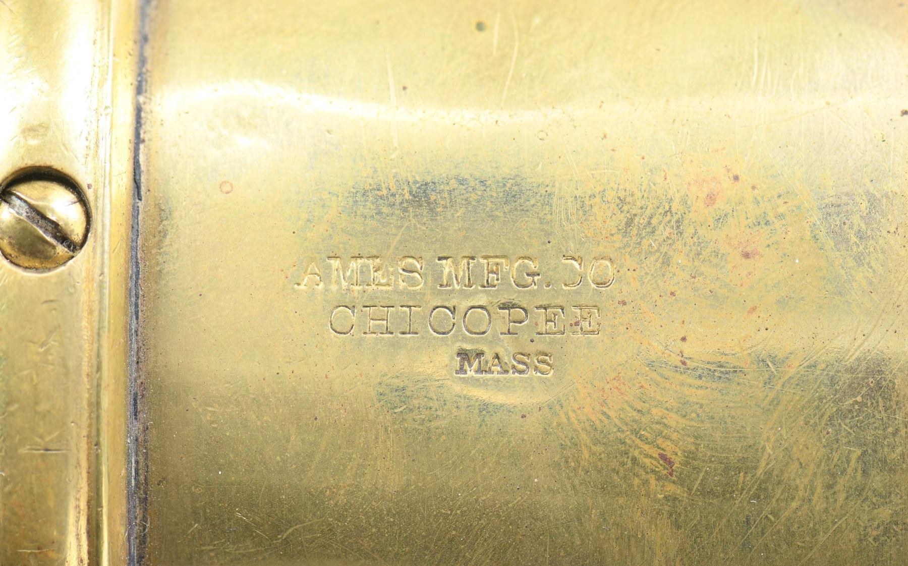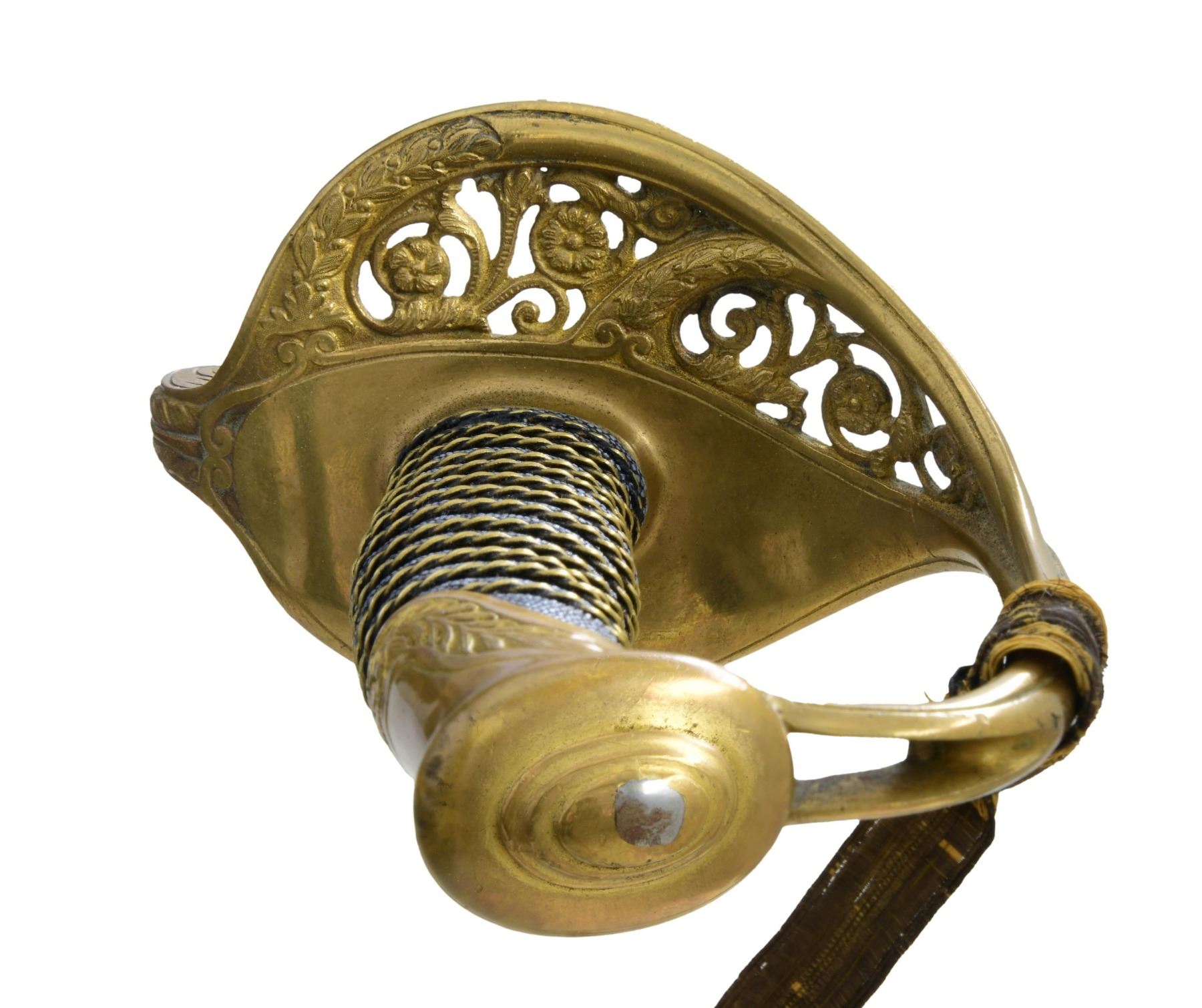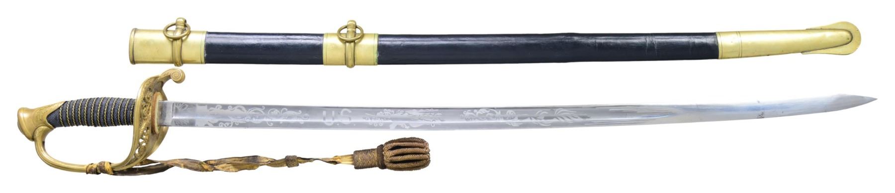 SWORD. 30.5" patriotic etched blade marked "Ames Mfg. Co / Chicopee / Mass" in light etch mark, partially stamped 1861 on ricasso which is added later. Scabbard is Ames maker marked on throat. CONDITION: excellent, blade retains most all of its frost & luster, brass hilt & scabbard mounts retain some original gold wash & overall yellow mustard patina, original buff leather washer, fine complete shark skin grip & twisted brass wire wrap. Scabbard is fine, sound & solid, light craquelure, fits perfectly. Accompanying gold bullion sword knot has fraying in strap but solid. (02-24278/JS). NON-GUN. $800-1,200.