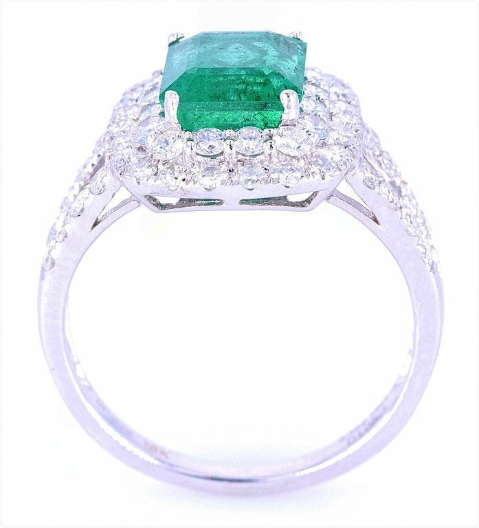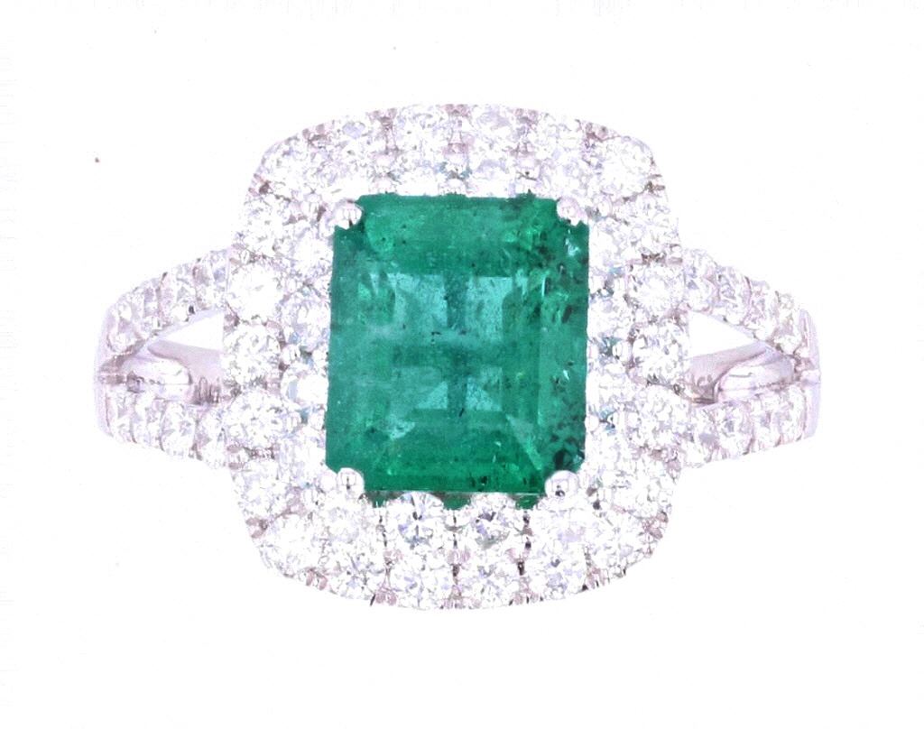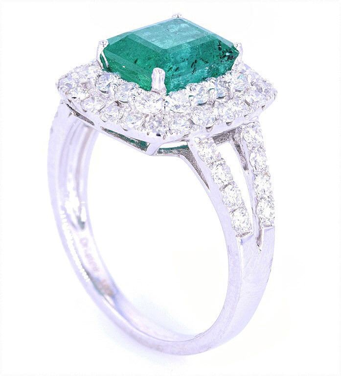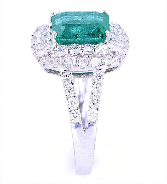 This is an excellent 2.14 carat natural Emerald & 1.08 carat Diamond 18K white gold ring. The Emerald, which is widely considered one of the more valuable and astounding precious gemstones, set in this ring shows a rectangular step cut natural stone with an exact weight of 2.14 carats, a nice clarity with inclusions, type III and strong green coloring (cut is good). The ring shows a solid 18 karat white gold high craftsmanship with a fine polish, diamond dual stepped bezel halo with large natural Emerald, diamond set split shoulders and a beautiful 18K gold lattice work under the setting. The ring is set with 48 round brilliant cut diamonds with an exact total weight of 1.08 carats, SI-2 to I-2 clarity and G-I coloring. The ring is marked “18k” and “ORIANNE” along with the stone’s weights. The ring comes with a AIG (American International Gemologists) report and appraisal which values the ring at $17,980.00 and confirms the above info. The ring shows a size of 7 US.
