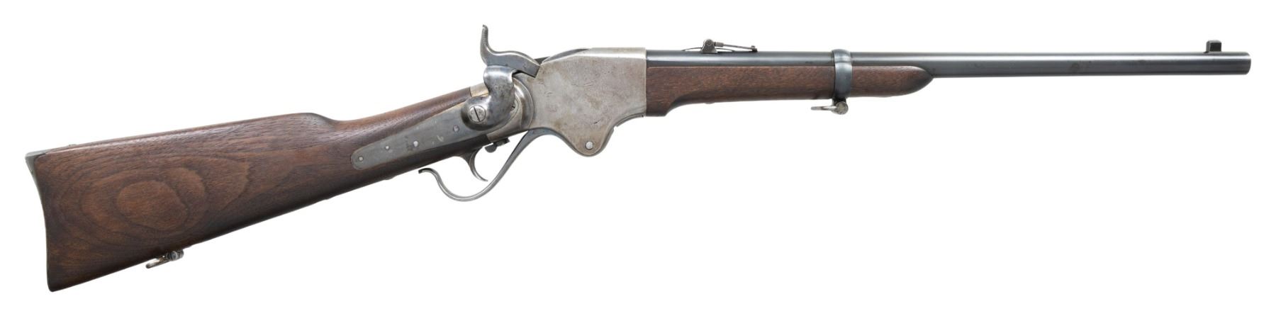 SPENCER SADDLE RING CARBINE. Cal. 50. S# 18817. Standard configuration of the Civil War model, 20" 6 land and groove rifled barrel, adjustable rear sight, top of breech: "SPENCER REPEATING / RIFLE CO. BOSTON MASS / PAT'D MARCH 6, 1860". Carbine was altered so it could be shot by direct loading not using loading magazine in stock. The Stabler device uses a pivoting flange forward of trigger to activate. The only other external difference is the shape of the hammer nose. Later model 1865 Spencer carbines would have 22" barrels with three land and groove rifling. An Imperial German viewing proof stamped on barrel & breech probably captured from French in Franco Prussian War. Carbine shows almost no use. French bought great deal of surplus US carbines in late 1860s. CONDITION: extremely fine overall, barrel retains virtually all thinning blue, traces of case color balance silver/gray. Stocks are crisp with raised grain and no proofs. Mechanics crisp, bright shiny rifled bore. (01-27256/JS). ANTIQUE. $2,000-3,000.