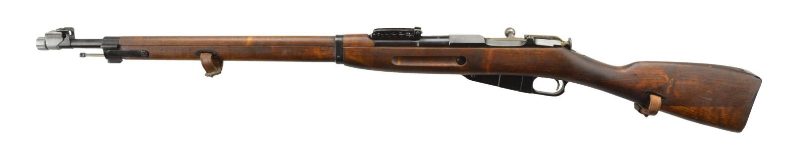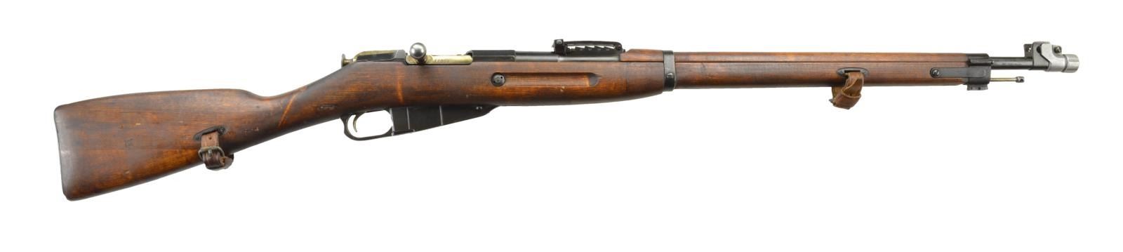 ACTION RIFLE. Cal 7.62x54R. S #86031. Bbl. 27" import marked on right side. S # matches on bolt body, floorplate mismatch as-is typical and buttplate unnumbered. Top of Bbl. marked with a Tikka triangle logo, S # and 1939 date. Left side of Bbl. marked with a boxed "S.A." army stamp. Hex receiver. Straight bolt handle. Ladder rear sight graduated to 3200 Arshins. Protected front blade sight. Cleaning rod present. Leather sling loops also present in sling loops. Hardwood stock set with 2 / piece finger joint construction ahead of rear band and spliced construction on butt. Stock marked with a Finnish "L" cartouche. UNATTACHED ACCESSORIES: unmarked muzzle cover. CONDITION: stock set has a couple small circular Finn repairs, a few light dings and handling marks. Metal retains 95% original blue with some light high edge wear, a couple small spots of light pitting on receiver and minor freckling on magazine body. Very good shiny bore. A very nice late production M27. (22-2597/MJC). CURIO. $200-300.