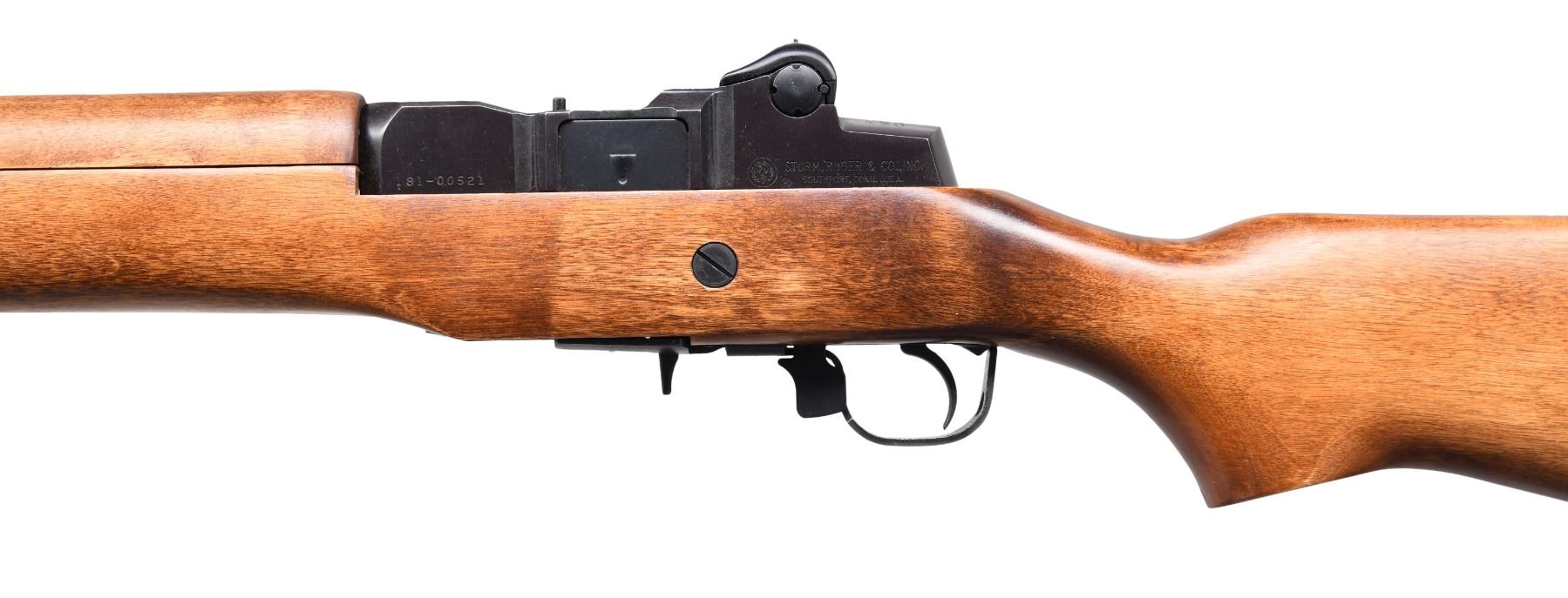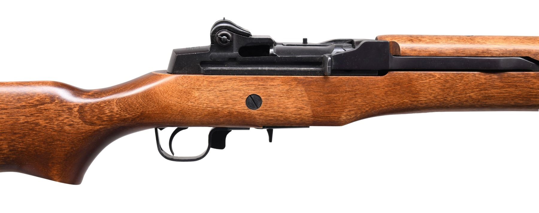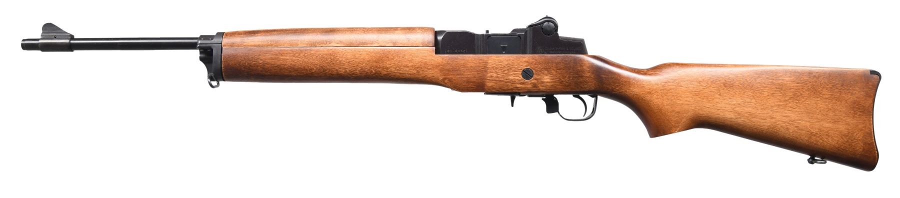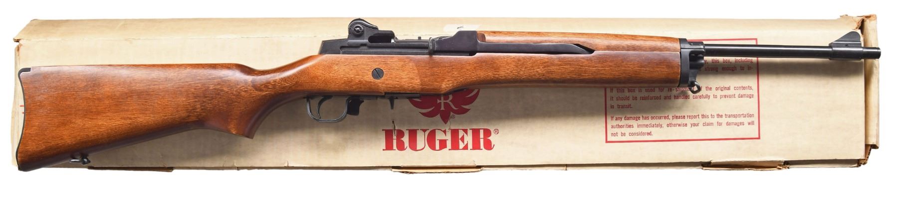 FACTORY BOX, FORMER HENRY RODESCHIN COLLECTION. Cal. 223 Rem. S# 181-00521. Bbl. 18 1/2". Mini-14 semi-automatic rifle mfg. by Ruger in 1977. Left side of the receiver is marked with the S# and Ruger's mfg. information, with "RUGER/ MINI-14/ CAL..223" marked over the top of the receiver at the rear. Metal components exhibit a blue finish overall. Plain wood pistol grip buttstock with smooth wood handguard. Blade front sight with black enamel-finished aperture rear sight. MAGS: 1 5-rd. UNATTACHED ACCESSORIES: factory box handwritten with the S# in pen on the left lid flap. CONDITION: excellent, with metal components retaining bountiful amounts of their original factory finish overall, showing few light superficial handling marks, and some very light wear on the bolt and receiver from cycling of the action. Mirror bore, exhibiting well-defined rifling throughout. Wood furniture is excellent overall. Box shows age-related discoloration with tearing and moderate wear overall. PROVENANCE: Amoskeag Auction Company, Auction #136, Lot 1420. (23-6747/MLW). MODERN. $600-1,000.