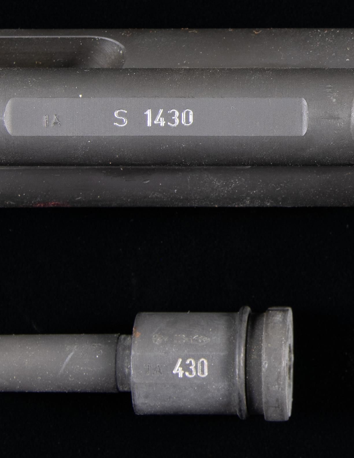 SUB-CALIBER (.22 LR) CONVERSION KIT. G3 sub-caliber conversion kit mfg. by Heckler & Koch in 1980. Kit consists of a .22 Caliber bbl. insert, bolt assembly, 2 .22 LR mags. and a standard G3 cleaning kit. Bolt assembly and bbl. insert exhibit a phosphate finish and are marked with an "IA" (80) date code. Mags. exhibit a gray enamel type finish. Full S# "S 1430" is marked on the bolt, with the bbl. insert matching via "430". 1 mag. is marked "7.62x51/ HI", with both mags. .22 LR inserts exhibiting a "8/3/78" date. Kit is housed within an original green painted wood case, with wool padded panels on the interior. Kit is complete with a sheet of wax paper and a "SUBCALIBRE CONVERSION KIT/ RIFLE G3" marked manual. CONDITION: kit is excellent, with the bolt assembly and bbl. insert exhibiting some light superficial handling marks, as well as a couple of spots of light surface oxidation. Brilliant mirror bore, exhibiting well defined rifling throughout. Exterior of case shows scattered marks and scratches from handling and storage, with scattered spots of mildew. Metal fittings on case show some wear and flaking, with a few spots of surface oxidation. An excellent example of a Heckler & Koch G3 sub-caliber conversion kit. (02-24596/MLW). $600-1,000.