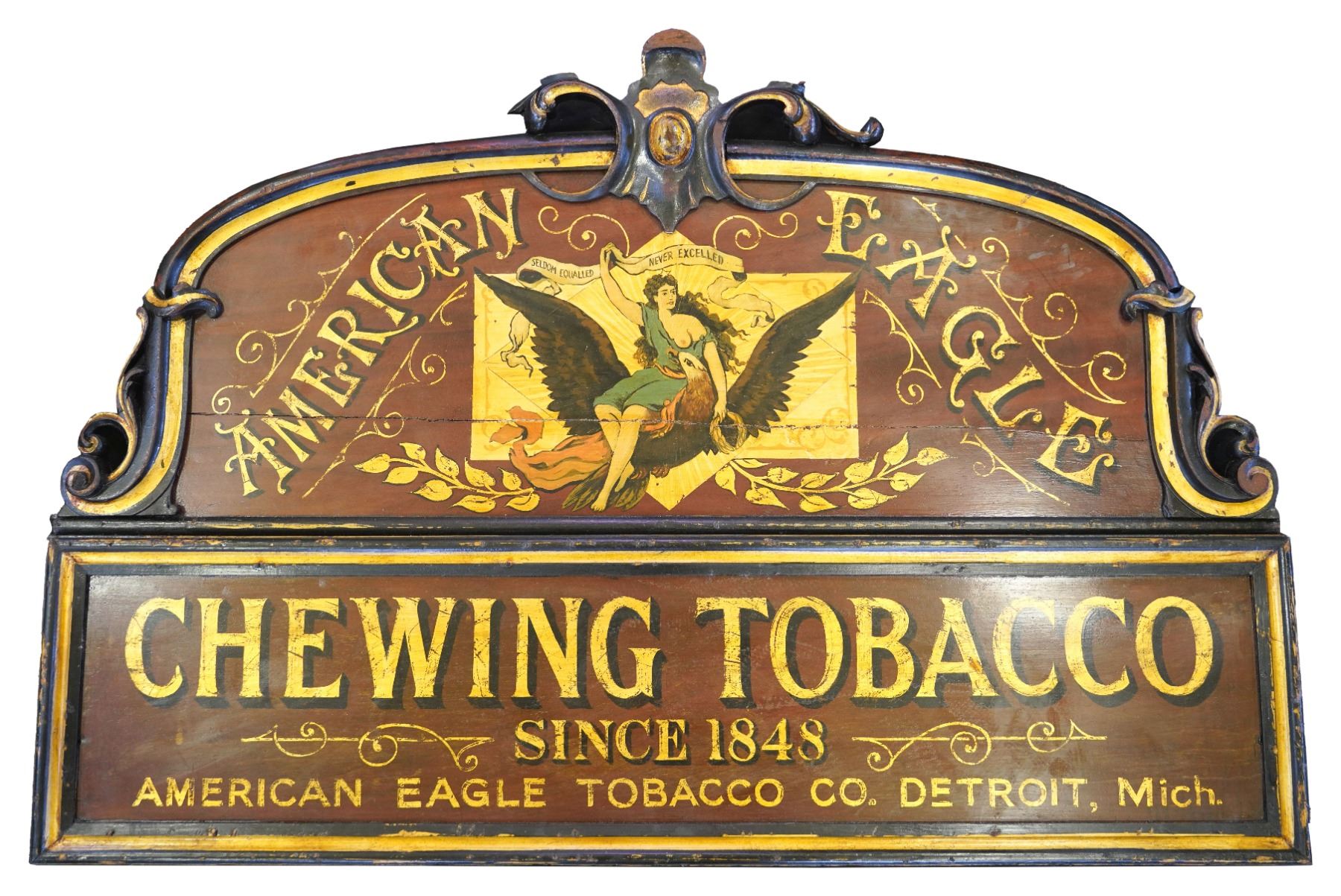 This fine 40 ½" x 28" example of a tobacco company's trade sign combines both hard and soft woods to achieve an artistic panel that further enhances the exemplary painting skills. The top half of the sign has flowing artistic scrolling at the edges with a flourish at the top. The top reads "AMERICAN EAGLE" with a central vignette depicting a woman, with one breast exposed, riding an eagle. There is a ribbon in the woman's right hand that reads "SELDOM EQUALED NEVER EXCELLED". The bottom half of the sign reads "CHEWING TOBACCO / SINCE 1848 / AMERICAN EAGLE TOBACCO CO, DETROIT, Mich." All of the lettering and some of the decorative highlights are gold leaf with black edging. The gold leaf combined with the deeply colored wood grain and the central painted motif blend to achieve a stunning overall impact. CONDITION: The gold leaf is a bit worn in spots and the painted surfaces have some craquelure showing. There is a tight crack horizontally at the lower third of the top panel. Structurally the sign is quite stable and sound. (02-23515/BF). $2,000-3,000.