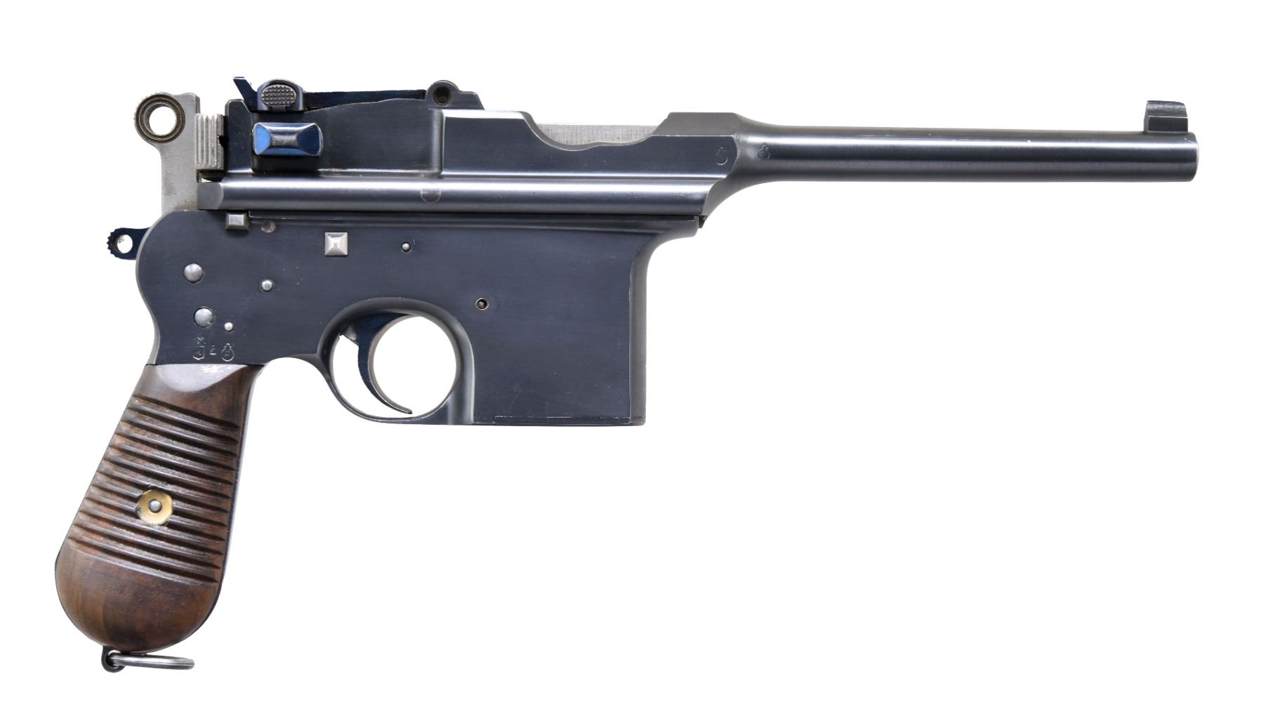 Cal. 7.63mm. S# 26445. Bbl. 5 1/2". Model 900 semi-automatic pistol mfg. in Spain by Astra and subsequently shipped to "Dept. of Defense, Euzkada" on January 19th of 1937, according to "Astra Firearms and Selected Competitors" by Leonardo M. Antaris. The left side of the sideplate is marked "ASTRA AUTOMATIC PISTOL CAL 763/ PATENTED JULY.12.1928/ Unceta y Compania GUERNICA ". Left side of the frame is marked with the S#, with Spanish proofs marked on the right. Right side of the bbl. extension and bbl. exhibit a Spanish "P" within an ordnance bomb proof. Metal components exhibit a blue finish overall, with some small parts including the trigger, safety lever, extractor, rear sight slide, and bolt stop exhibiting a nitre blue finish. Bolt is polished in-the-white. Interior of frame and sideplate are jeweled in-the-white. Frame is mounted with 2-piece grooved wood grips. Fixed blade front sight, with V-notch tangent rear sight, graduated 50-1,000. All serialized parts are matching and include the frame (left side and with the last 3-digits marked beneath the left grip panel), sideplate, floorplate, follower, closing block stop, travel limiting pin, bbl. / bbl. extension, rear sight assembly, bolt stop, locking block, bolt, as well as the grips. CONDITION: excellent, with metal components retaining bountiful amounts of their original factory blue finish, exhibiting some spots of light edge wear, a few light superficial handling marks, as well as a few spots of light surface oxidation. Nitre blue parts are very good overall, with some areas of light to mild wear and thinning. Front face of the trigger shows wear and thinning through to gray patina. Mirror bore, exhibiting some light to mild pitting, while retaining well defined rifling throughout. Grips are very good overall, with a few superficial marks from handling and storage. An exceptional Astra Model 900 semi-automatic pistol. PROVENANCE: Lifelong Collection of Bill Peterken. (24-6236/MLW). CURIO. $2,500-4,000.