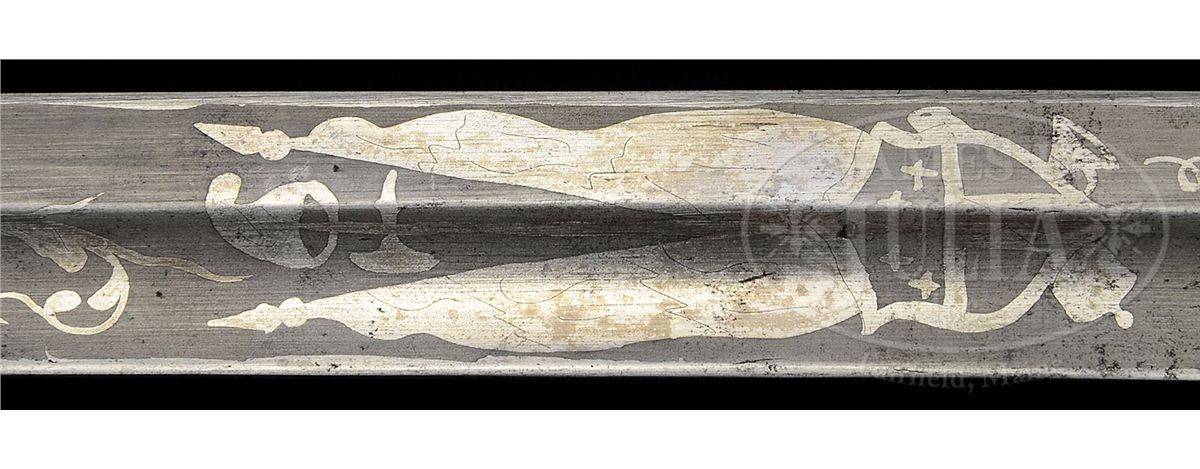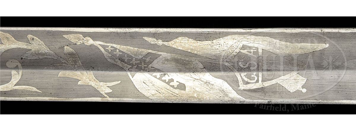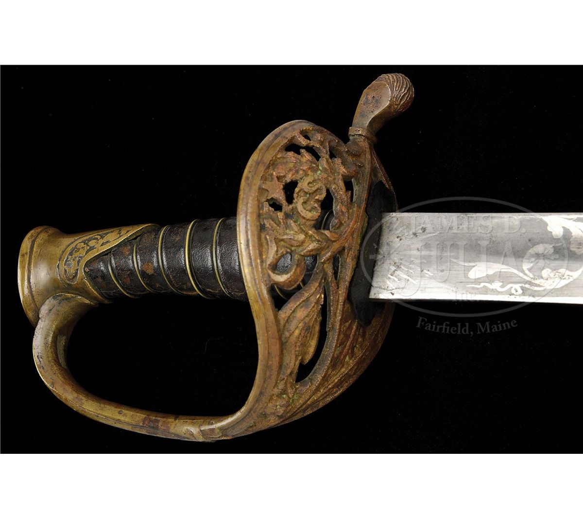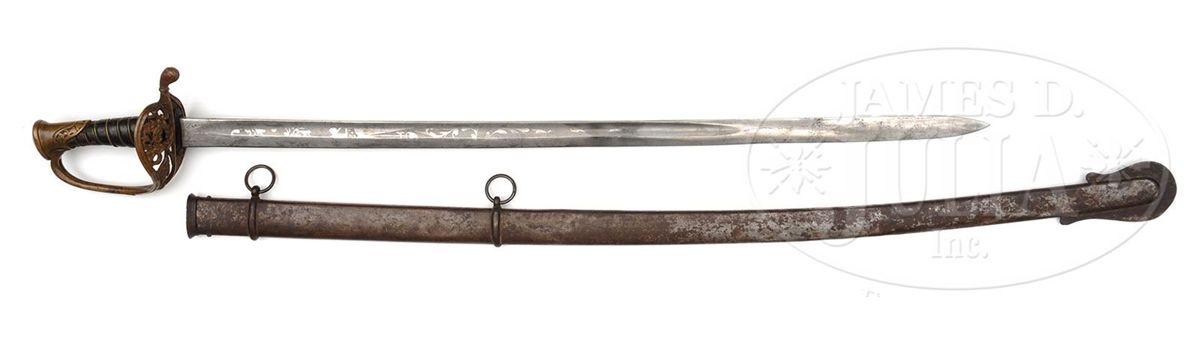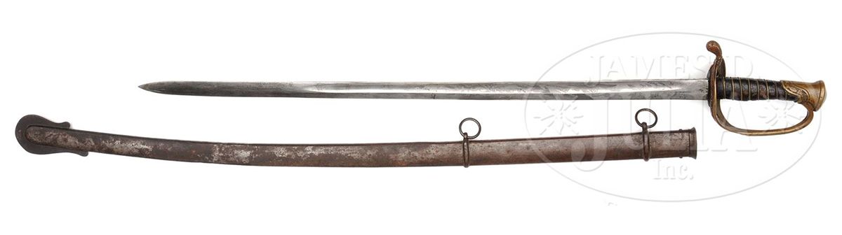 You will never find a better etched blade on this pattern. Etched panels are about 15" long and exhibit most of their orig luster. Etched panels include panoply of arms which include Confederate battle flag and shield with "CSA". The hilt is also in excellent condition with a fine patina and a well-cast "CS" and star in hilt. Grip retains all its orig leather and wire. Scabbard accompanying this sword, that has protected this excellent blade all these years, is from a regulation enlisted model 1833 U.S. Dragoon. This cataloger saw this sword and scabbard, along with a Confederate Bowie knife which is being offered as the next lot, orig in the Pacific Northwest 30 years ago. The purported history was that they were trophies brought back by Union soldier, which I have no doubt is true. These objects have not been offered before. CONDITION: 29-1/2" blade is bright/white with scattered areas of staining and pitting. There is a small burr at the point on this sword. Quillon is bent up slightly on sword. Protective washer is mostly intact though dry and chipping, as can be seen in photos. Leather grip is complete and retains much of its orig black dyed color, though scuffed and worn at high areas. Scabbard is brown/gray with scattered areas of stain and pitting. There appears to be a war-time era soldered repair along seam about 1' from drag. Drag is inspected "WS" and "M.P.L. - ORD." 4-48877 JS10