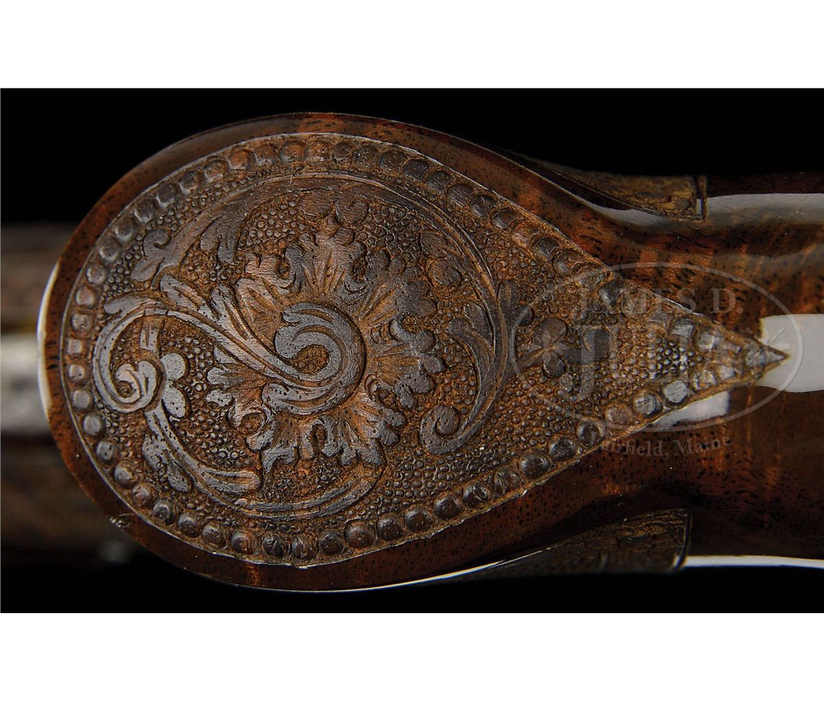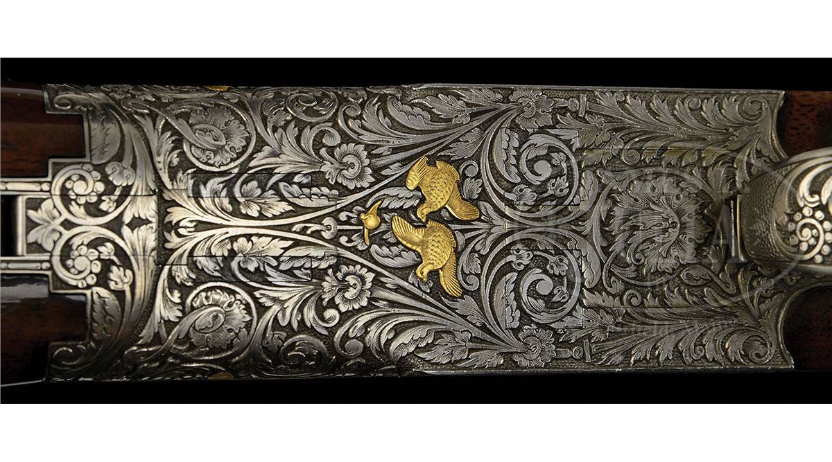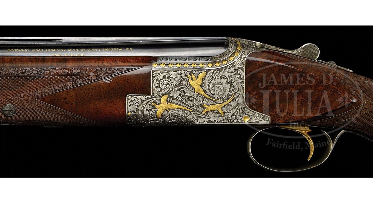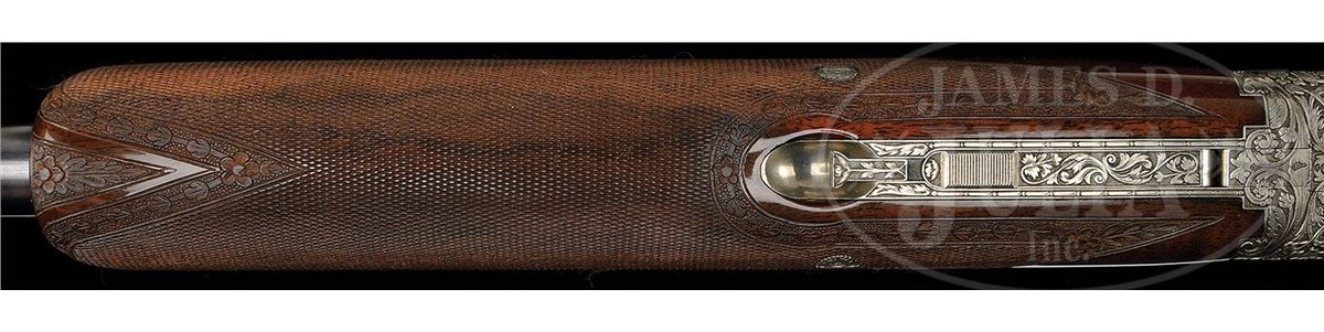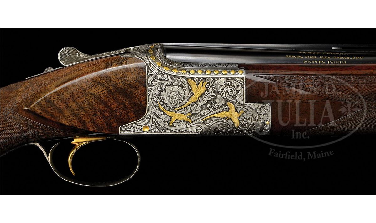 SN 2522S71. Cal. 12 ga. 2-3/4" Chambers. This unique gun embodies all the finest work available from the factory, starting with finely polished 26-3/8" ventilated rib bbls, choked "Skeet" and "Skeet", gold inlaid with "BROWNING ARMS COMPANY MORGAN, UTAH & MONTREAL P.Q." and "MADE IN BELGIUM" on left side top bbl and "BROWNING SUPERPOSED" "SPECIAL STEEL 12 GA. SHELLS - 2-3/4"" and "BROWNING PATENTS" on right. Coin finished action is fitted with specially filed, checkered, and gold-plated single selective trigger. Action is engraved and gold inlaid by two of Browning's most highly regarded engravers, in a design executed by Andre Watrin pictured on p. 223 of THE BROWNING SUPERPOSED by Ned Schwing, and captioned "This Watrin sketch was executed on November 16, 1962, and illustrates an almost perfect blending of scroll and birds in an imperceptible motion of swirls and flowers. This design is art in its purest form." (This sketch is in the FN archives.) On this particular gun the exceptionally well cut, deep relief, floral scroll is by "J. Baerten" whose signature appears at bottom rear right side of action. The finely sculpted and detailed swooping pheasants are by Louis Vranken whose signature is on bottom rear of left side of action. The only place in which engraving on this gun departs from the Watrin sketch is that the birds on bottom of action are quail instead of pheasants. The flushing pheasant on trigger guard bow is in the original design. Very fine stump figured claro walnut long tang, square knob buttstock measures 14-3/8" over Browning composition buttplate. The fine point pattern checkering at grip is bordered by nicely carved, small fleur-di-lis with floral highlights. Bottom of grip is also low relief carved with floral accented, scrolled acanthus in stippled background. Matching rounded field forend has some floral carving at tip. Drop at heel: 2-5/16", drop at comb: 1-7/16". Weight: 7 lbs. 0 oz. LOP: 14-3/8". CONDITION: Excellent. Wood and metal retain essentially all of their fine factory finishes. Bbls have some slight marks mostly from contact with forend. Coin finish of action is slightly darkened. Stocks have a few minor marks and light scratches, most noticeably on left side along sharp edges of side panels, and a little fingernail size compression at rear of checkering of forend. Bores are excellent. Mechanics crisp. 4-49110 MGM303