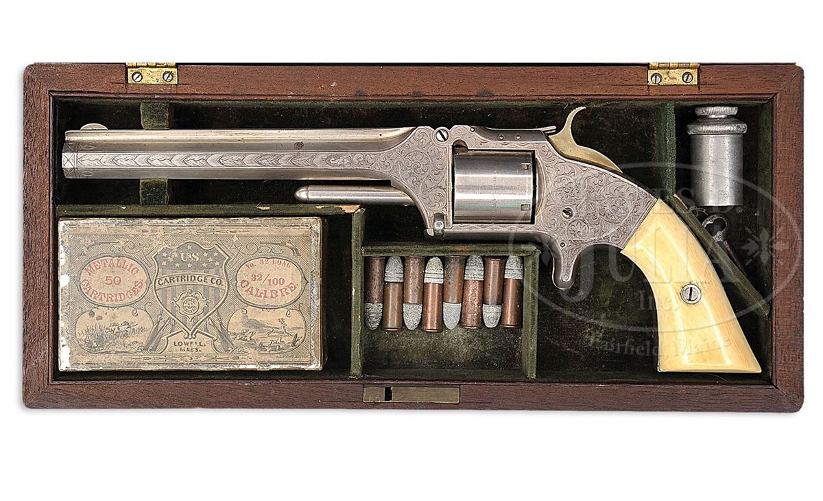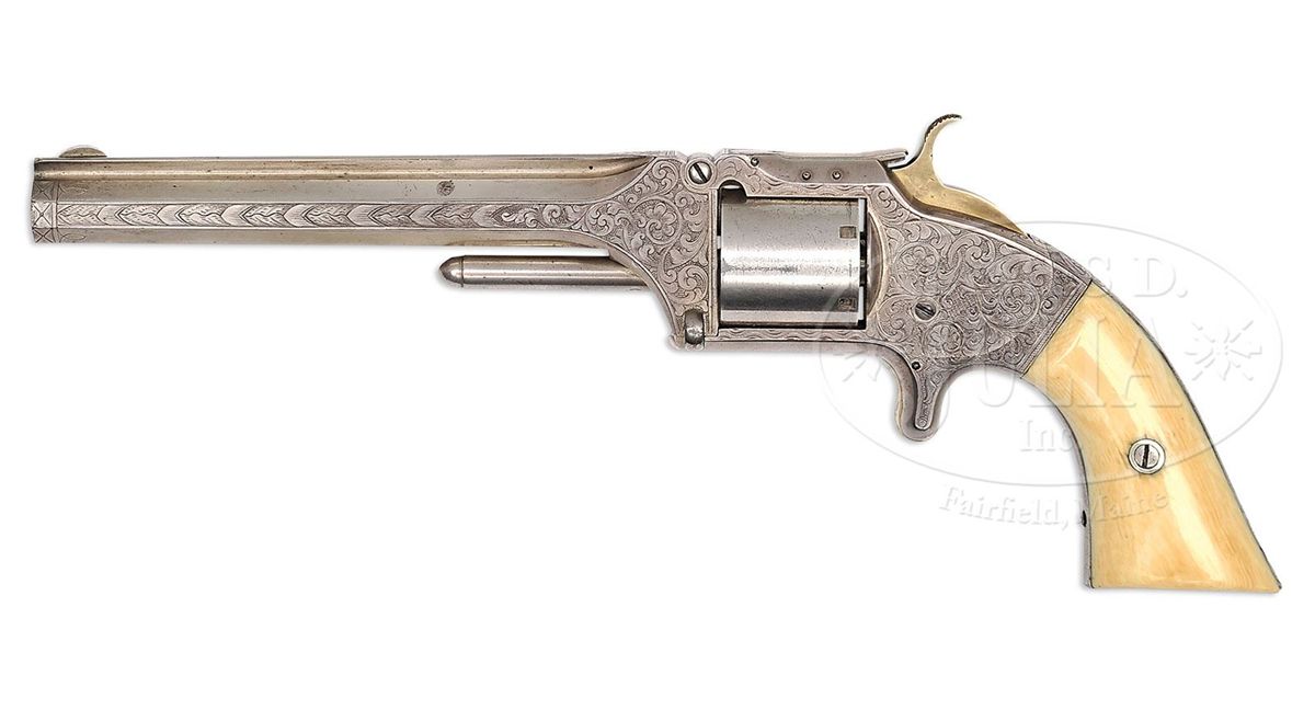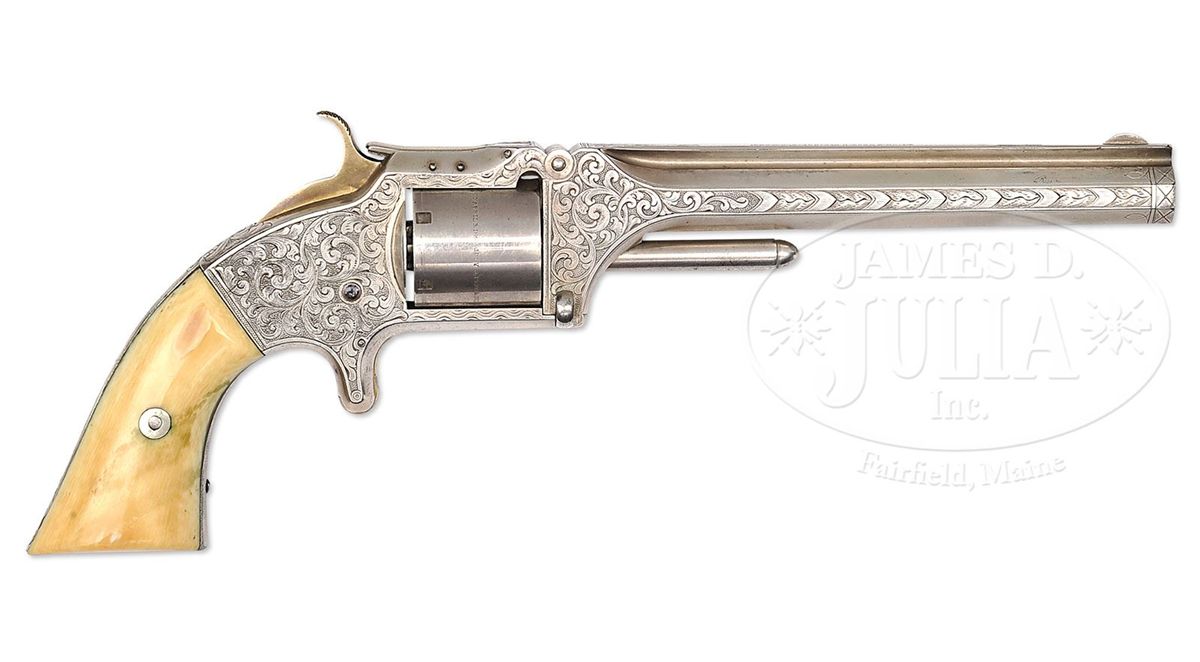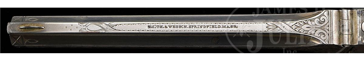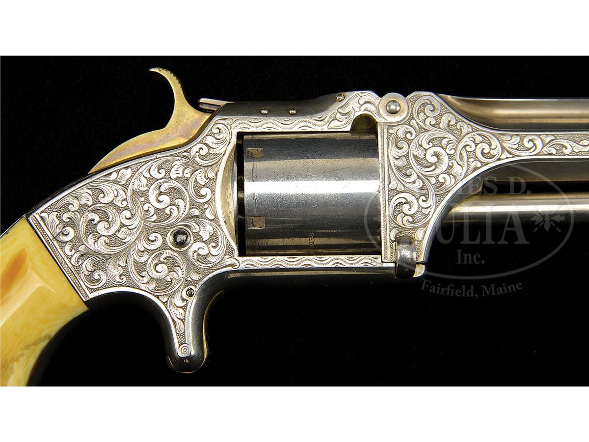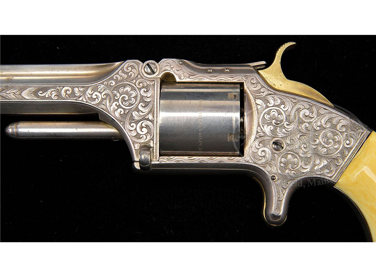 SN 31035. Cal. 32. This is an exceptional example of the popular Civil War Smith & Wesson army revolver with 6" bbl. Based on serial number and factory letter this gun was shipped in March 1865. Roy Jinks continues to state in factory letter that engraving is typical and most likely performed by Nimschke who engraved many Smith & Wesson revolvers and the letter "D" on the bottom of the bbl indicates a high level of coverage. This gun exhibits ivory stocks, gold trigger and hammer and the engraving is full coverage to frame and bbl on side flats. This gun retains almost all of its original silver finish and is as fine an example as you will encounter with orig mahogany green velvet lined case with original decorated cartridge pack containing about twenty-five cartridges, and a pewter oiler. PROVENANCE: Marlan Polhemus Collection. CONDITION: Gun retains about 98% + of its orig silver finish on frame, cylinder and bbl with minor staining. Hammer retains most of its original gold finish. Maker and patent marks on bbl flat and cylinder are crisp and easily read as are serial numbers. Ivory grips are sound and solid and well fitted with good yellow patina. Mechanically gun functions well with crisp rifling to bore. 4-48718 JS77