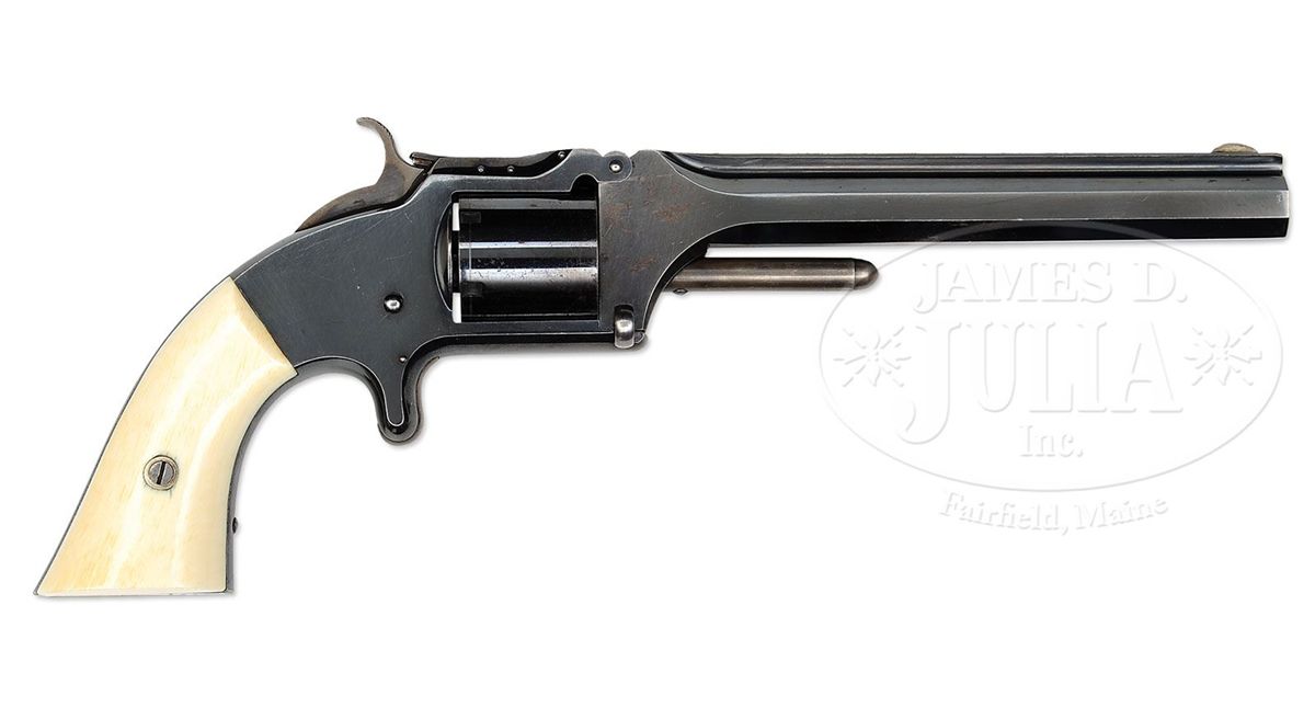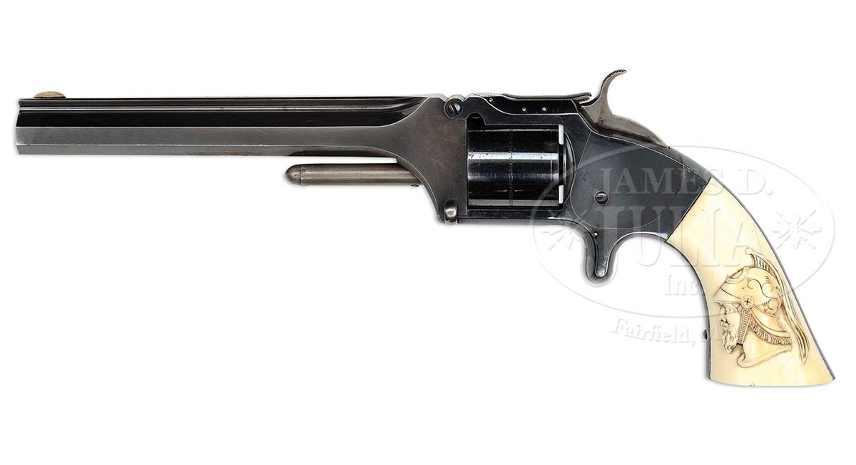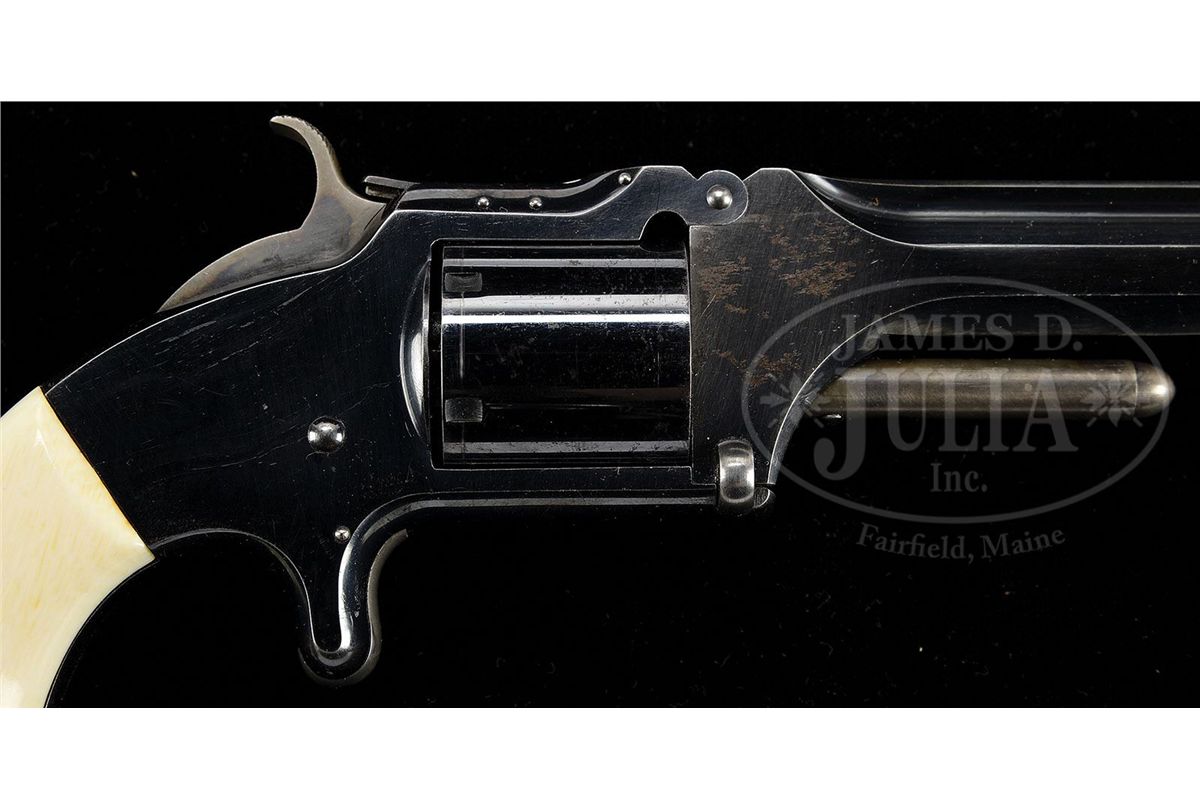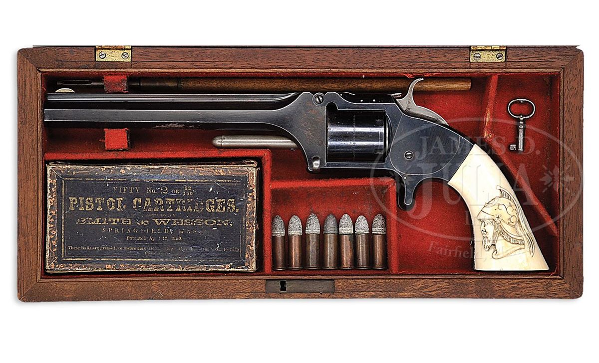 SN 10121. Cal. 32. This is an exceptional example of the popular Civil War Smith & Wesson army revolver with 6" bbl. Based on serial number and factory letter this gun was shipped on March 2, 1863 with ivory grips and delivered to J.W. Storrs in New York City where it was cased. This gun retains almost all of its original finish and is as fine an example as you will encounter especially with these rare relief carved ivory stocks of helmeted soldier from antiquity. It shows vivid case colors on the hammer, trigger and ejector rod. Factory casing with red wool lining with some original cartridges and a rare empty Smith & Wesson Civil War era cartridge box with a black label with gold lettering which originally held 50 cartridges. Also included is a rare cleaning rod and a functioning case key. The gun has matching assembly numbers, and the SN is written on the inside of ivory grip with old brown ink. PROVENANCE: Marlan Polhemus Collection. CONDITION: Gun retains about 95% + orig bright blue finish on frame, cyl and bbl with minor staining. There is about a 1-1/2" area on bottom of bbl where finish is missing and metal is brown/silver. Maker and patent marks on bbl flat and cylinder are crisp and easily read as are serial numbers. Ivory grips are very fine with one tiny nick on left side at edge below portrait. Mechanically gun functions well with crisp shiny rifling. Casing is sound and solid. Orig cardboard box for cartridges is worn and scuffed and broken at seams it is however complete and it could be easily repaired. Box has marbled sides with black and gold pasted label that is complete though scuffed losing some of the letters as can be seen in photos. 4-48719 JS75