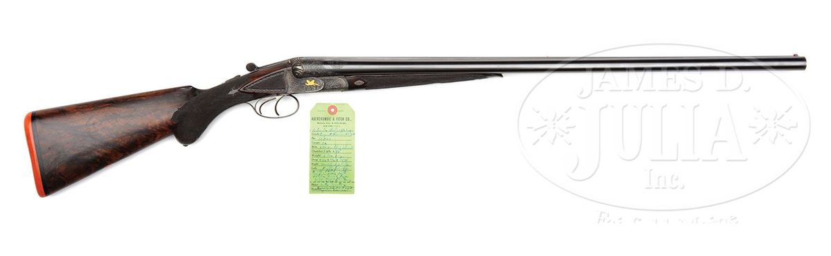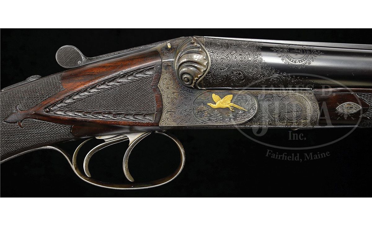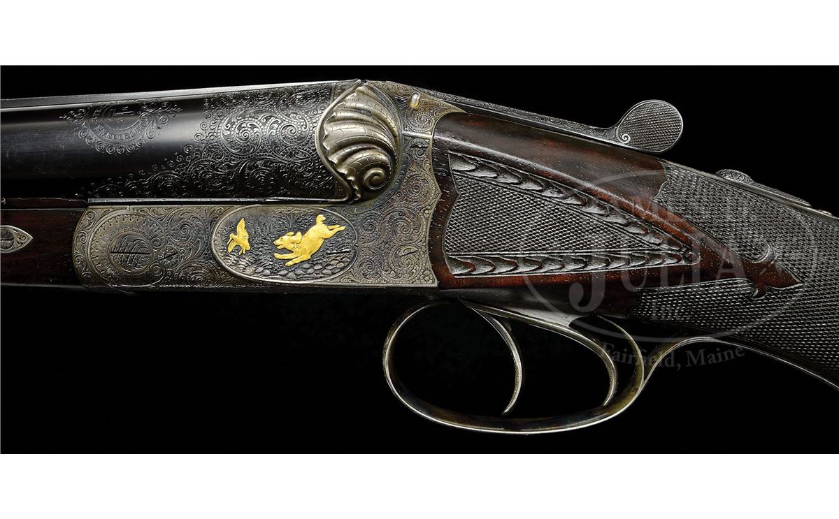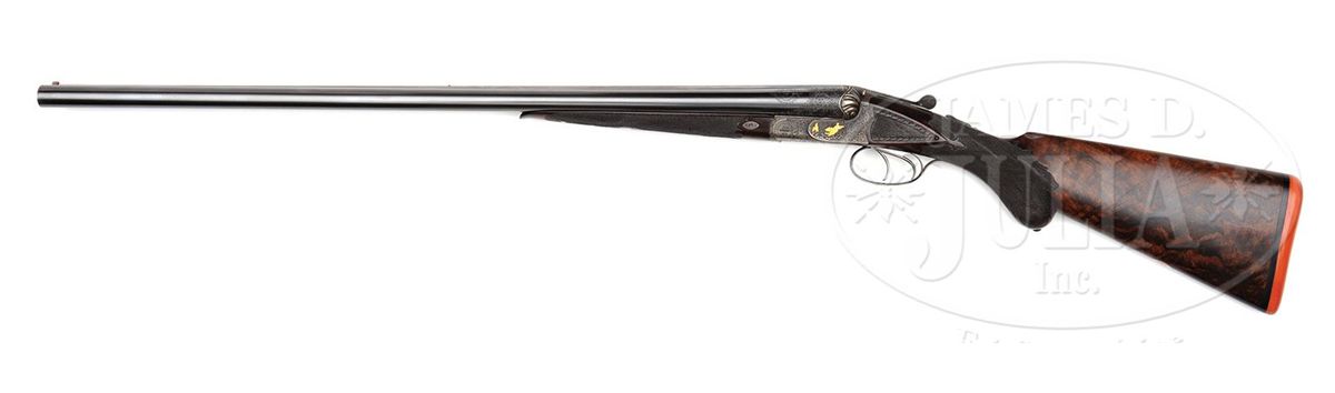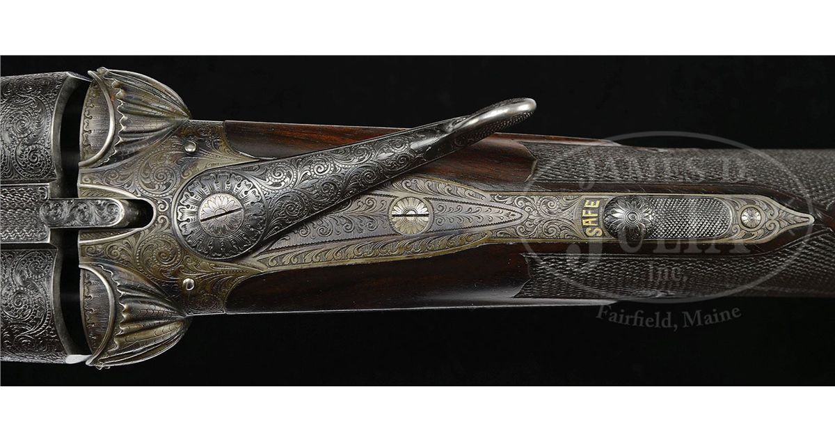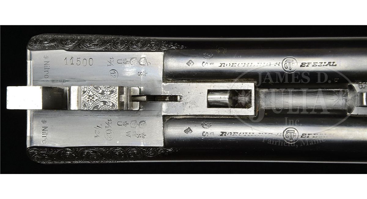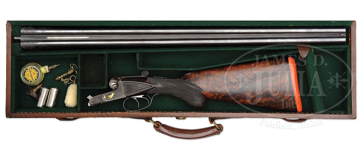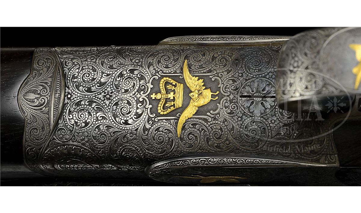 SN 11500. Cal. 12 ga. 2-3/4" Chambers. 28" Dovetailed bbls with raised, concave, matted game rib are fitted with Bradley red bead front and King red bead mid sights, and are gold inlaid "Charles Daly Regent Diamond Quality" in unmatted portion of rib. Breech portion of bbls are engraved for 2-1/2" with exceptionally well cut, large, shaded, open scroll as base for scroll bordered logos for Rochlings Spezial - Steel. Bbl flats are stamped with German nitro proofs for 12 ga. with a proof date of 7/24. Bottoms of bbls are stamped with provisional proofs, steel logos, and left bbl with SN. Case hardened, scallop-backed action, stamped "PRUSSIA" on water table, features intercepting sears, pin type cocking indicators, side clips, square crossbolt third fastener, and automatic safety (SAFE inlaid in gold). Triggers are nickel-plated, blades checkered. Action is engraved with scroll, matching that on bbls, at nearly full coverage, framing oval vignettes of birds and dog relief inlaid in gold. A pheasant flies through woodlands on right side of action with spaniel flushing woodcock on left. A duck surmounted by a sovereign's crown, is flying toward viewer on bottom of action. A pair of snipe fly over marshland on trigger guard bow. Fences are beautifully carved in coiled shell motif. "Charles Daly" is in arched fields behind fences. SN is engraved on trigger guard tang. Intricately marbled and well figured European walnut round knob, semi-pistol grip buttstock measures 14-1/4" over Silver pad. Side panels have broad chip carved borders to central checkering. Fleur-di-lis termination extends into checkering with fancy border. A small oval piece of horn with raised teat is inlet into bottom of grip. A gold oval on toe line is engraved "G. P." Matching splinter ejector forend has inlet horn schnabeled tip and Deeley release. Bore diameter: left-.724, right -.726. Bore restrictions: left -.045 (Extra Full), right -.048 (Extra Full). Wall thickness: left -.032, right -.030. Drop at heel: 3-1/16", drop at comb: 1-5/8". Weight: 6 lbs. 3 oz. LOP: 14-1/4". English type leather case with brass corners and single lock, has small inset leather rectangle gold embossed "G. P." on top. Interior is lined with dark green cloth and contains walnut and brass 2-pc cleaning rod with mop, jag, and Turk's head, pair of snap caps, and two keys. PROVENANCE: Green A & F hang tag outlining features of this particular gun is affixed to trigger guard. CONDITION: Excellent. Bbls retain 95% orig blue with some slight marks, notably two 6" from muzzle on right bbl, and some scattered freckling. Action retains 80 - 90% orig case hardening color, silvered around bottom and beads from normal carrying and wear. Trigger guard tang is silvered. Forend latch is darkened. Stocks retain most of their orig finish, which is somewhat dry and has some minor handling marks. Checkering is dark, with some slight wear. Bores are excellent, bright, smooth, and shiny. Action is tight. Bbls are on face. Ejectors are strong, and in time. Case leather has darkened, but is smooth. There are a few rubs on corners and edges. A portrait of a dog has been scratched into top. Straps are good. Handle is detached on one end. Interior cloth is fine with some areas rubbed through. Accessories are good. A good clean example of this fine, highly sought after, gun.ÊÊ 4-47868 MGM47