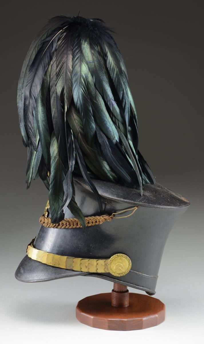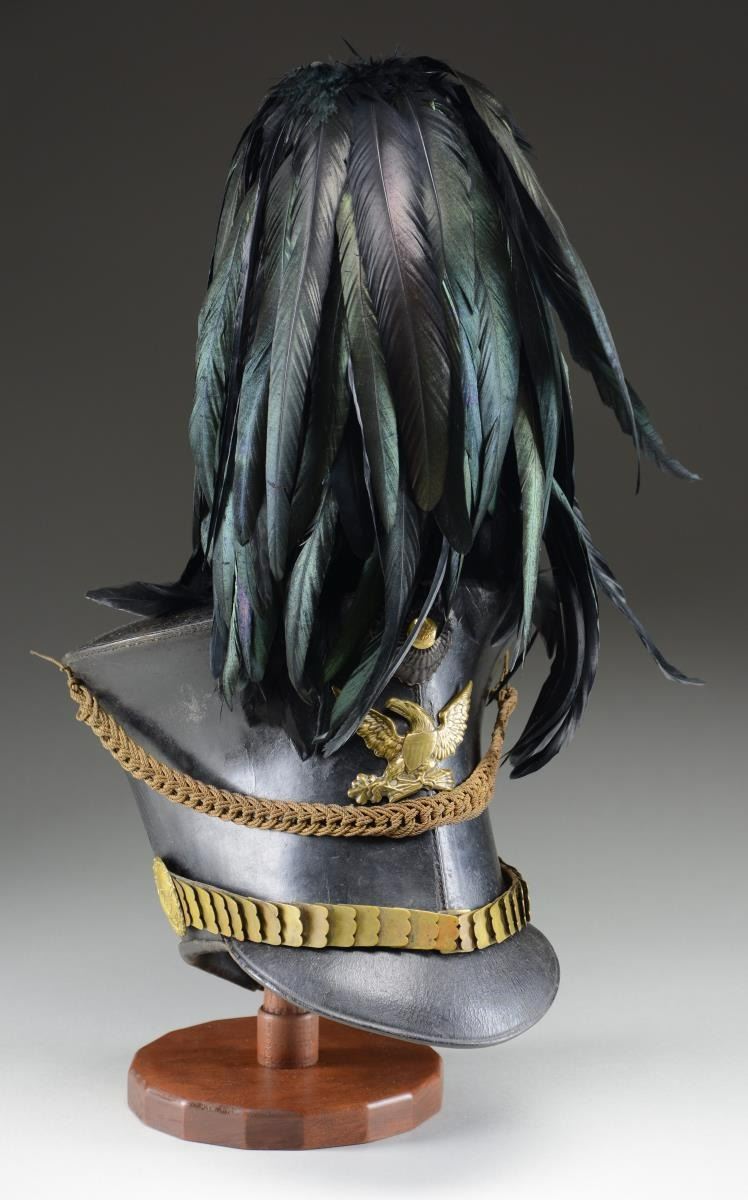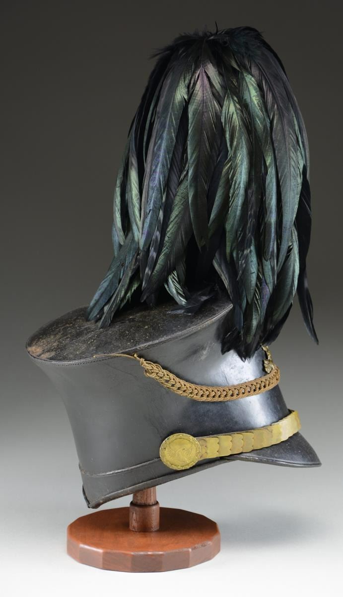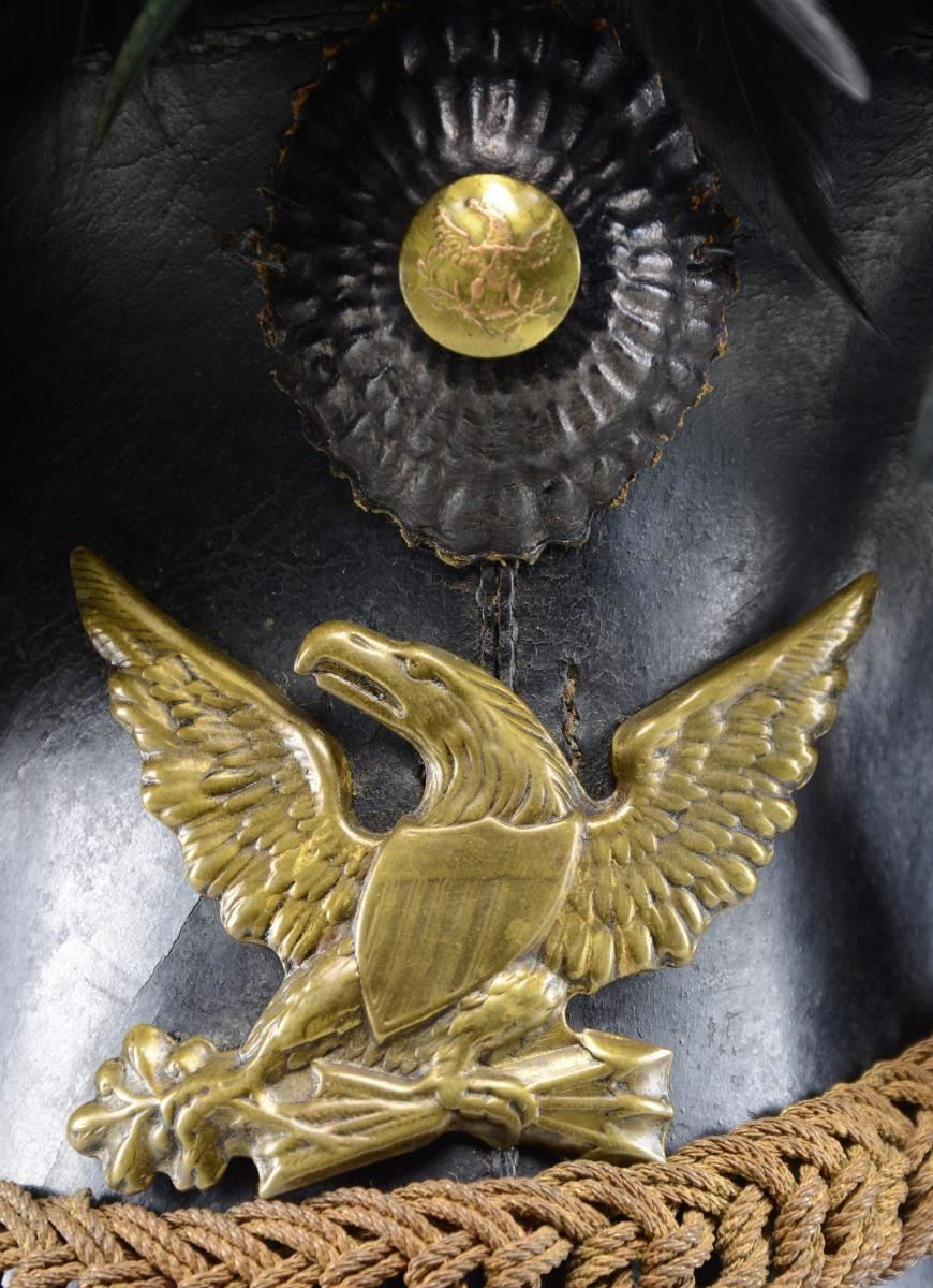 ARTILLERY "TARBUCKET" HELMET. This helmet stands approx. 8" high without the plume and 17 1/2" high with the plume. Width at the crown is 9 1/2". The helmet is made of black leather throughout. It has an articulated brass scaled chinstrap with eagle in wreath side posts. There is a gold bullion cord that runs from the top left to the top right and hangs under the M1821 eagle on the front of the helmet. Above the eagle is a round leather cockade with a central 16mm, 1-piece eagle "A" button. The interior of the helmet has a faux black leather sweatband. The interior rear of the helmet has an assembly mark that reads "73/6", and an ink mark in the crown that appears to show a script "J" followed by a "0". The replacement plume is made of black Carolina gamecock tail feathers. CONDITION: helmet is quite solid and shows no flexing or flaking. Sweatband is complete down to the sizing cord. Insignia is original & correct, as well as undamaged. The plume is a replacement but compliments the helmet very well. (02-20149-1/BF). $2,000-2,500.