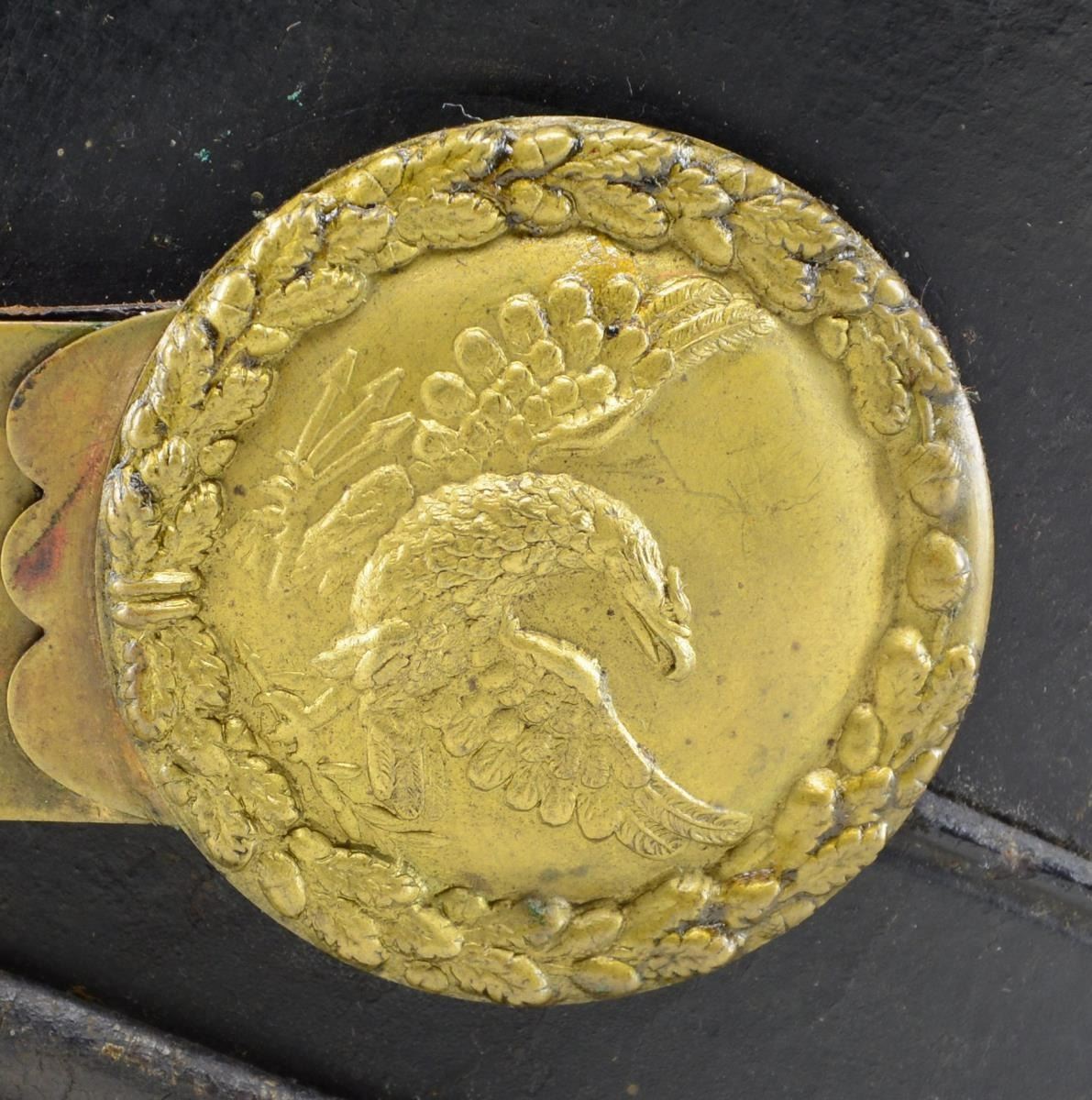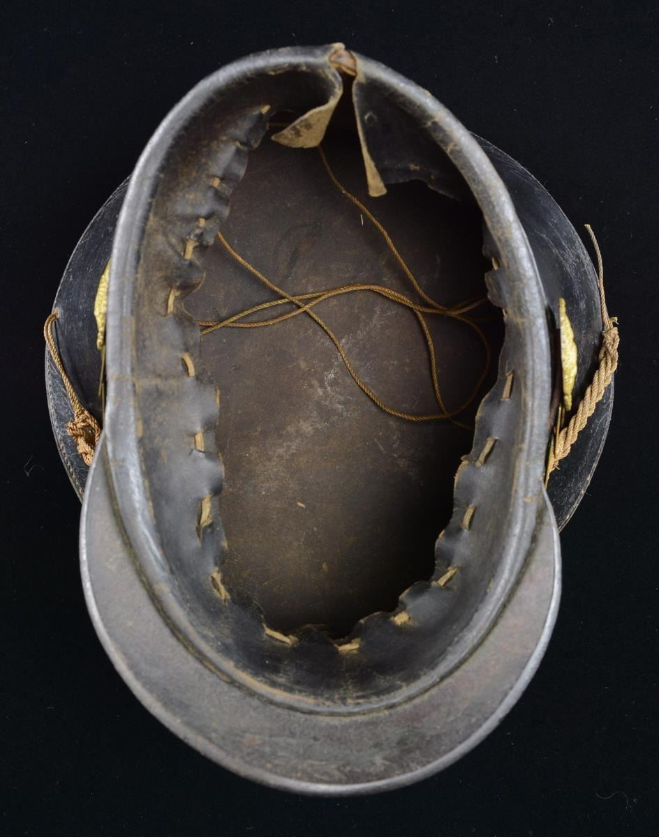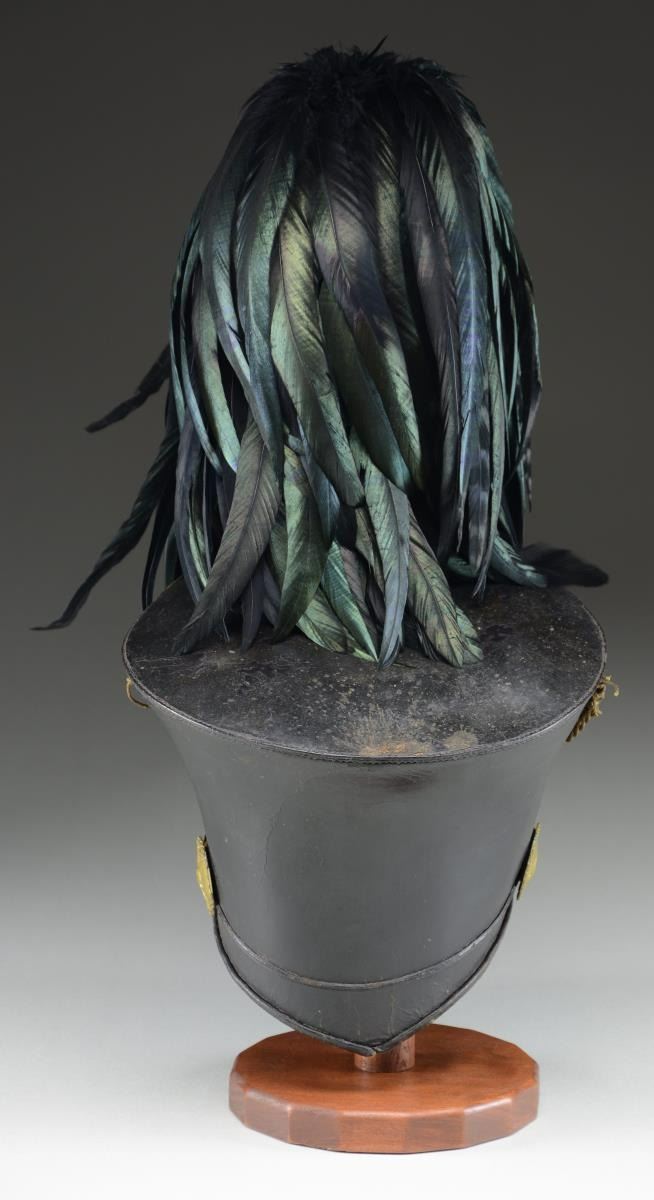 ARTILLERY "TARBUCKET" HELMET. This helmet stands approx. 8" high without the plume and 17 1/2" high with the plume. Width at the crown is 9 1/2". The helmet is made of black leather throughout. It has an articulated brass scaled chinstrap with eagle in wreath side posts. There is a gold bullion cord that runs from the top left to the top right and hangs under the M1821 eagle on the front of the helmet. Above the eagle is a round leather cockade with a central 16mm, 1-piece eagle "A" button. The interior of the helmet has a faux black leather sweatband. The interior rear of the helmet has an assembly mark that reads "73/6", and an ink mark in the crown that appears to show a script "J" followed by a "0". The replacement plume is made of black Carolina gamecock tail feathers. CONDITION: helmet is quite solid and shows no flexing or flaking. Sweatband is complete down to the sizing cord. Insignia is original & correct, as well as undamaged. The plume is a replacement but compliments the helmet very well. (02-20149-1/BF). $2,000-2,500.