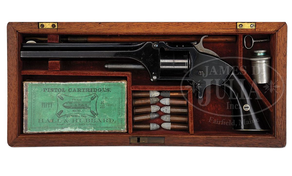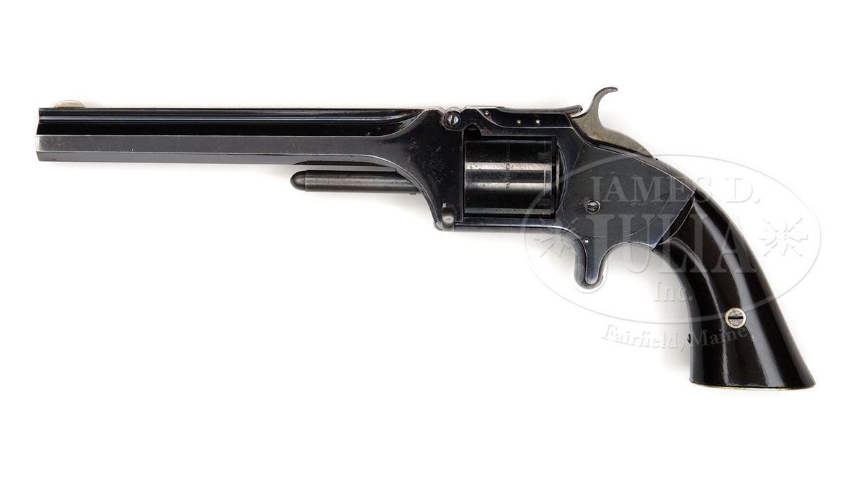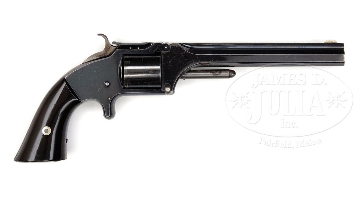 SN 15074. Cal. 32. This is an exceptional example of a cased and inscribed Civil War Smith & Wesson army revolver with 6" bbl. Based on serial number this gun was made around November 1863 and would have been presented by his men prior to his untimely death in November 1864. This gun retains almost all of its original finish and is as fine an example as you will encounter especially in factory presentation casing with silver presentation plaque on butt. Case colors are on the hammer, trigger and ejector rod. Our consignor states "The original factory mahogany case supplied by M. W. Robinson has red velvet lining (excellent condition); with rare cleaning rod for the No. 2; a green labeled cardboard cartridge box for .32 Cal. long R. F., by Hall & Hubbard, a successor to Smith, Hall, Buckland and manufactured under the S&W patent of April 17, 1860; a pewter oiler; and ten loose cartridges with dished heads indicating early S&W manufacture." All assembly numbers match, and SN is stamped under grip. Captain Lennon joined the 77th in October 1861 and was promoted to Lt. in November 1861. He along with his regiment saw much action with the Army of the Potomac being involved in the battle of the Peninsula Campaign and the seven days before Richmond, Antietam, Malvern Hill, Fairfax Courthouse, Fredericksburg, Chancellorsville, Gettysburg, the Wilderness, the "Bloody Angle" at Spotsylvania, Cold Harbor, Petersburg, and Fort Stevens. Lennon now promoted to Captain was involved in Sheridan's Shenandoah Valley campaign in 1864 where he fought in the battles around Winchester, Fisher's Hill and at Cedar Creek where he was severely wounded on October 19, 1864. This was the date of Sheridan's famous ride. He died from his wounds November 1, 1864. This gun is pictured along with detailed history in The American Society of Arms Collector's Bulletin No. 93 2006. This publication along with a large archive of research and some original materials accompanies this lot. Included in this group are two B&W photos of Lennon as a 2nd Lieut. & Captain. PROVENANCE: Mario Marinetto Collection, David Burghoff Collection, Marlan Polhemus Collection. CONDITION: Gun retains about 99% of its original bright blue finish on frame, cyl and bbl with some scratching on right side of frame. Maker and patent marks on bbl flat and cyl are crisp and easily read as are serial numbers. Rosewood grips are very fine retaining almost all their original varnished finish. Mechanically gun functions well with crisp shiny bore. 4-48735 JS76