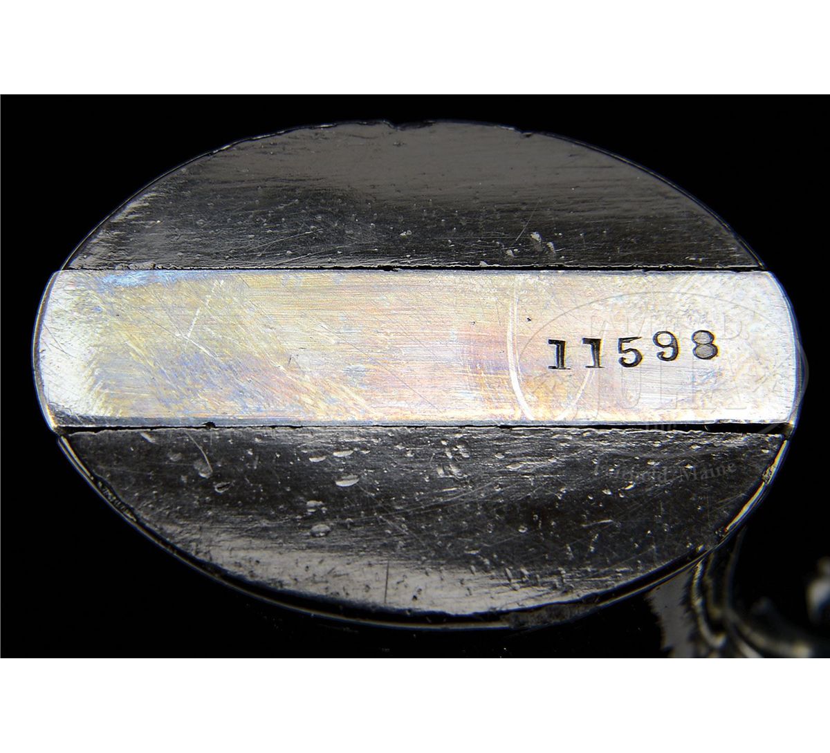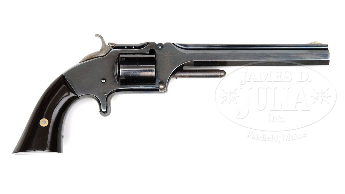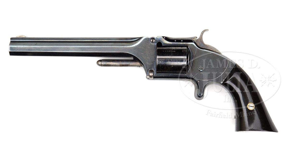SN 11598. Cal. 32. This is an exceptional example of the popular Civil War Smith & Wesson army revolver with 6" bbl. Based on serial number this gun was made early in the war in 1862. This gun retains almost all of its orig finish and is as fine an example as you will encounter. It shows strong case colors on the hammer, trigger, and ejector rod. The gun has matching assembly numbers, and the SN is stamped on the inside of the grip. PROVENANCE: Marlan Polhemus Collection. CONDITION: Gun retains about 98% of its orig bright blue finish on frame, cylinder and bbl with minor staining. Maker and patent marks on bbl flat and cylinder are crisp and easily read as are serial numbers. Rosewood grips are sound and solid retaining almost all their original varnished finish. Mechanically gun functions well with crisp shiny rifling. 4-48721 JS66