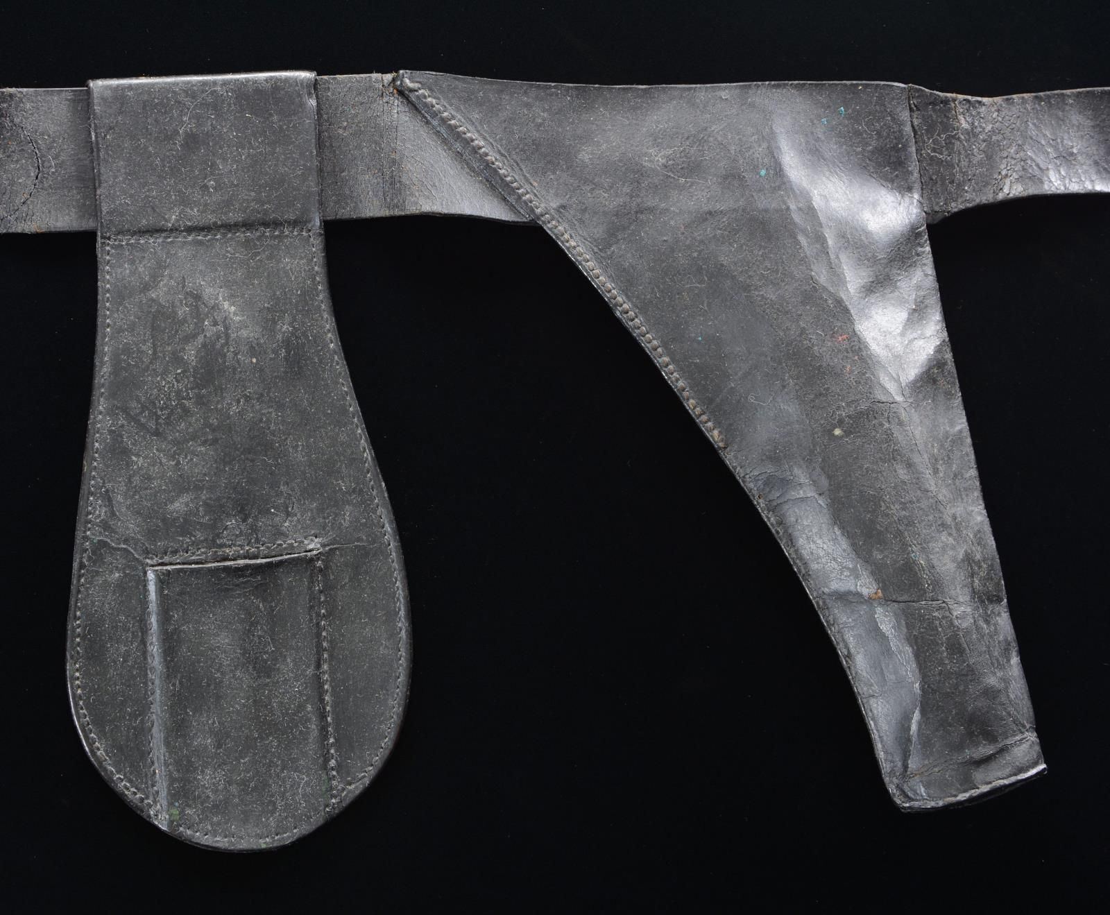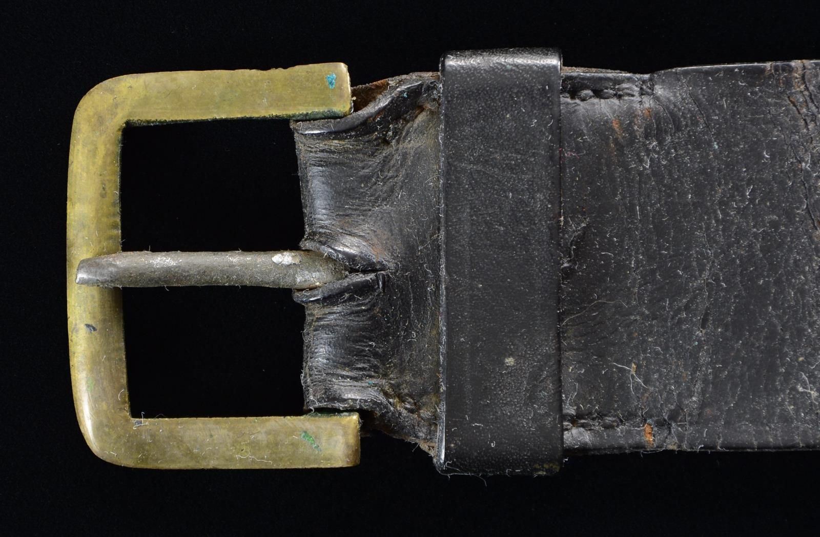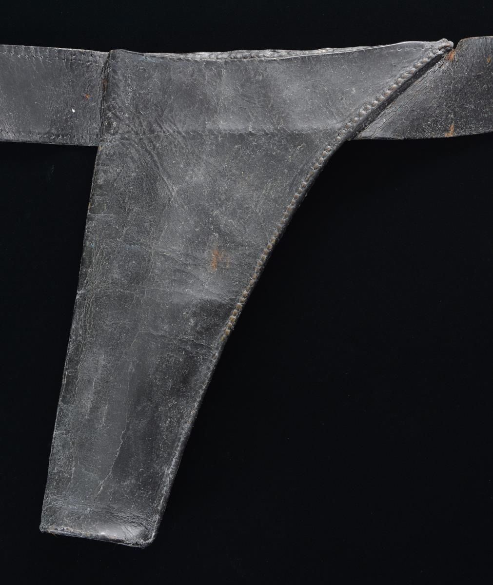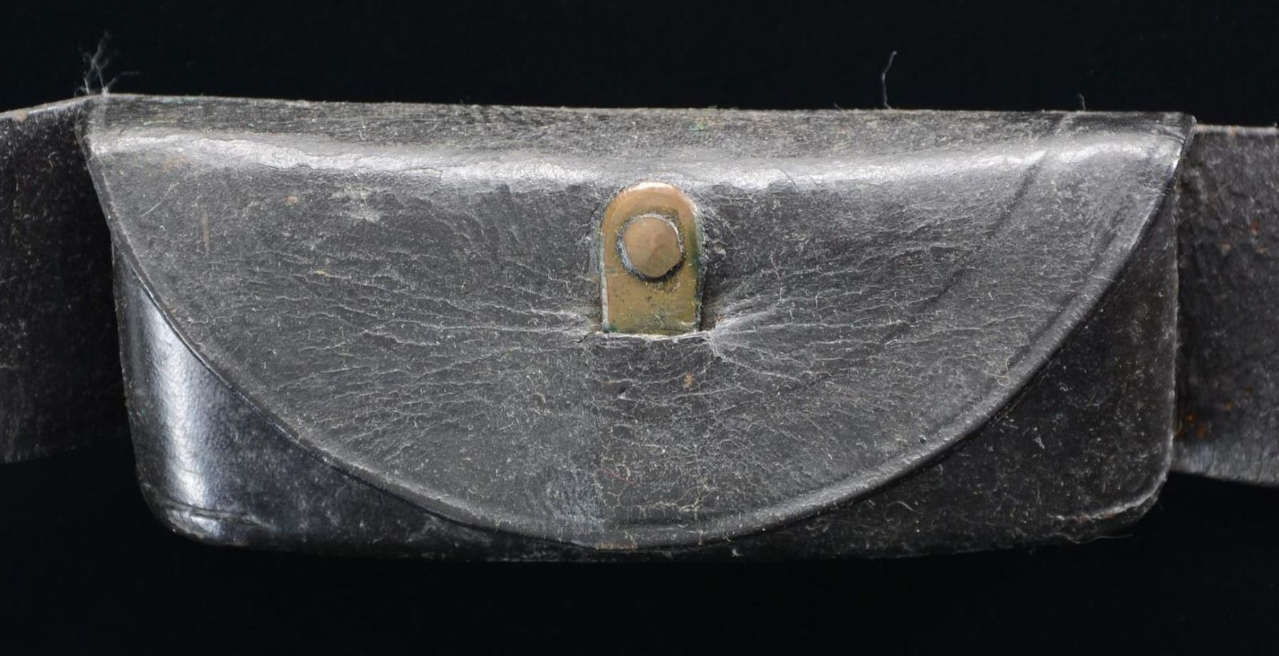 SMALL CARTRIDGE POUCH, AND A FROG. This belt, featured on page 518 of “U.S. Military Holsters & Related Accoutrements” by Meadows, measures approx. 48” in length and has a permanently sewn open-top 8” holster on each side for the USN M1843 boxlock pistol. The rear of the belt has a permanently sewn small cartridge box with a wooden insert for 54 cal. prewrapped cartridges. Between the cartridge box and the left-hand holster is an 8 1/2" leather frog that slides on the belt. The frog is not likely for a sword since the M1841 officer’s saber had ring mounts. Therefore, we suspect the frog is for a dirk or a boarding weapon of some kind, as this belt rig would likely only be worn during conflict. The brass buckle measures approx. 1 11/16” x 1 1/4", and the prong is made of iron. The 8” holsters are 5 1/2" wide at the top, tapering to about 2” wide at the base. The right-hand holster has the plug in place, but the left-hand holster’s plug is missing. The belt rig has a history of being owned by Commander Eliza Peck, USN, who served from 1816 to 1866. Peck retired in 1855 but was recalled during the Civil War. He was promoted to Captain in 1863, a scant three years before his death. UNATTACHED ACCESSORIES: a copy of page 518 from the Meadows book. CONDITION: the belt remains complete with no visible breaks or major flaws and is quite pliable. It is somewhat flexed and a bit flaked, but quite stable and well preserved. The holsters are solid but a bit stiff, as expected. The cartridge box and frog also show minimal wear. PROVENANCE: The Collection of Edward Scott Meadows. (02-22127/BF). $600-900.