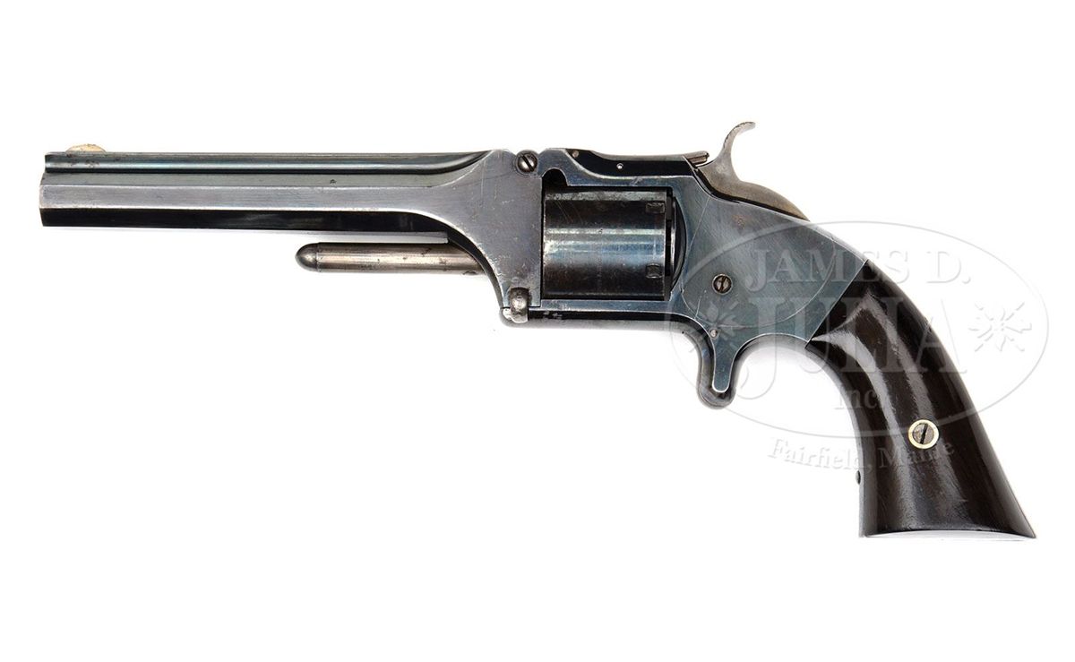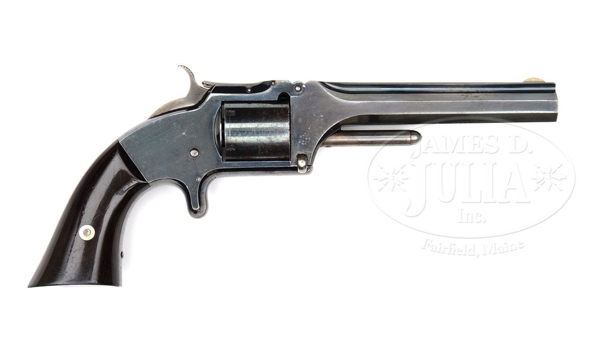 SN 988. Cal. 32. This is an exceptional example of the popular Civil War Smith & Wesson army revolver with 5" bbl. Based on three digit serial number this gun was made early in the war in 1861. This gun retains almost all of its orig finish and is as fine an example as you will encounter. It shows strong case colors on the hammer, trigger, and ejector rod. Early 2 pin varieties are difficult to find in high condition as they generally saw hard service during the Civil War. The gun has matching assembly numbers, and the SN is stamped on the inside of the grip. PROVENANCE: Karl Moldenhauer Collection, Marlan Polhemus Collection. CONDITION: Gun retains about 90-95% of its orig bright blue finish on frame, cylinder and bbl with staining and other surfaces turning plum. There are small nicks and dents near latch on bbl housing. Maker and patent marks on bbl flat and cylinder are crisp and easily read as are serial numbers. Rosewood grips are sound and solid retaining almost all their old varnished finish. Mechanically gun functions well with crisp shiny rifling. 4-48724 JS69