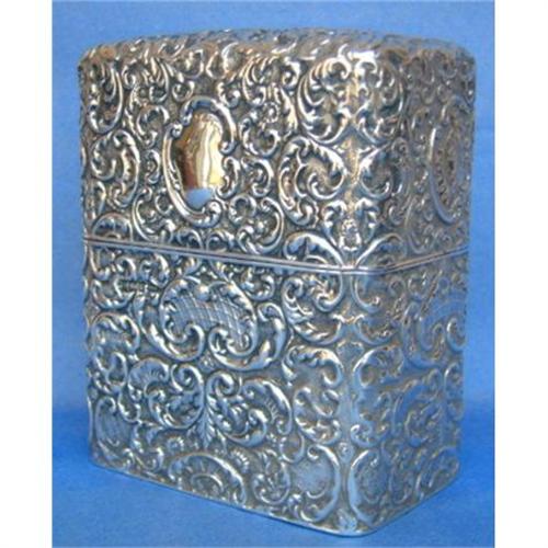 Superb Example of a Ladies English Silver Jewellery Casket or Table Box with hinged upper, of good size proportions complete with original thick cranberry glass liner. The main outer case with lavish cast chasing with a central vacant cartouche. <P>