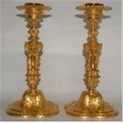 Superb Example of a Very Stylish and Heavy Early Pair of Finely Cast Single Light Table or Mantle French Ormolu Candlesticks. The main central supports each with four standing figures in 18th Century dress above a wide petal shaped base, second quarter of the 19th Century, complete with original firm fitting drip pans. <p> In overall very good condition with no damage, these Candlesticks have been professionally re-gold plated. <P> Dimensions Height: 10? (25.5cm). Width: (base) 5" (12.5cm). Depth: (base) 5" (12.5cm).
