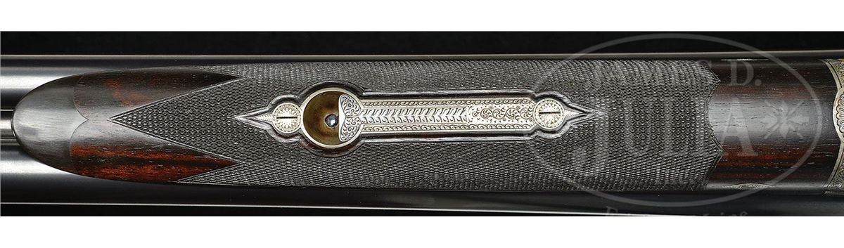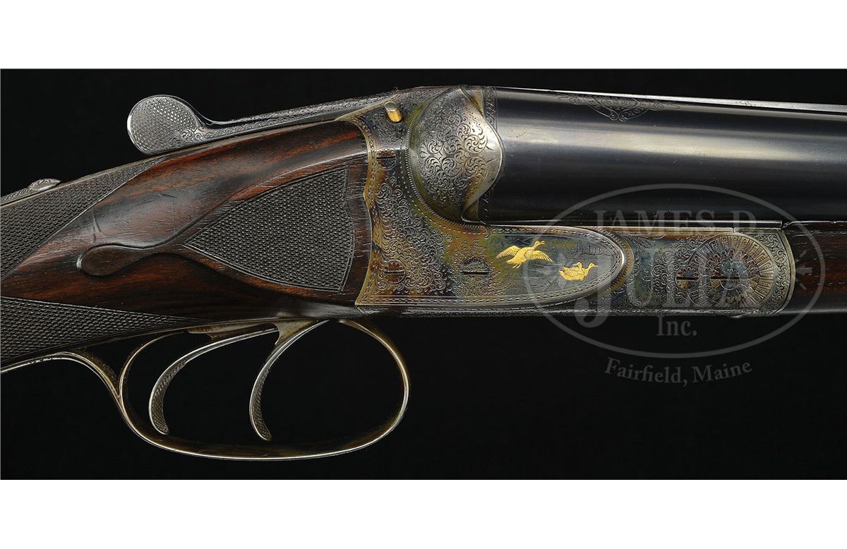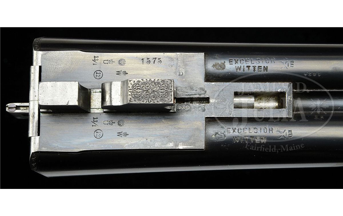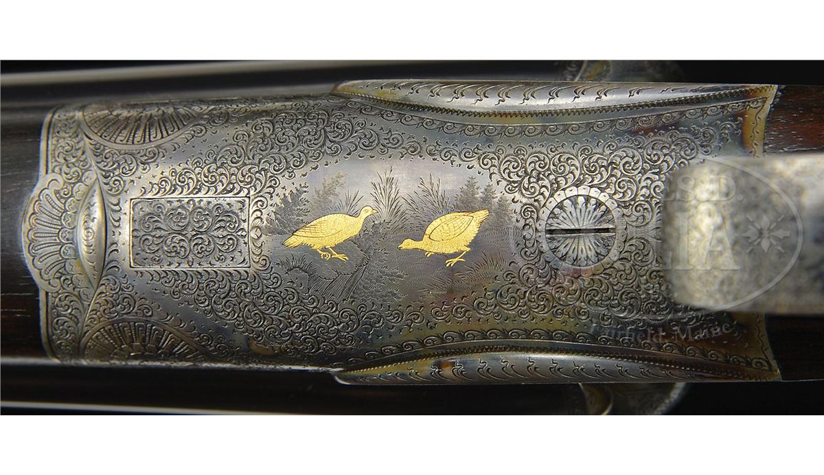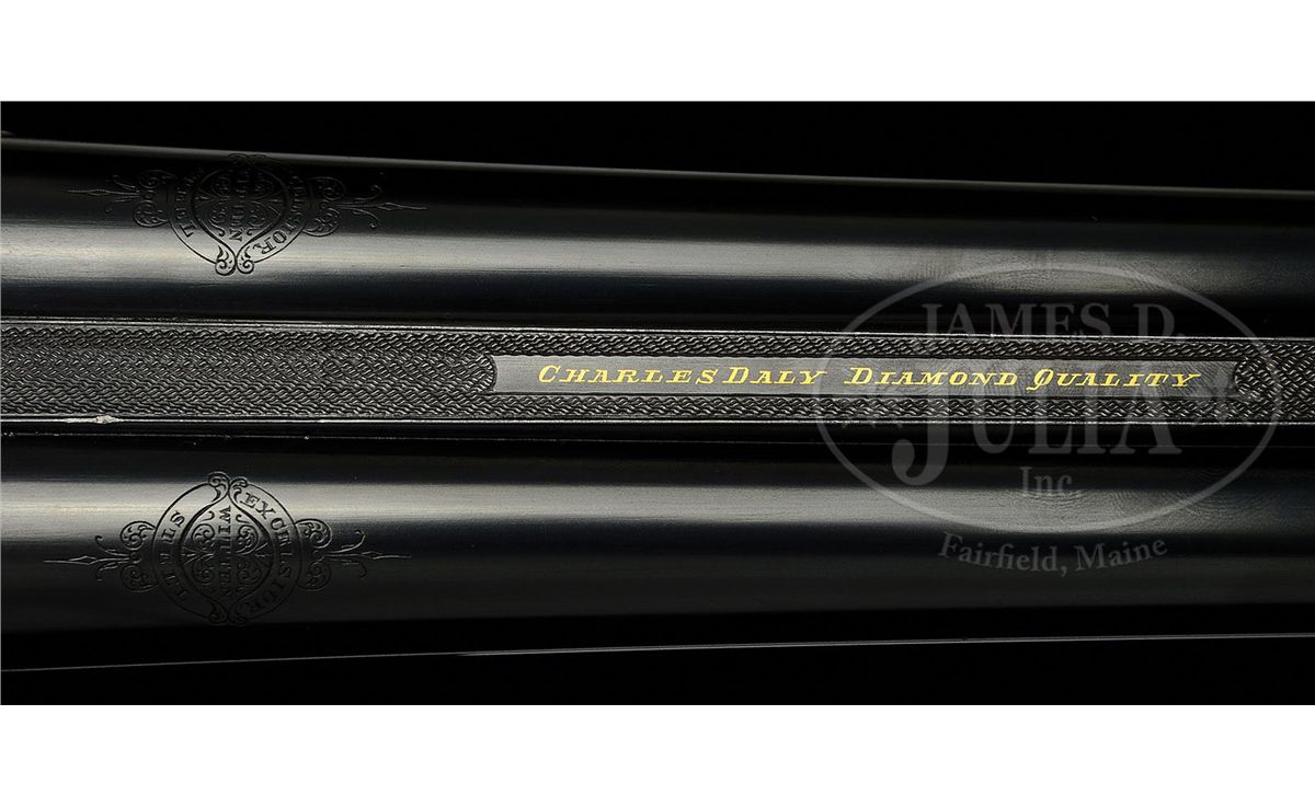 SN 1575. Cal. 12 ga. 2-3/4" Chambers. 30" Chopper lump bbls are gold inlaid "Charles Daly Diamond Quality" on unmatted portion of concave, game rib mounted with two ivory beads. Witten Steel logos are engraved on breech ends. Bbl flats are stamped with German imperial black powder proofs, bottoms of bbls with "EXCELSIOR WITTEN" and with HAL crossed pistol logos. Breech ends and lumps are damascened. Scallop-backed, case hardened, boxlock action features square crossbolt third fastener, side clips, gold-plated pin type cocking indicators, intercepting sears, and nickel-plated checkered double triggers. Water table is stamped "PRUSSIA". Action is engraved with well cut medium scroll, and with flush gold inlays of game birds in appropriate backgrounds; a pair of snipe fly across left side, a trio of ducks in mountain scene, one flying, two paddling in marsh on right, a duo of gallinaceous fowl are feeding in open scrub lands on bottom. A setter is gold inlaid on trigger guard bow. SN is engraved at grip. Beautifully marbled and lightly figured European walnut semi-pistol grip buttstock measures 14-3/8" over black leather-covered pad, and features checkered side panels with elongated drop points, point pattern checkering, inlet horn grip tip with raised lozenge at center, and a vacant gold oval on toe line. Matching splinter ejector forend has scalloped horn schnabeled tip and Deeley type release. Bore diameter: left-.727, right -.727. Bore restrictions: left -.033 (Full), right -.040 (Extra full). Wall thickness: left -.030, right -.025. Drop at heel: 3", drop at comb: 1-3/4". Weight: 7 lbs. 14 oz. LOP: 14-3/8". CONDITION: Exceptionally fine. Bbls retain essentially all of their orig beautifully polished blue finish with only a few very minor marks, most noticeably one or two pings on right side of rib. Action retains 95 - 98% orig vivid case hardening color, silvered on fences, top tang, and trigger guard tang. A considerable amount of color remains on forend iron with traces visible on latch. Top lever is only slightly silvered on thumbpiece. Stocks retain nearly all of their very fine orig rubbed oil finish, with one or two minor scratches and marks, and perhaps a touch of added oil on butt, after replacement pad was installed. Bores are nearly perfect.ÊÊMost of the orig damascening is present on bbls, and only slight cartridge haloes on breech face. Action is tight. Bbls are on face. Ejectors are strong, but slightly out of time. An exceptional specimen worthy of a place in a collection of the world's finest guns. 4-48999 MGM53
