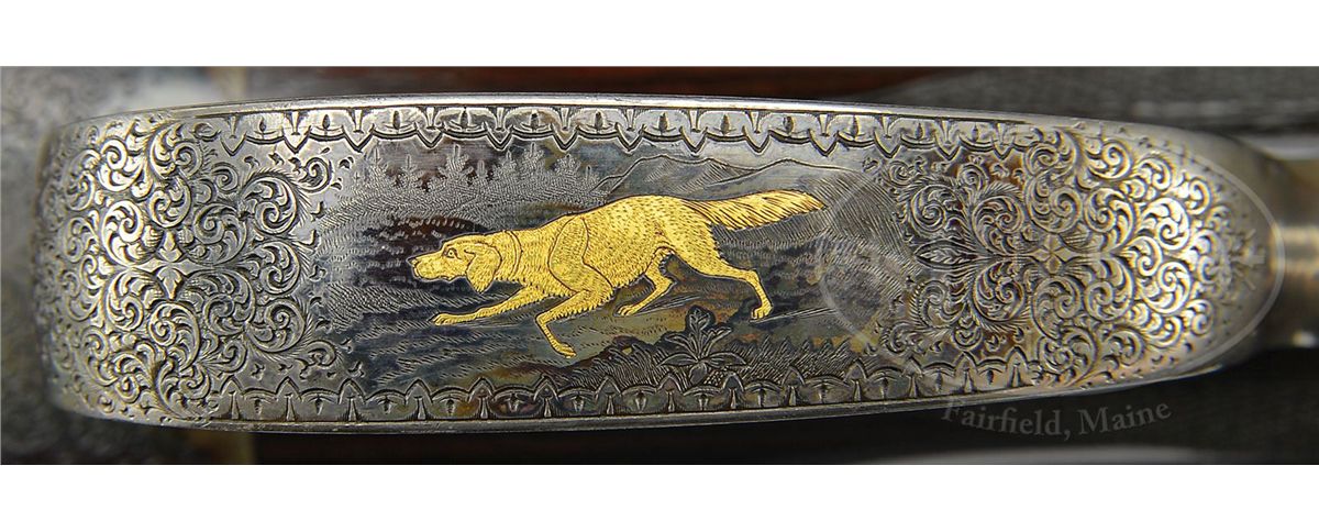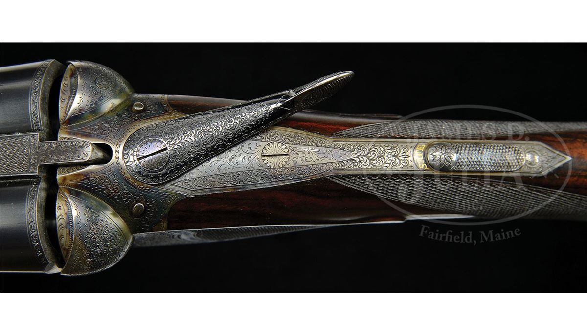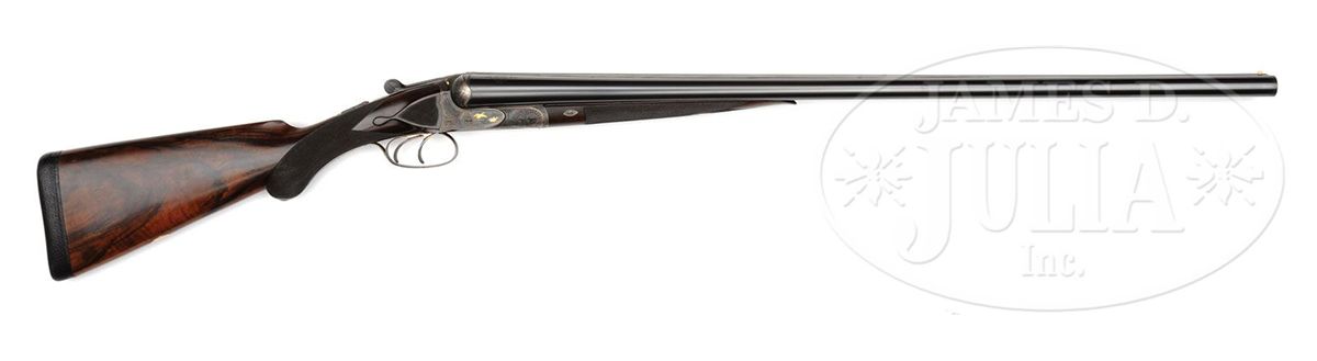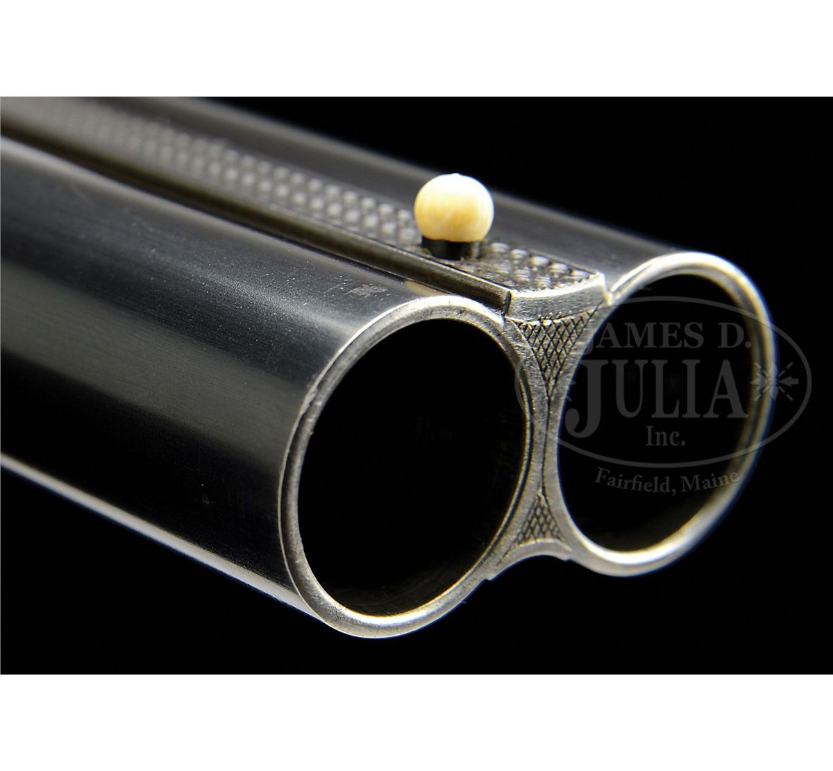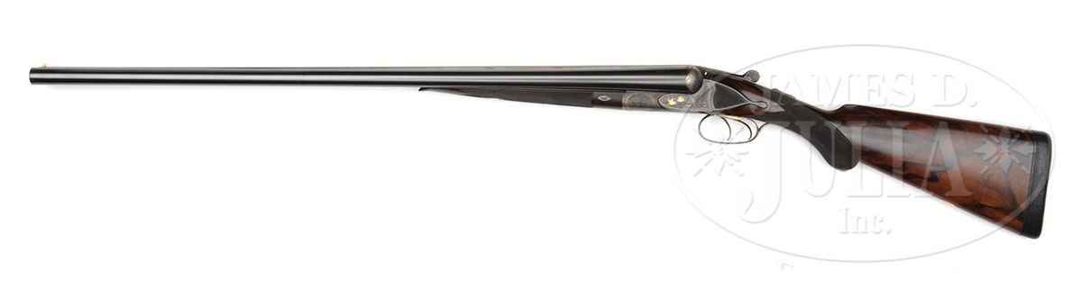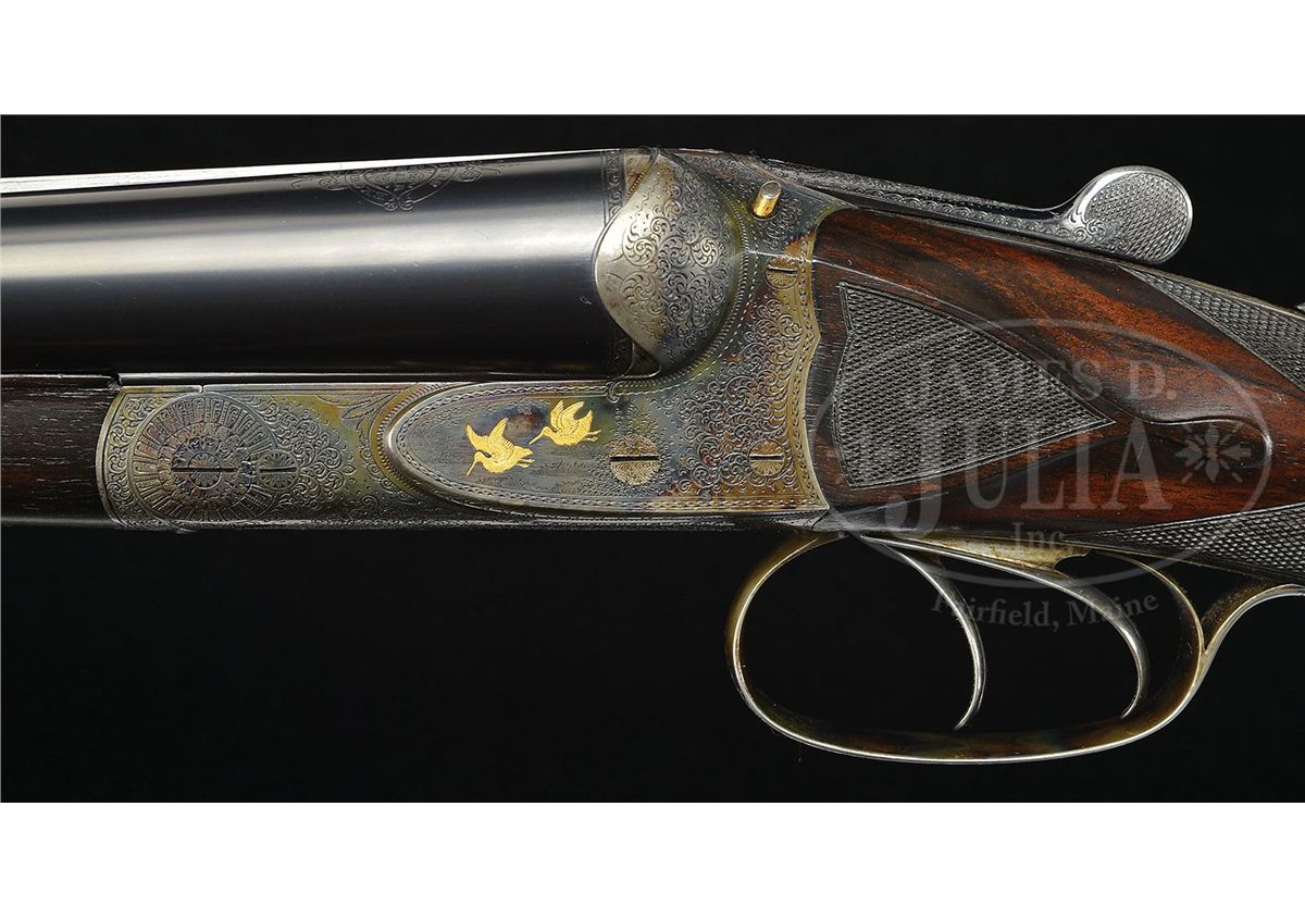 SN 1575. Cal. 12 ga. 2-3/4" Chambers. 30" Chopper lump bbls are gold inlaid "Charles Daly Diamond Quality" on unmatted portion of concave, game rib mounted with two ivory beads. Witten Steel logos are engraved on breech ends. Bbl flats are stamped with German imperial black powder proofs, bottoms of bbls with "EXCELSIOR WITTEN" and with HAL crossed pistol logos. Breech ends and lumps are damascened. Scallop-backed, case hardened, boxlock action features square crossbolt third fastener, side clips, gold-plated pin type cocking indicators, intercepting sears, and nickel-plated checkered double triggers. Water table is stamped "PRUSSIA". Action is engraved with well cut medium scroll, and with flush gold inlays of game birds in appropriate backgrounds; a pair of snipe fly across left side, a trio of ducks in mountain scene, one flying, two paddling in marsh on right, a duo of gallinaceous fowl are feeding in open scrub lands on bottom. A setter is gold inlaid on trigger guard bow. SN is engraved at grip. Beautifully marbled and lightly figured European walnut semi-pistol grip buttstock measures 14-3/8" over black leather-covered pad, and features checkered side panels with elongated drop points, point pattern checkering, inlet horn grip tip with raised lozenge at center, and a vacant gold oval on toe line. Matching splinter ejector forend has scalloped horn schnabeled tip and Deeley type release. Bore diameter: left-.727, right -.727. Bore restrictions: left -.033 (Full), right -.040 (Extra full). Wall thickness: left -.030, right -.025. Drop at heel: 3", drop at comb: 1-3/4". Weight: 7 lbs. 14 oz. LOP: 14-3/8". CONDITION: Exceptionally fine. Bbls retain essentially all of their orig beautifully polished blue finish with only a few very minor marks, most noticeably one or two pings on right side of rib. Action retains 95 - 98% orig vivid case hardening color, silvered on fences, top tang, and trigger guard tang. A considerable amount of color remains on forend iron with traces visible on latch. Top lever is only slightly silvered on thumbpiece. Stocks retain nearly all of their very fine orig rubbed oil finish, with one or two minor scratches and marks, and perhaps a touch of added oil on butt, after replacement pad was installed. Bores are nearly perfect.ÊÊMost of the orig damascening is present on bbls, and only slight cartridge haloes on breech face. Action is tight. Bbls are on face. Ejectors are strong, but slightly out of time. An exceptional specimen worthy of a place in a collection of the world's finest guns. 4-48999 MGM53