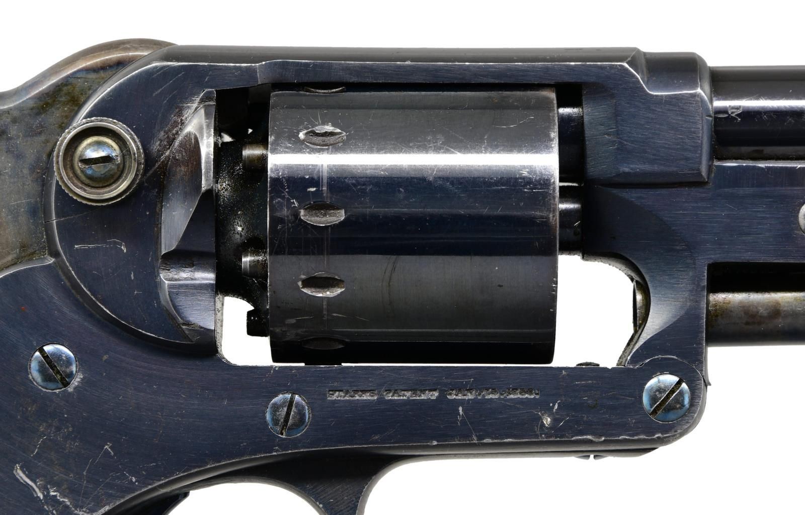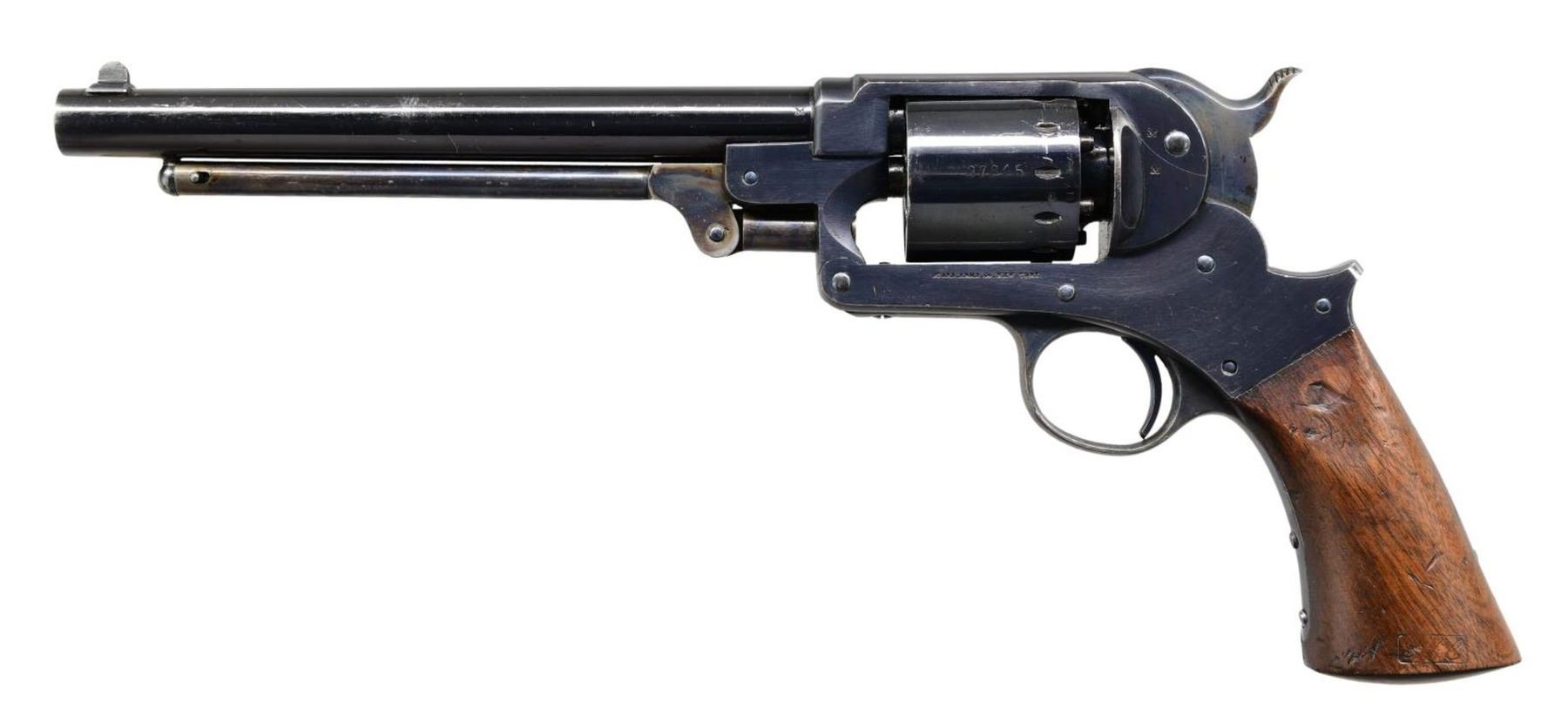 STARR ARMY REVOLVER. Cal. 44. S# 37845. Standard configuration, 8" barrel, solid blued steel frame marked on either side: "STARR ARMS CO. NEW YORK" & "STARR'S PATENT JAN. 15, 1856". Serial numbers start at 23000 continuing the numbers from earlier double action revolver production. This revolver was made in late 1863 or early 1864 and part of 25,000 US government contract. This was the third most common government contracted cavalry sidearm, behind the Colt and Remington, but is exceptionally difficult to find in excellent condition and this would be a difficult example to upgrade. CONDITION: extremely fine overall, retaining 95% plus bright original blue on barrel, cylinder, and frame, screws & trigger retain most all of their original fire blue, bright case colors are retained on loading assembly and hammer. One piece grip is sound was scattered cosmetic defects and two discernible inspection cartouches on either side. Mechanically fine, crisp bright shiny rifled bore. (01-25375/JS). ANTIQUE. $9,000-12,000.