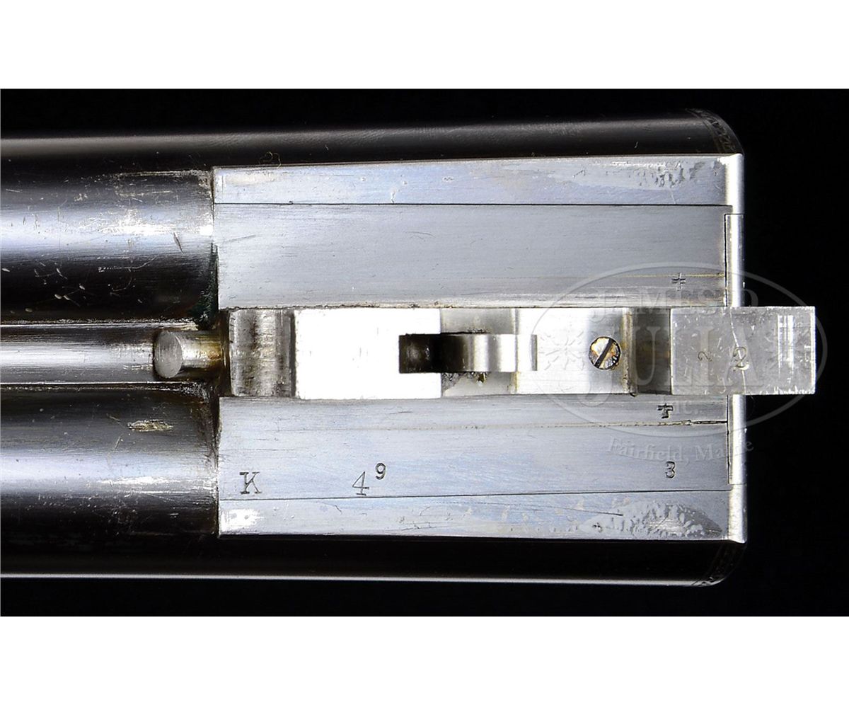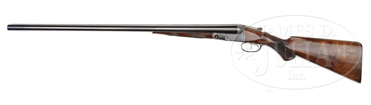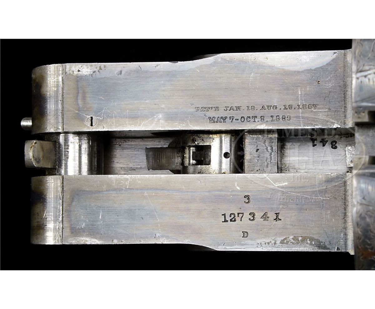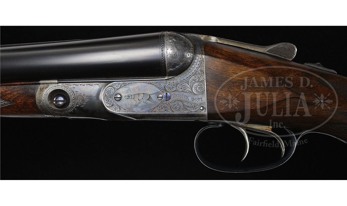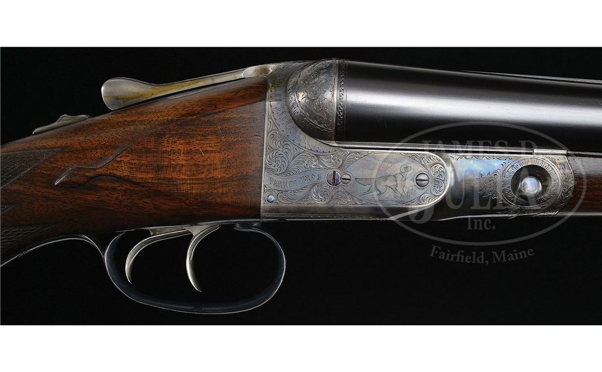 SN 127341. Cal. 12 ga. 2-3/4"Chambers. No. 2 Frame. Parker Gun Identification and Serialization ledger lists this gun as a grade "3" with 30" Titanic steel bbls, and with capped pistol grip stock. Gun remains in this configuration. Bbls have all correct engravings and markings. Action has standard "D" engraving with dogs on either side and group of fowl on trigger plate. Nicely figured European capped pistol grip stock measures 14-1/4" over skeleton buttplate. Gun is fitted with splinter forend. Bore diameter: left-.731, right -.729. Bore restrictions: left -.036 (Full), right -.037 (Full). Wall thickness: left -.035, right -.033. Drop at heel: 2-1/8", drop at comb: 1-1/2". Weight: 8 lbs. 1 oz. LOP: 14-1/4". PROVENANCE: Factory letter stating that this gun was shipped on Sept 14, 1904, and lists specifications, bbl patterns, and Parker workmen. CONDITION: Truly exceptional, as original; a benchmark gun against which to judge the originality of others of its period. Bbls retain 98% + orig blue with only a few marks and light scratches. Action retains nearly all its orig case hardening color, silvered only slightly on the sharpest edges and thinned a bit on bottom. Hinge pin retaining and hammer pivot screws show most of their brilliant fire blue. Forend iron retains nearly all of its case color, as does latch and tip. Trigger guard has only some slight flaking and silvering of its orig blue at grip. Skeleton buttplate retains a considerable amount of its orig bright blue, with loss due to flaking. Stocks have only a few minor compressions and light scratches in their orig finish, checkering darkened. Silver oval is tarnished black. Bores are excellent. Action is tight. Screws unturned. An incredible find with good shootable dimensions. 4-49275 MGM129