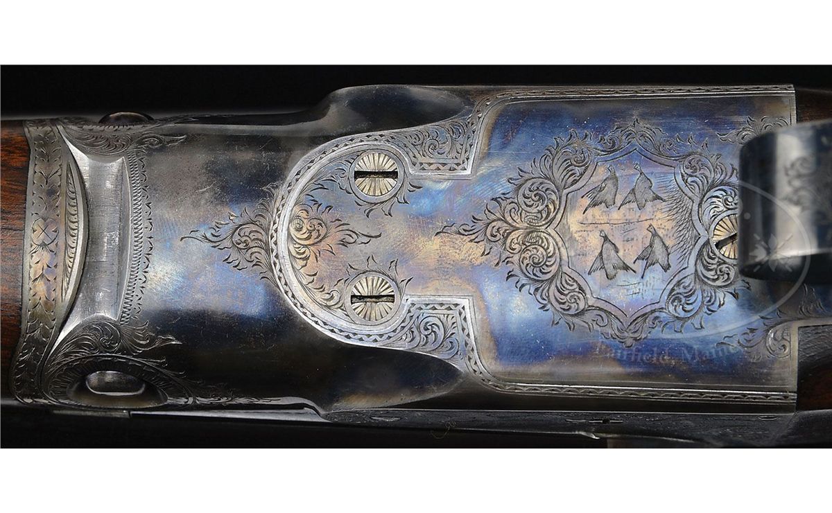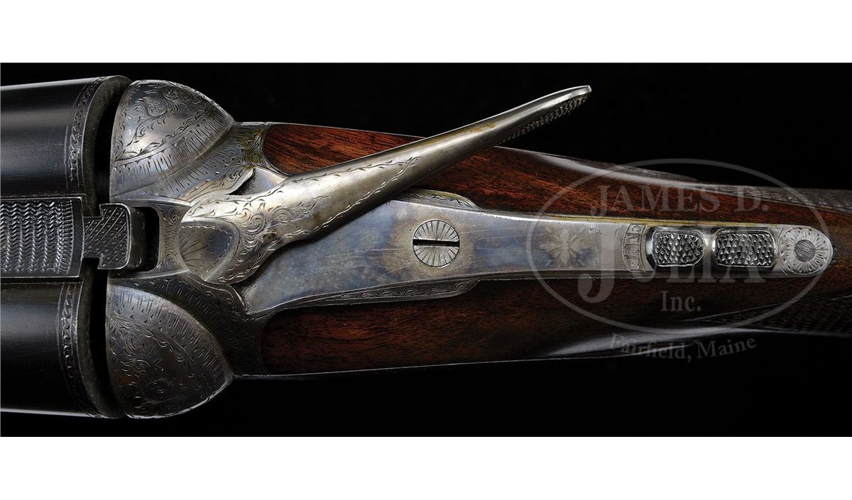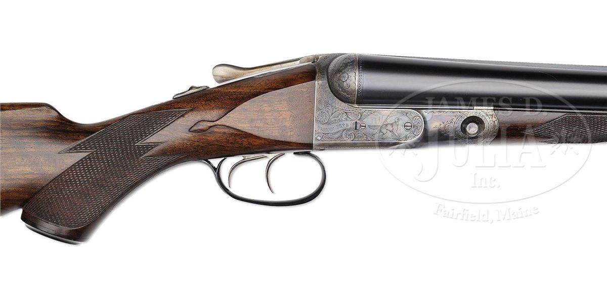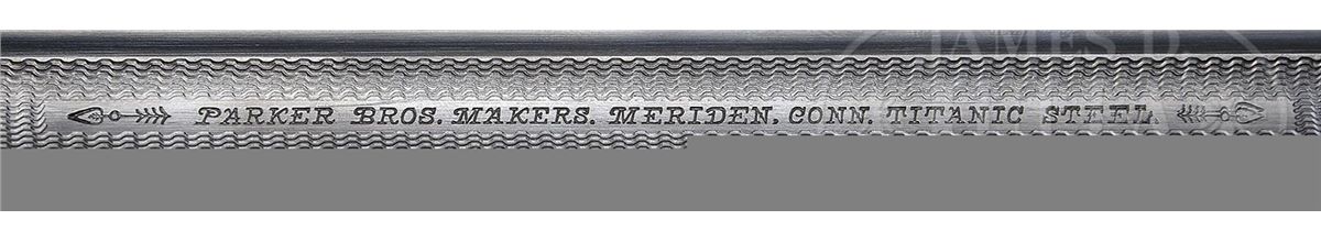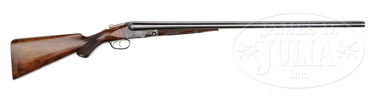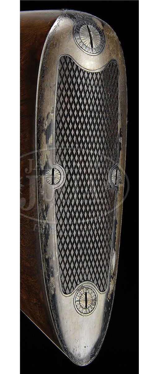 SN 127341. Cal. 12 ga. 2-3/4"Chambers. No. 2 Frame. Parker Gun Identification and Serialization ledger lists this gun as a grade "3" with 30" Titanic steel bbls, and with capped pistol grip stock. Gun remains in this configuration. Bbls have all correct engravings and markings. Action has standard "D" engraving with dogs on either side and group of fowl on trigger plate. Nicely figured European capped pistol grip stock measures 14-1/4" over skeleton buttplate. Gun is fitted with splinter forend. Bore diameter: left-.731, right -.729. Bore restrictions: left -.036 (Full), right -.037 (Full). Wall thickness: left -.035, right -.033. Drop at heel: 2-1/8", drop at comb: 1-1/2". Weight: 8 lbs. 1 oz. LOP: 14-1/4". PROVENANCE: Factory letter stating that this gun was shipped on Sept 14, 1904, and lists specifications, bbl patterns, and Parker workmen. CONDITION: Truly exceptional, as original; a benchmark gun against which to judge the originality of others of its period. Bbls retain 98% + orig blue with only a few marks and light scratches. Action retains nearly all its orig case hardening color, silvered only slightly on the sharpest edges and thinned a bit on bottom. Hinge pin retaining and hammer pivot screws show most of their brilliant fire blue. Forend iron retains nearly all of its case color, as does latch and tip. Trigger guard has only some slight flaking and silvering of its orig blue at grip. Skeleton buttplate retains a considerable amount of its orig bright blue, with loss due to flaking. Stocks have only a few minor compressions and light scratches in their orig finish, checkering darkened. Silver oval is tarnished black. Bores are excellent. Action is tight. Screws unturned. An incredible find with good shootable dimensions. 4-49275 MGM129