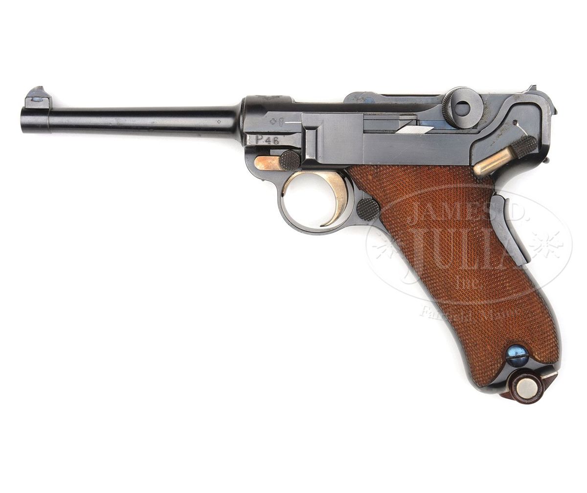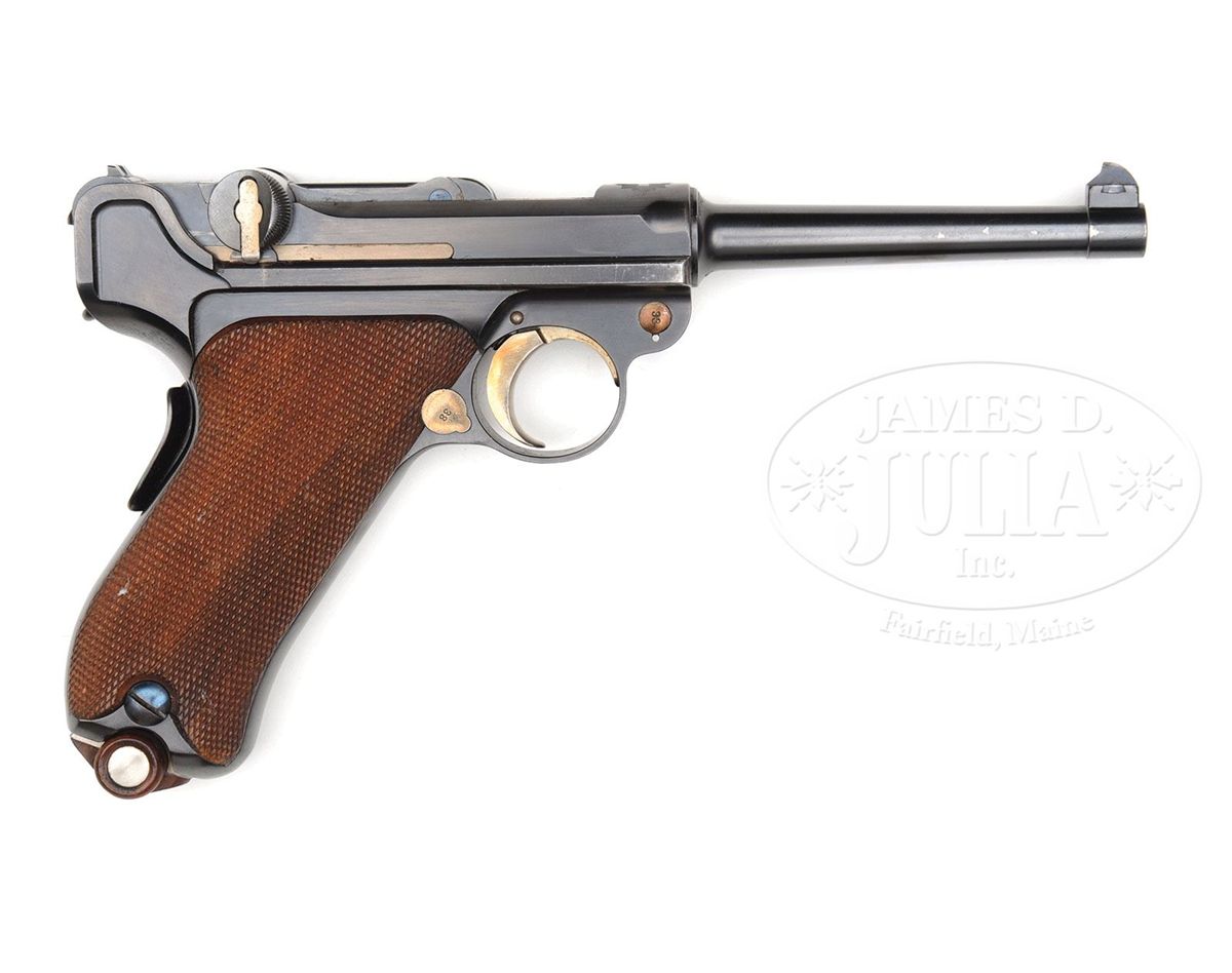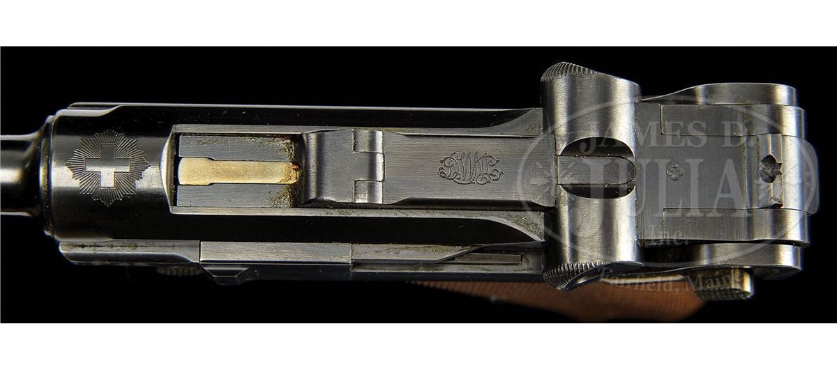 SN 1433. Caliber 7.65 Luger. Early Swiss M1900 Luger with 4-3/4" bbl having a drift adjustable fire blued sight and a fixed rear sight. Swiss cross in sunburst over chamber with intertwined DWM logo on central toggle link. Swiss cross marking on left bbl and left receiver that is inspector "V" marked. The full serial number is marked under the bbl and repeated on the forward frame. Release marking "P46" struck on the left rail. Short checkered safety lever with underlying frame polished bright. Disassembly shows all matching parts including the grips. Correct Swiss magazine with disc inserts on each side of the magazine base. PROVENANCE: Joseph J. Schroeder, Jr. Collection. CONDITION: Bright 98% original blue with minor handling and wear on the right side of the bbl, the tips of the rails, the lower portion of the sideplate, and the bottom of the frontstrap. Very slight cleaning of frame over the left grip panel. Bright original straw in keeping with the overall condition of the gun. Over 95% of the fire blue remains on the grip screws. Comparable high condition and sharply checkered grips with only minimal staining. Excellent magazine with a near perfect base. Perfect mirror bore and perfect mechanics. 4-48534 LMA71