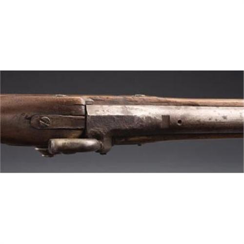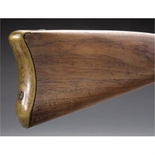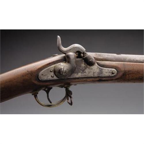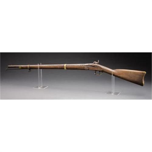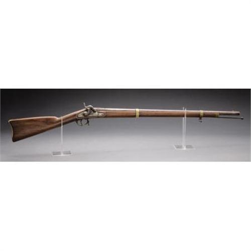 <B>EXCEPTIONAL UNTOUCHED CONDITION CONFEDERATE FAYETTEVILLE 1863 .58 CALIBER PERCUSSION TWO BAND RIFLE.</B></I> During the early part of the war Fayetteville utilized parts captured when the Confederates took the US arsenal at Harpers Ferry. Total production at the armory was between 8000 and 9000 with the majority of rifles made being the late war Type IV. The rifle offered here is a late 1863 Type III with lock markings of “1863/Fayetteville/C.S.A.” and the distinctive S contour Fayetteville hammer. Breech retains vestiges of the original date 1864 (not unusual) and the “V” “P” and eaglehead proofs of left flat. Brass nose cap, bands, trigger guard, lock bolt washers and butt plate. The butt plate tang is deeply marked CSA and both bands have the spring alignment U stamped slightly off center. Interestingly the U on the top band is stamped upside down. Retains both original sling swivels and a perfect inspector’s cartouche, a rarity in and of itself. Made without bayonet lug. Mortised front sight, rear sight missing. A wonderful 1863 Fayetteville in a condition rarely encountered.<BR><BR><B>Condition:</B></I> All metal untouched/uncleaned with gray patina on barrel and screws with just some medium pitting and a few dents at the breech. All brass with very pleasing untouched age patina. Very good bore with rifling weak/worn at the muzzle. The wood is also exceptional with sharp edges, again untouched. There are two shallow gouges just forward of the trigger guard, minor. The area above the lock screws obviously took a hard hit at some point long ago with a ½” X 3” sliver missing. The edges show the same patina as the rest of the wood and the damage probably occurred during the period of use. The breech plug is cracked and separated from the wood at this point as well. There is original acid brown present on the side of the breech (Probably underneath the barrel as well although to protect the untouched integrity of the gun we have not dismantled it). Ramrod is a period field expedient replacement. <BR><BR><b>Shipping:</b> Requires 3rd Party Shipping (<a target="_blank" href="http://www.heritageauctions.com/common/shipping.php">view shipping information</a>)