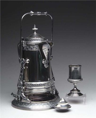 EXCEPTIONAL VICTORIAN QUADRUPLE PLATED KETTLE ON STAND. Reed & Barton, Taunton, MA. Tipping kettle with nice decoration has matching pedestaled goblet. SIZE: 19-1/2” h. CONDITION: Beautifully polished, very good to excellent. 9-26861