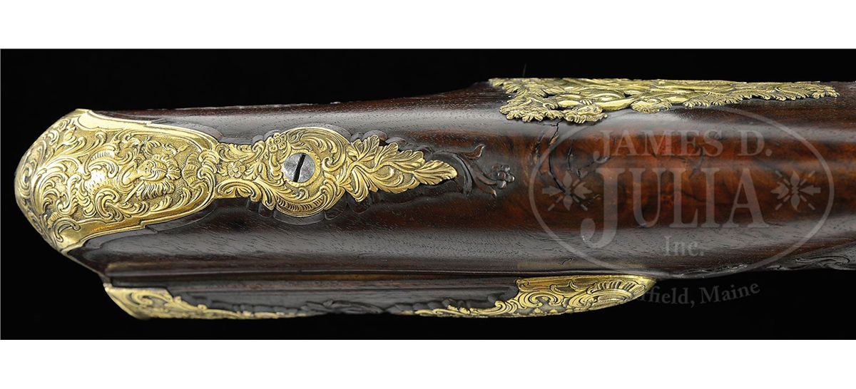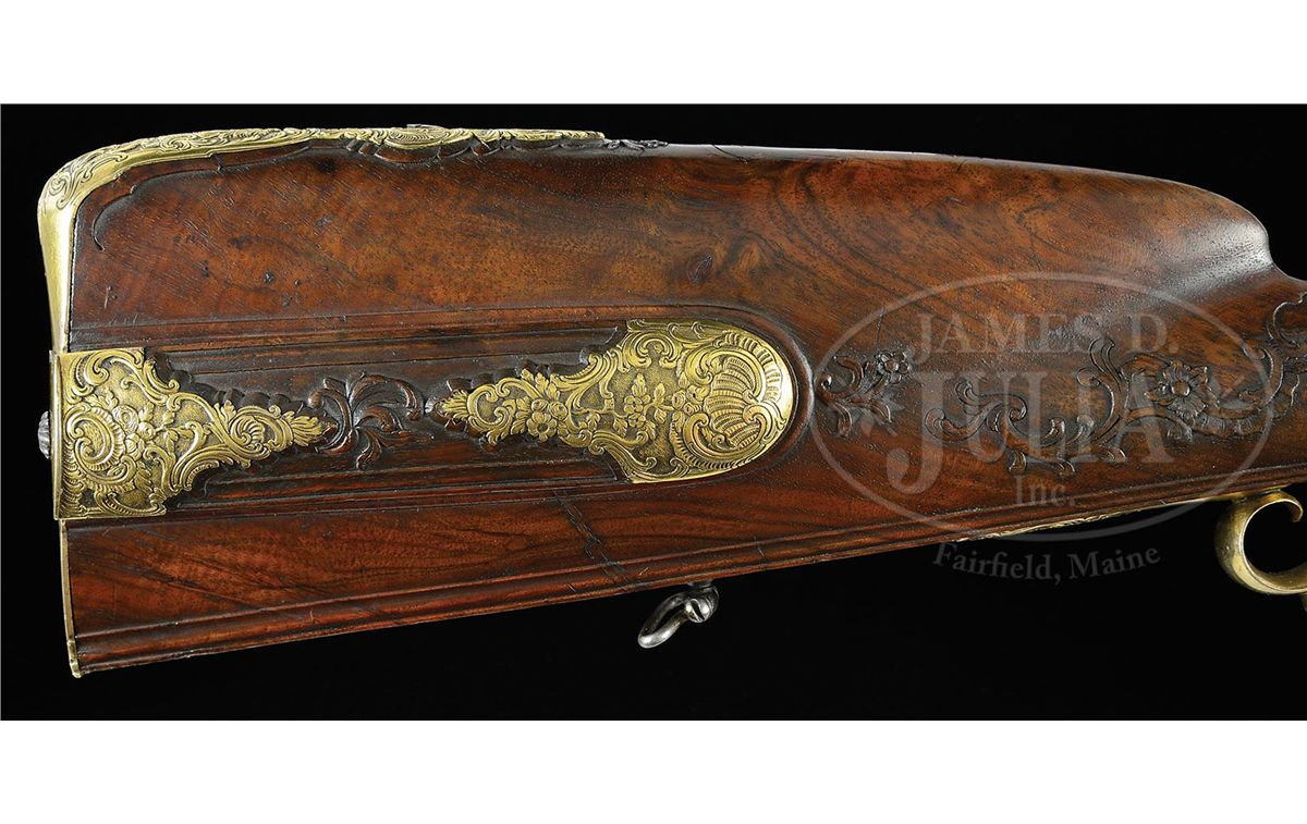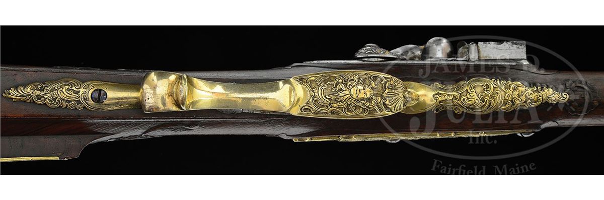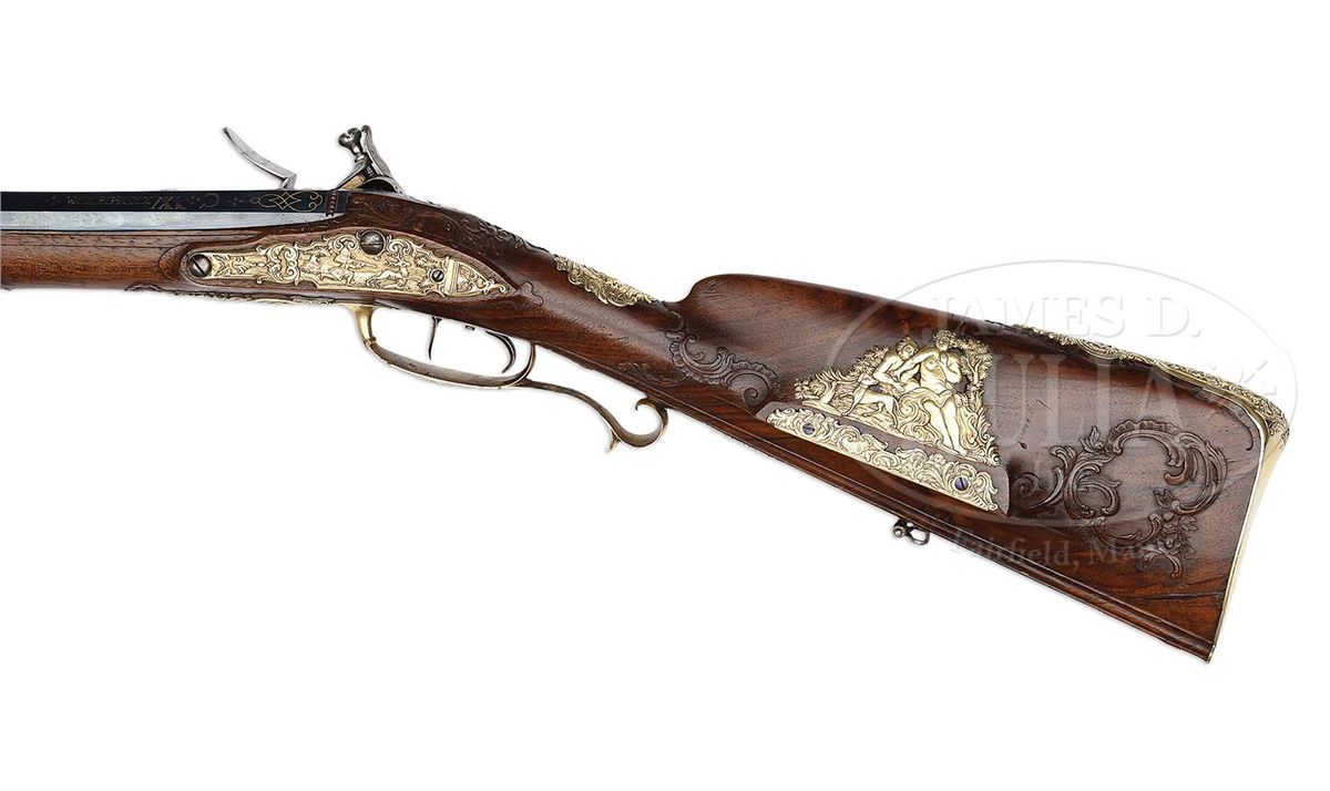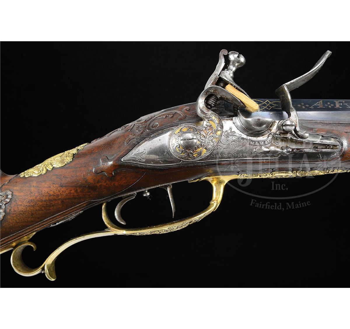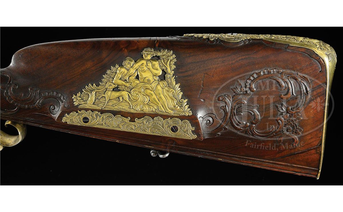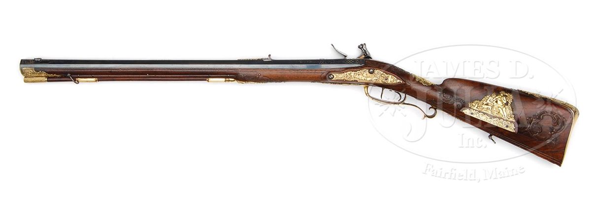 NSN. (ca 1760) Cal. .600 Groove diameter, 7 deep rounded grooves. 24" Elegantly swamped octagon blued steel bbl, is mounted with single standing engraved steel U-notch rear sight with gold-plated brass forward extension, has simple bead front, both sights dovetailed through. Area around front sight is gold inlaid with thin wire scrolls and geometric motifs. Top of rear portion of bbl has silver poincon of leaping stag, and another gold and silver circular poincon of sun. This is an acknowledged mark of C. W. Freund of Furstenau, working 1745 - 1780, whose name and address are gold and silver inlaid on top three flats of bbl at rear. Round body lock with inset round pan has unbridled frizzen with nicely filed stop. Frizzen acts against spring with friction. Spring is nicely file cut and has bulbous finial with fleur-di-lis tip. Lockplate is engraved "C Freund" in scroll and floral terminated riband under pan. "Furstenau" is below this along bottom edge of lockplate. Round bodied, serpentine cock is relief engraved with acanthus and flowers, which have gold-plated stippled background. Steel trigger plate is mounted with double set triggers. Full length stock with sliding patch box is of well figured European walnut with finely executed moldings along bbl and ramrod channels, sides of stock toe line, and around lock, patch box, and extension of buttplate tang. Further stock carving consists of exceptionally well done scrolled vines with floral highlights at bbl tang, behind tailpipe, at both sides of wrist, and behind cheekpiece. Patch box cover is also nicely molded with relief carving at center. Deeply relief cast and chased gilded brass furniture is exceptionally well inlet and is the trademark of this highly regarded gun maker. This furniture consists of scrolled trigger guard with acanthus relief finials with shell motif transitioning to grotesque mask on bow. Scrolled outlined sideplate depicts hunter running with rifle chasing down stag, which is being worried by hound from side. Bottom edge of cheekpiece is protected by acanthus scrolled inlay surmounted by large erotic scene of nymph and satyr in sylvan setting with bemused hound looking on. Top tang of buttplate depicts Belona, Roman goddess of war. Finial is acanthus scroll. Patch box cover has acanthus scrolled inlays at either end. There is a cartouche at wrist, with blank central oval flanked by lions and surmounted by crown. Forend cap with flared tip is also decorated with relief acanthus scroll. Ramrod pipe and tailpiece are octagonal with ring terminations. Walnut ramrod has spiral fluted tip. Sling loops are mounted 3" back from muzzle and on flat toe line. "No 31" is stamped between rear sling base and scrolled buttplate return. CONDITION: Excellent. Bbl retains nearly all of an excellent quality charcoal re-blue done by noted specialist in early rifles, Ronald Scott, who used this particular rifle as a model for one of his special courses in gun making in 2010. Bright polish of lock shows some slight discoloration, as does cock and rear sight. Stock retains nearly all of its orig oil finish with a few minor marks, as might be expected in over 250 years of existence. Furniture retains essentially all of its orig fire gilt. Most all screws retain their orig fire blue. Bore is excellent, bright and shiny throughout, appears unfired. Frizzen shows evidence of some flint strikes. Pan is unstained. An exceptional Jaeger rifle by one of the acknowledged masters of all time ... his rifles appear in many museums, notably seven in the Counts gun room at Erbach Castle in the Odenwald, which are illustrated in FLINTLOCK JAEGER RIFLES, MASTERPIECES OF EIGHTEENTH CENTURY GUNMAKERS by Erhard Wolf on pages 326 - 387. Many of these illustrated rifles have furniture identical to that on this rifle. A copy of this book with its English translation is included with this exceptional early piece. 4-47162 MGM34