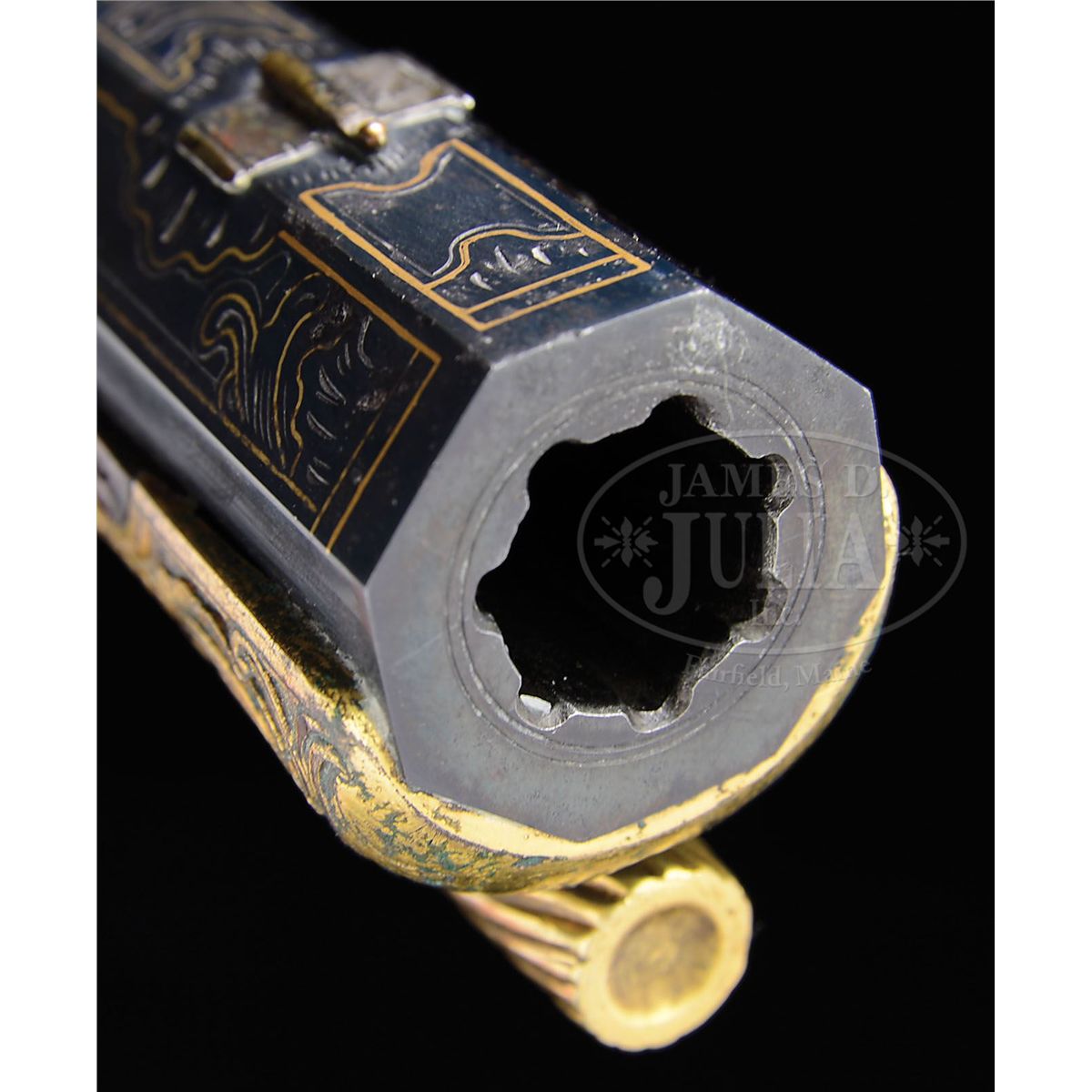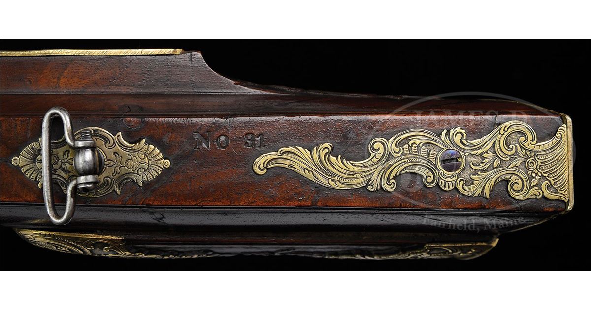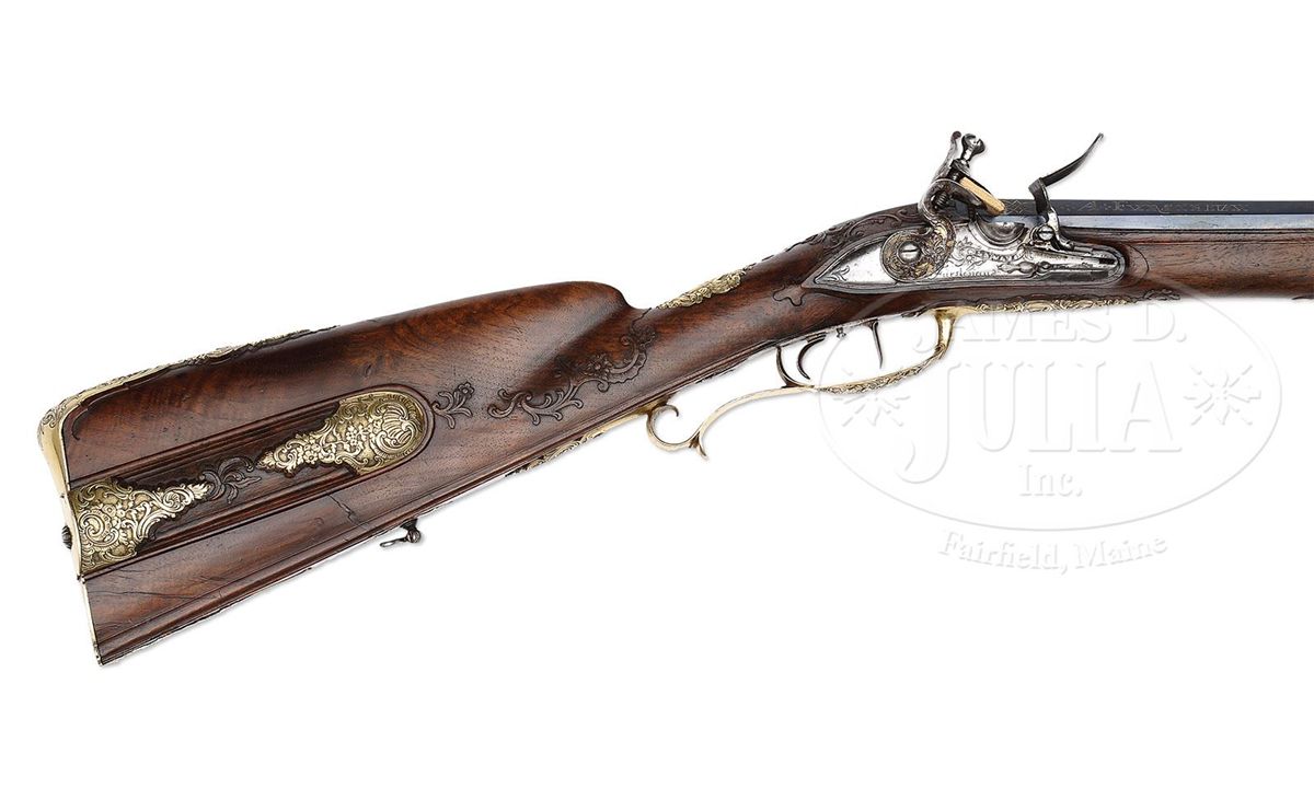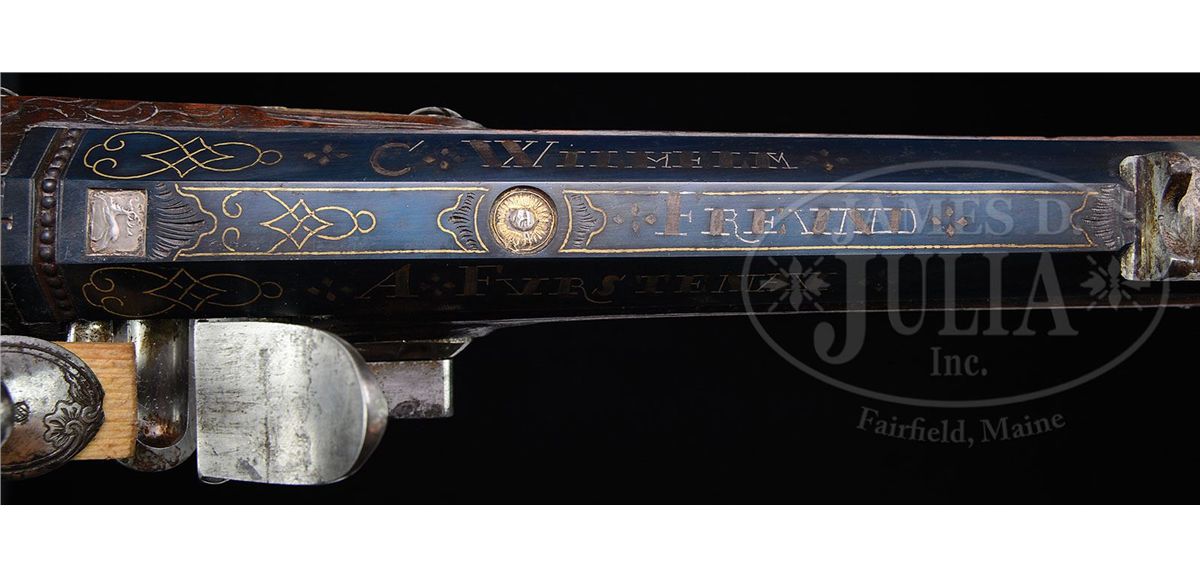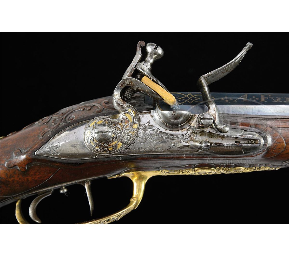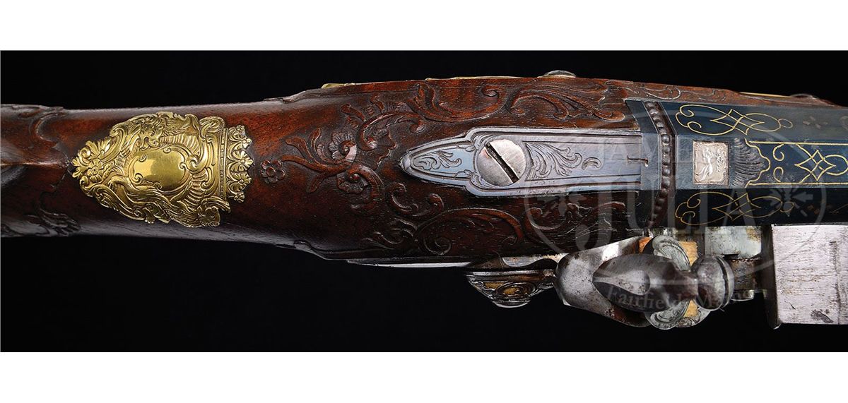 NSN. (ca 1760) Cal. .600 Groove diameter, 7 deep rounded grooves. 24" Elegantly swamped octagon blued steel bbl, is mounted with single standing engraved steel U-notch rear sight with gold-plated brass forward extension, has simple bead front, both sights dovetailed through. Area around front sight is gold inlaid with thin wire scrolls and geometric motifs. Top of rear portion of bbl has silver poincon of leaping stag, and another gold and silver circular poincon of sun. This is an acknowledged mark of C. W. Freund of Furstenau, working 1745 - 1780, whose name and address are gold and silver inlaid on top three flats of bbl at rear. Round body lock with inset round pan has unbridled frizzen with nicely filed stop. Frizzen acts against spring with friction. Spring is nicely file cut and has bulbous finial with fleur-di-lis tip. Lockplate is engraved "C Freund" in scroll and floral terminated riband under pan. "Furstenau" is below this along bottom edge of lockplate. Round bodied, serpentine cock is relief engraved with acanthus and flowers, which have gold-plated stippled background. Steel trigger plate is mounted with double set triggers. Full length stock with sliding patch box is of well figured European walnut with finely executed moldings along bbl and ramrod channels, sides of stock toe line, and around lock, patch box, and extension of buttplate tang. Further stock carving consists of exceptionally well done scrolled vines with floral highlights at bbl tang, behind tailpipe, at both sides of wrist, and behind cheekpiece. Patch box cover is also nicely molded with relief carving at center. Deeply relief cast and chased gilded brass furniture is exceptionally well inlet and is the trademark of this highly regarded gun maker. This furniture consists of scrolled trigger guard with acanthus relief finials with shell motif transitioning to grotesque mask on bow. Scrolled outlined sideplate depicts hunter running with rifle chasing down stag, which is being worried by hound from side. Bottom edge of cheekpiece is protected by acanthus scrolled inlay surmounted by large erotic scene of nymph and satyr in sylvan setting with bemused hound looking on. Top tang of buttplate depicts Belona, Roman goddess of war. Finial is acanthus scroll. Patch box cover has acanthus scrolled inlays at either end. There is a cartouche at wrist, with blank central oval flanked by lions and surmounted by crown. Forend cap with flared tip is also decorated with relief acanthus scroll. Ramrod pipe and tailpiece are octagonal with ring terminations. Walnut ramrod has spiral fluted tip. Sling loops are mounted 3" back from muzzle and on flat toe line. "No 31" is stamped between rear sling base and scrolled buttplate return. CONDITION: Excellent. Bbl retains nearly all of an excellent quality charcoal re-blue done by noted specialist in early rifles, Ronald Scott, who used this particular rifle as a model for one of his special courses in gun making in 2010. Bright polish of lock shows some slight discoloration, as does cock and rear sight. Stock retains nearly all of its orig oil finish with a few minor marks, as might be expected in over 250 years of existence. Furniture retains essentially all of its orig fire gilt. Most all screws retain their orig fire blue. Bore is excellent, bright and shiny throughout, appears unfired. Frizzen shows evidence of some flint strikes. Pan is unstained. An exceptional Jaeger rifle by one of the acknowledged masters of all time ... his rifles appear in many museums, notably seven in the Counts gun room at Erbach Castle in the Odenwald, which are illustrated in FLINTLOCK JAEGER RIFLES, MASTERPIECES OF EIGHTEENTH CENTURY GUNMAKERS by Erhard Wolf on pages 326 - 387. Many of these illustrated rifles have furniture identical to that on this rifle. A copy of this book with its English translation is included with this exceptional early piece. 4-47162 MGM34