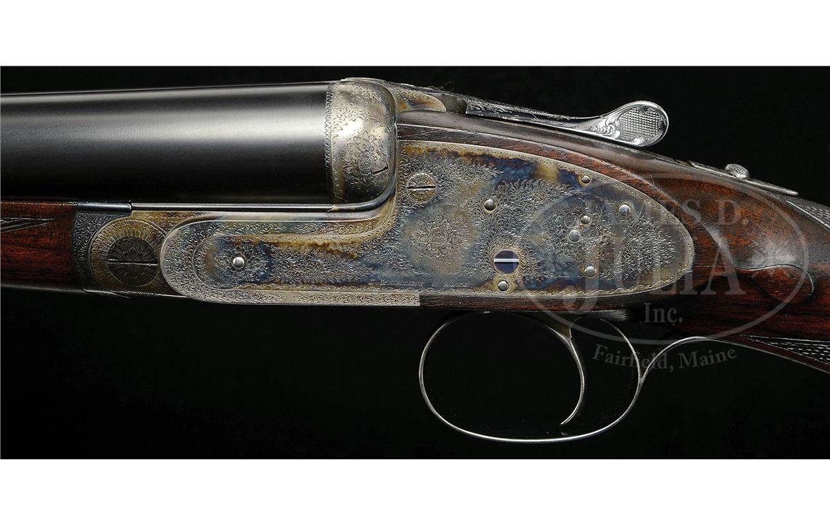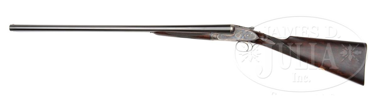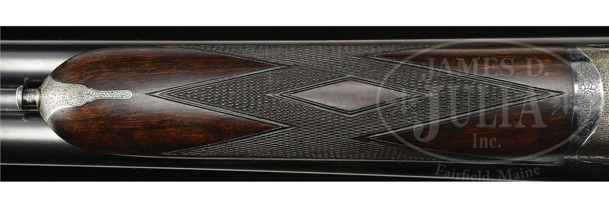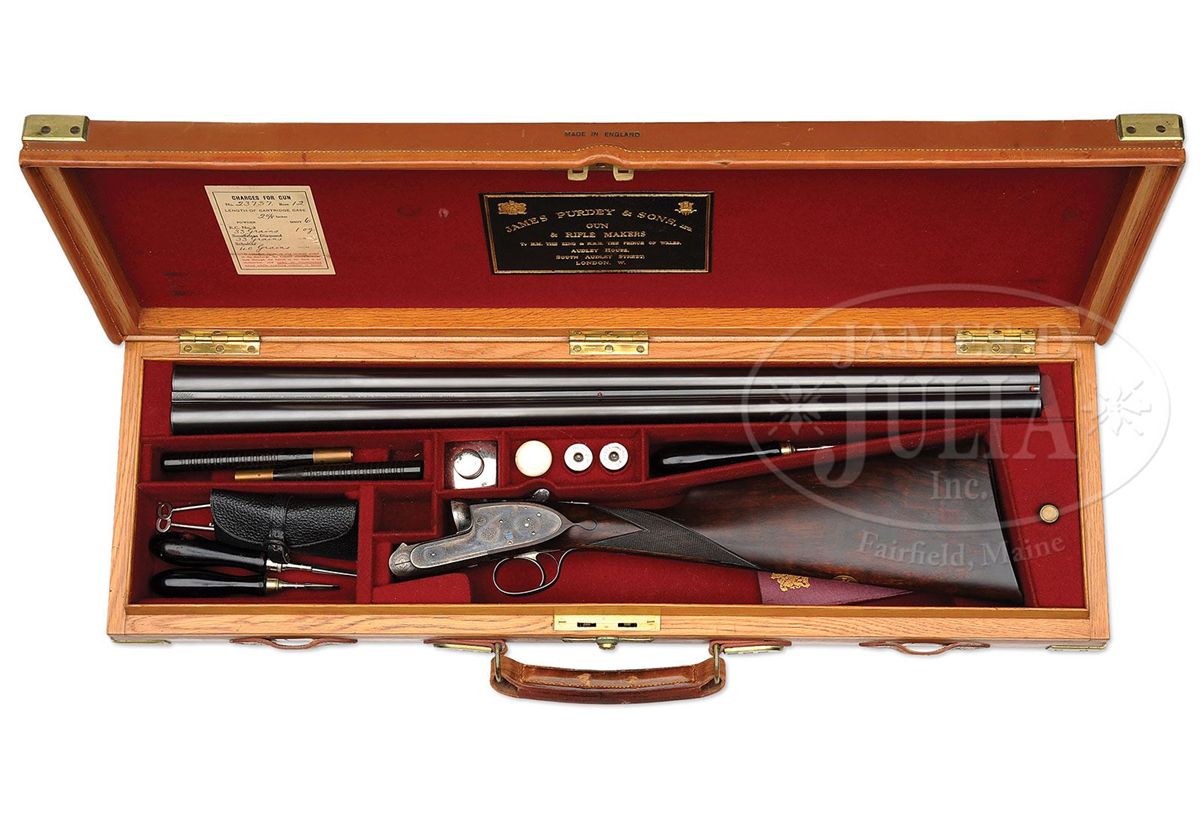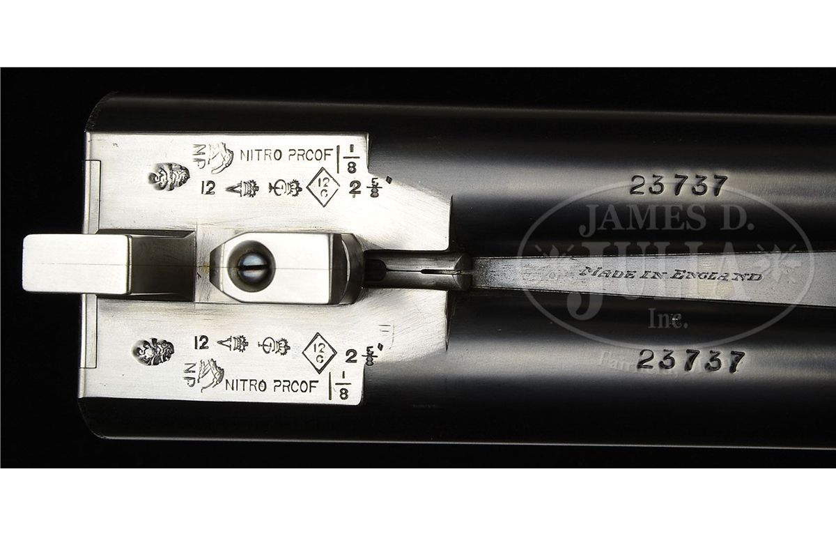 SN 23737. (1927) Cal. 12 ga. 2-3/4" Chambers. 27" Chopper lump bbls are engraved "James Purdey & Sons. Audley House. South Audley Street. London." and "Made of Sir Joseph Whitworth's Fluid Pressed Steel" on narrow, deeply swamped game rib, fitted with red front and mid beads. Bbl flats are stamped with London nitro proofs for 1-1/8 oz of shot and "2-5/8"". Bottoms of bbls are stamped with SN. Bbl maker's initial "H" (for long time Purdey craftsman William Hill) is on bottom of left bbl. Splinter is engraved "Made in England". Tube nos. "58724" and "58725" are on loop. Case hardened, Beesley patent, self-opening, sidelock action features automatic safety (SAFE inlaid in gold), bushed strikers, raised rib tumbler end cocking indicators, and Purdey non-selective single trigger. Action and lockplates are engraved with exceptionally well cut small scroll with rose bouquet highlights in "house" style. "J. Purdey & Sons" is at the bottom of each lockplate, and also on bottom of action over "London". Small bow trigger guard is engraved with medium scroll and with SN at grip. Well figured and nicely marbled, dark European walnut straight grip buttstock measures 14-3/8" over checkered wood butt, and features standard point pattern checkering with mullered borders, drop points, and a gold oval on toe line engraved "G. P." Matching splinter ejector forend has Anson release. Iron is stamped with actioners initials "FH" (Fred Hughes). Bore diameter: left-.734, right -.735. Bore restrictions: left -.007 (IC), right -.008 (IC). Wall thickness: left -.031, right -.030. Drop at heel: 2-1/4", drop at comb: 1-3/8". Weight: 6 lbs. 1 oz. LOP: 14-3/8". Maker's oak and leather case with brass corners and push button latch has round brass central medallion and inset leather tag embossed with an early owner's name on top. Front of lid is embossed "Made in England". Interior is lined in scarlet cloth with gold embossed black leather Purdey label and charge card (for this gun) on lid. Case contains two 2-pc rosewood and brass cleaning rods with brush, mop, jag, and Turks head, pull through cleaning kit in black morocco wallet, action cleaning brushes in red morocco wallet, broken case extractor, 2 black wood handled turnscrews, striker disc tool, bone striker case with spare strikers, Purdey marked square oil bottle, and snap caps. Also included is a booklet "Instructions for Purdey Guns", an inventory of items in case, and two keys. PROVENANCE: Abercrombie & Fitch tag with specifications and price of $875.00 affixed to trigger guard. CONDITION: Excellent. Bbls retain nearly all of a fine London quality re-blue with spot on rear left side of left bbl where cleaned of slight rust. Action retains 60 - 70% orig case hardening color, silvered on bottoms and beads. Lockplates retain 85 - 95% orig case hardening color, left being the strongest. Top lever and forend iron retain most of their orig blue, slightly silvered. Trigger guard re-blued and retains nearly all of that blue. Stocks retain nearly all of their orig rubbed oil finish with a number of minor marks, and a few somewhat heavier, from normal handling and use. Checkering is slightly worn and dark. Incipient 1/4" crack is behind left lockplate. Bores are excellent, smooth, bright and shiny throughout. Action is tight. Bbls are on face. Ejectors are in time. Trigger works. Case leather is excellent, with little discoloration,and a few bumps and rubs. Straps and handle are good. Interior is excellent, with some rubs and soiling from contact with gun. Label is excellent. Charge card is slightly foxed. Accessories are very fine. Pamphlet is slightly squished from being fit to case. A very fine, well balanced, fast handling, high condition gun from the 1920's. 4-48363 MGM38