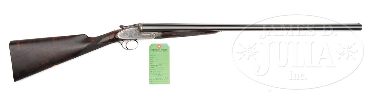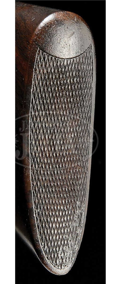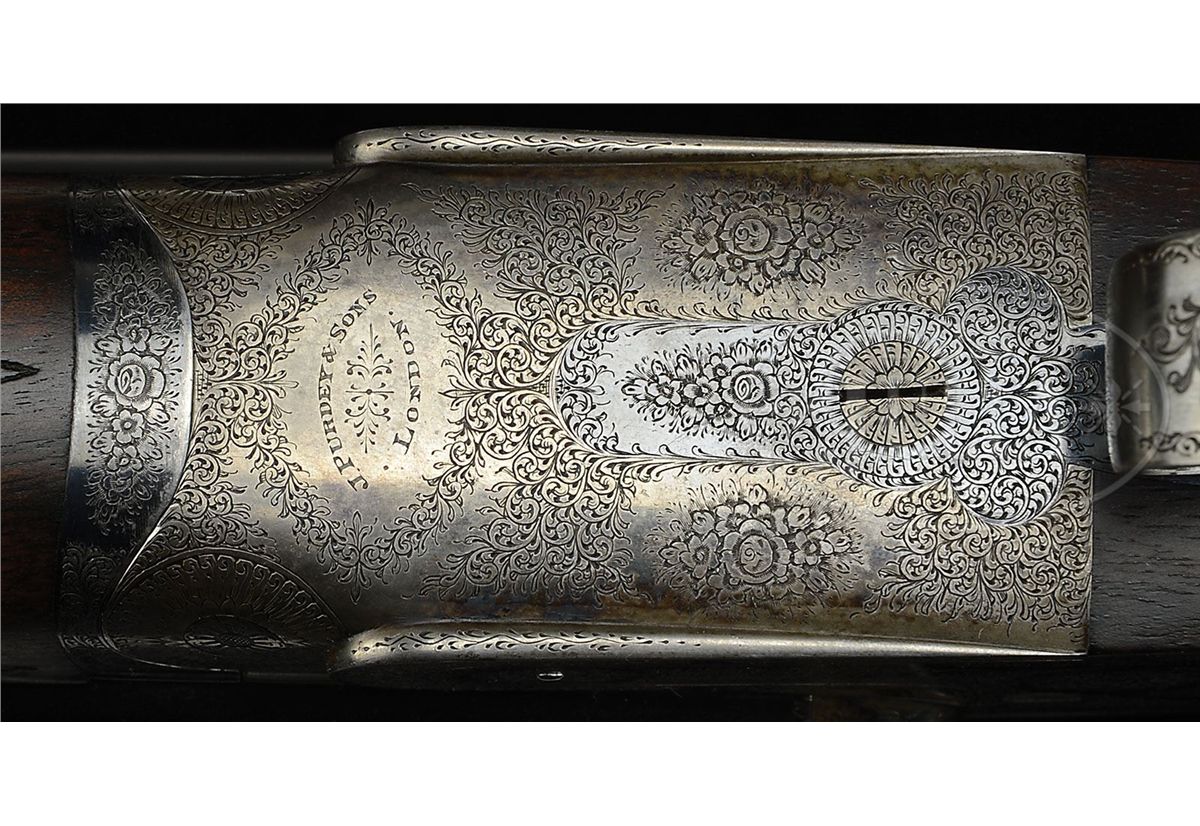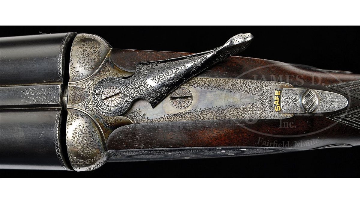 SN 23737. (1927) Cal. 12 ga. 2-3/4" Chambers. 27" Chopper lump bbls are engraved "James Purdey & Sons. Audley House. South Audley Street. London." and "Made of Sir Joseph Whitworth's Fluid Pressed Steel" on narrow, deeply swamped game rib, fitted with red front and mid beads. Bbl flats are stamped with London nitro proofs for 1-1/8 oz of shot and "2-5/8"". Bottoms of bbls are stamped with SN. Bbl maker's initial "H" (for long time Purdey craftsman William Hill) is on bottom of left bbl. Splinter is engraved "Made in England". Tube nos. "58724" and "58725" are on loop. Case hardened, Beesley patent, self-opening, sidelock action features automatic safety (SAFE inlaid in gold), bushed strikers, raised rib tumbler end cocking indicators, and Purdey non-selective single trigger. Action and lockplates are engraved with exceptionally well cut small scroll with rose bouquet highlights in "house" style. "J. Purdey & Sons" is at the bottom of each lockplate, and also on bottom of action over "London". Small bow trigger guard is engraved with medium scroll and with SN at grip. Well figured and nicely marbled, dark European walnut straight grip buttstock measures 14-3/8" over checkered wood butt, and features standard point pattern checkering with mullered borders, drop points, and a gold oval on toe line engraved "G. P." Matching splinter ejector forend has Anson release. Iron is stamped with actioners initials "FH" (Fred Hughes). Bore diameter: left-.734, right -.735. Bore restrictions: left -.007 (IC), right -.008 (IC). Wall thickness: left -.031, right -.030. Drop at heel: 2-1/4", drop at comb: 1-3/8". Weight: 6 lbs. 1 oz. LOP: 14-3/8". Maker's oak and leather case with brass corners and push button latch has round brass central medallion and inset leather tag embossed with an early owner's name on top. Front of lid is embossed "Made in England". Interior is lined in scarlet cloth with gold embossed black leather Purdey label and charge card (for this gun) on lid. Case contains two 2-pc rosewood and brass cleaning rods with brush, mop, jag, and Turks head, pull through cleaning kit in black morocco wallet, action cleaning brushes in red morocco wallet, broken case extractor, 2 black wood handled turnscrews, striker disc tool, bone striker case with spare strikers, Purdey marked square oil bottle, and snap caps. Also included is a booklet "Instructions for Purdey Guns", an inventory of items in case, and two keys. PROVENANCE: Abercrombie & Fitch tag with specifications and price of $875.00 affixed to trigger guard. CONDITION: Excellent. Bbls retain nearly all of a fine London quality re-blue with spot on rear left side of left bbl where cleaned of slight rust. Action retains 60 - 70% orig case hardening color, silvered on bottoms and beads. Lockplates retain 85 - 95% orig case hardening color, left being the strongest. Top lever and forend iron retain most of their orig blue, slightly silvered. Trigger guard re-blued and retains nearly all of that blue. Stocks retain nearly all of their orig rubbed oil finish with a number of minor marks, and a few somewhat heavier, from normal handling and use. Checkering is slightly worn and dark. Incipient 1/4" crack is behind left lockplate. Bores are excellent, smooth, bright and shiny throughout. Action is tight. Bbls are on face. Ejectors are in time. Trigger works. Case leather is excellent, with little discoloration,and a few bumps and rubs. Straps and handle are good. Interior is excellent, with some rubs and soiling from contact with gun. Label is excellent. Charge card is slightly foxed. Accessories are very fine. Pamphlet is slightly squished from being fit to case. A very fine, well balanced, fast handling, high condition gun from the 1920's. 4-48363 MGM38