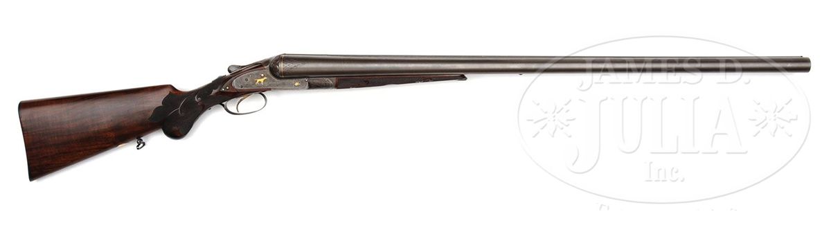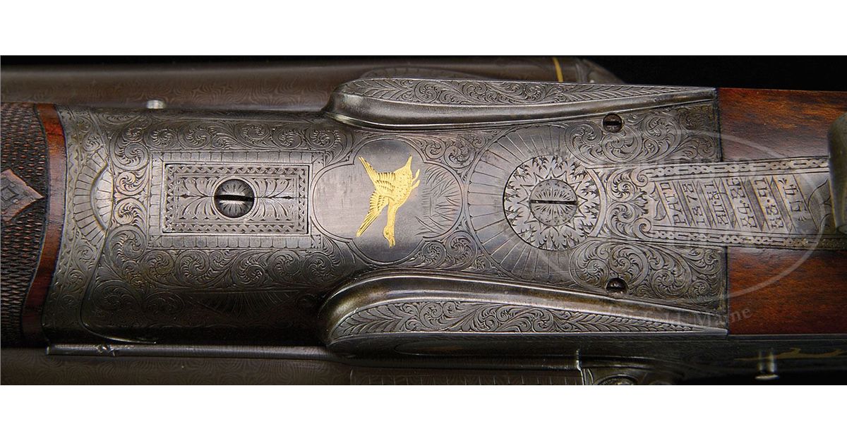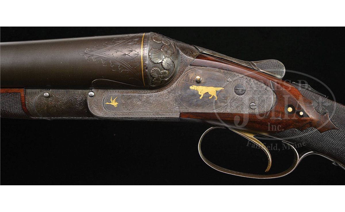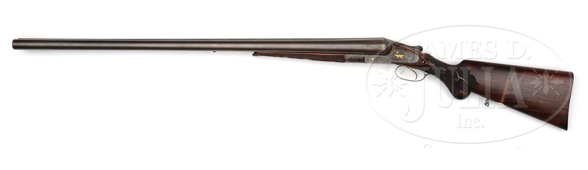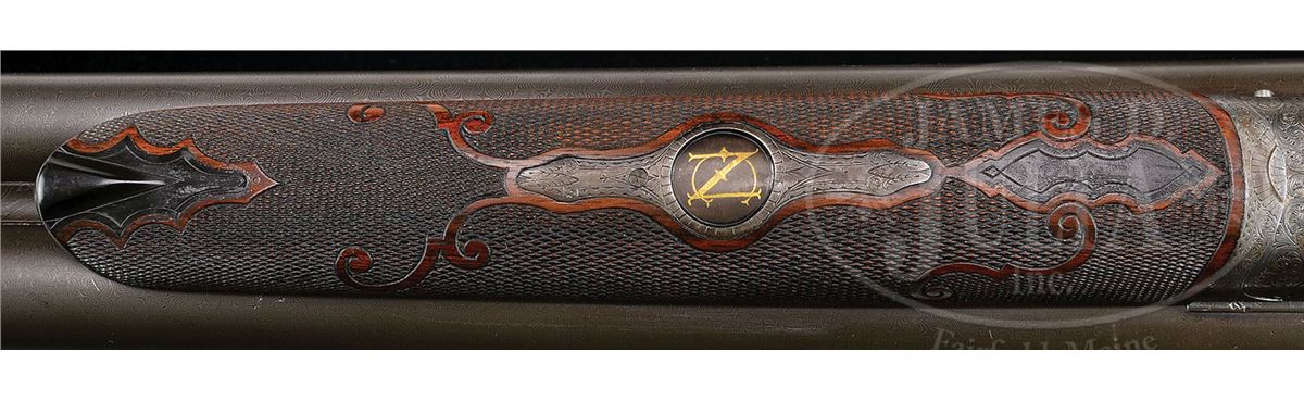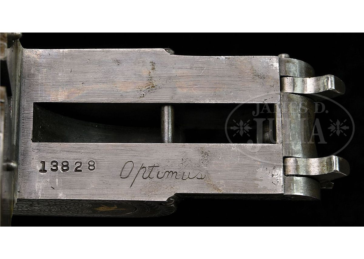 SN 13828. Cal. 8 ga. 3-1/2"Chambers. 33-3/4" Damascus bbls with broad, matted, concave rib have gold bands at breeches which are also engraved with 1-1/2" triangles of diamonds and scroll. Cyma curved returns are cut-in in the style of high grade Lefevers. A large sling eye is screwed to bottom rib. Bottoms of bbls are stamped with "C" (grade) and SN. Early, full compensated action cocked by push rods, is engraved "Optimus" on water table, and features automatic safety, gold-plated single trigger, and cocking indicators. Action is engraved with near full coverage medium scroll in geometric borders outlining vignettes of gold inlaid dogs; setter on left, pointer on right. Front portions of lockplates have gold inlaid ducks. There are also ducks on bottom of action and top lever. A paddling goose is on trigger guard bow. Fences have been relief carved with three stylized shamrocks. Lockplate tails are rebated. Well fiddle figured and nicely streaked European walnut capped round knob semi pistol grip buttstock measures 14-1/8" over checkered wood butt with horn heel and toe plates. There are also inlaid horn "clock hand" drop points with ivory dot decoration. Checkering at grip has fancy border with scrolled ribbons through pattern. There are vacant gold ovals on toe line and at tip of grip cap. Matching splinter forend has fancy inlet black hard rubber tip, with another hard rubber inlay toward rear. It also has push button release, gold inlaid "CN". Bore diameter: left-.955, right -.954. Bore restrictions: left -.130 (Extra full), right -.135 (Extra full). Wall thickness: left -.048, right -.060. Drop at heel: 2-15/16", drop at comb: 1-7/8". Weight: 12 lbs. 7 oz. LOP: 14-1/8". CONDITION: Excellent, as refurbished. Bbls retain nearly all of a grayish re-brown. Action retains nearly all of a muted re-case color. Gold plating of trigger and cocking indicators is somewhat worn. New stocks retain nearly all of their orig rubbed oil finish with a number of marks and light dents, mostly on buttstock. Bores are very fine with some light frosting and a couple of striations. Action is tight. 4-48887 MGM163