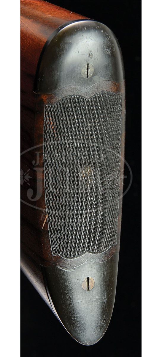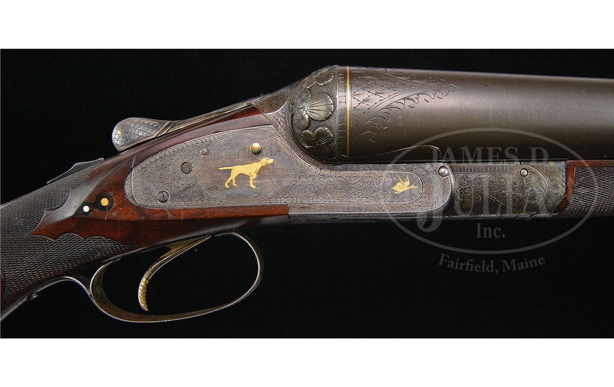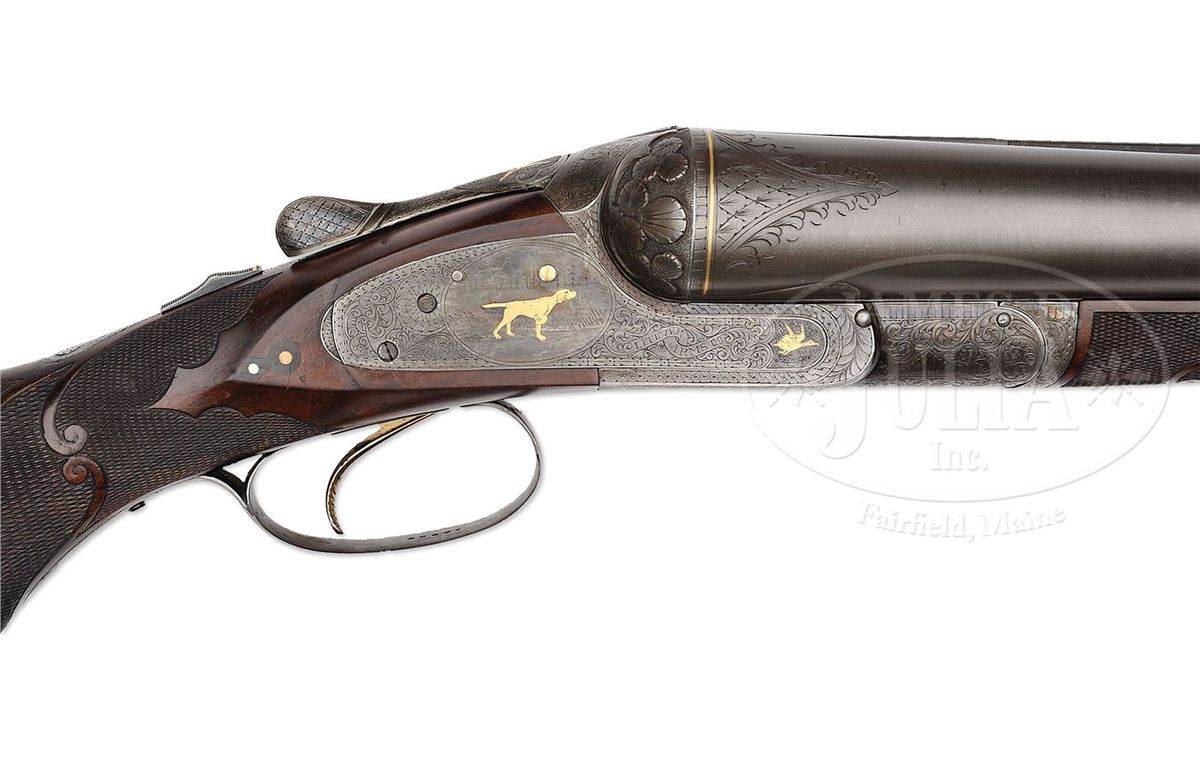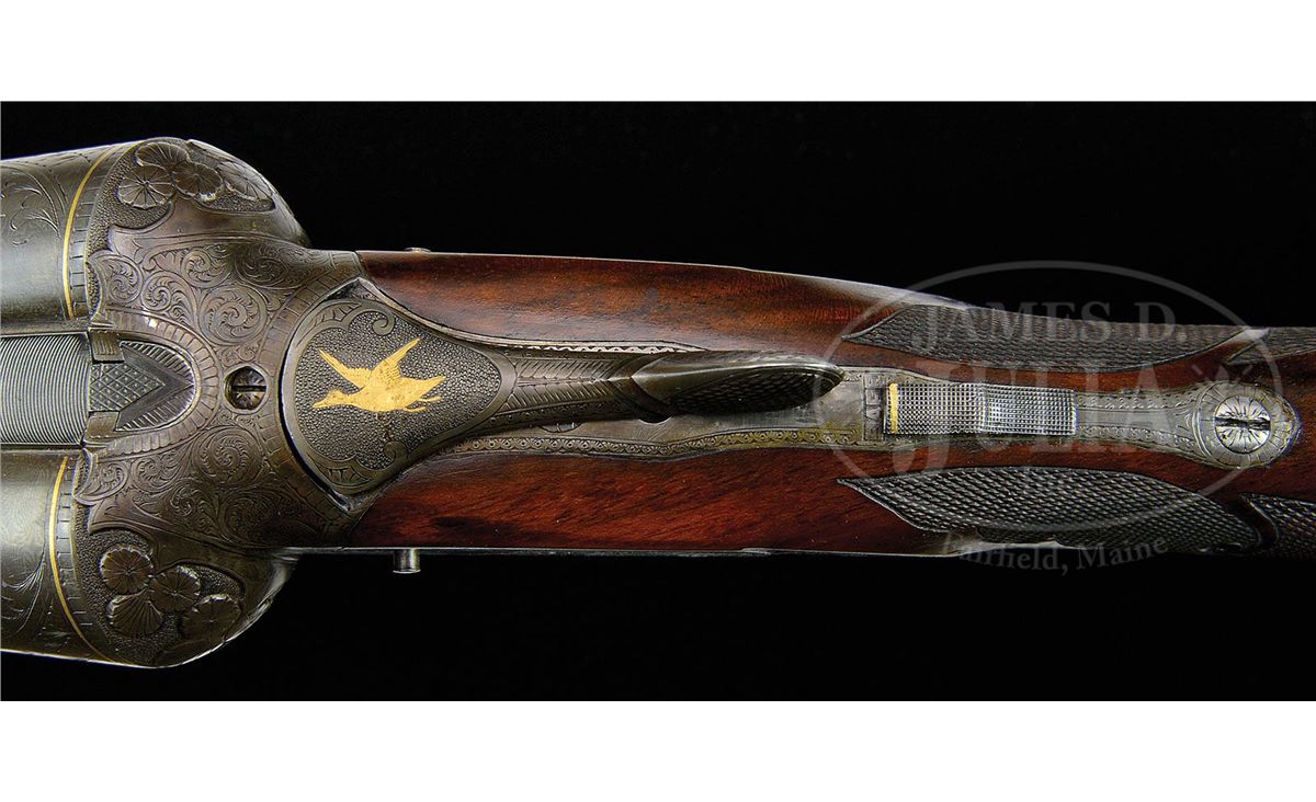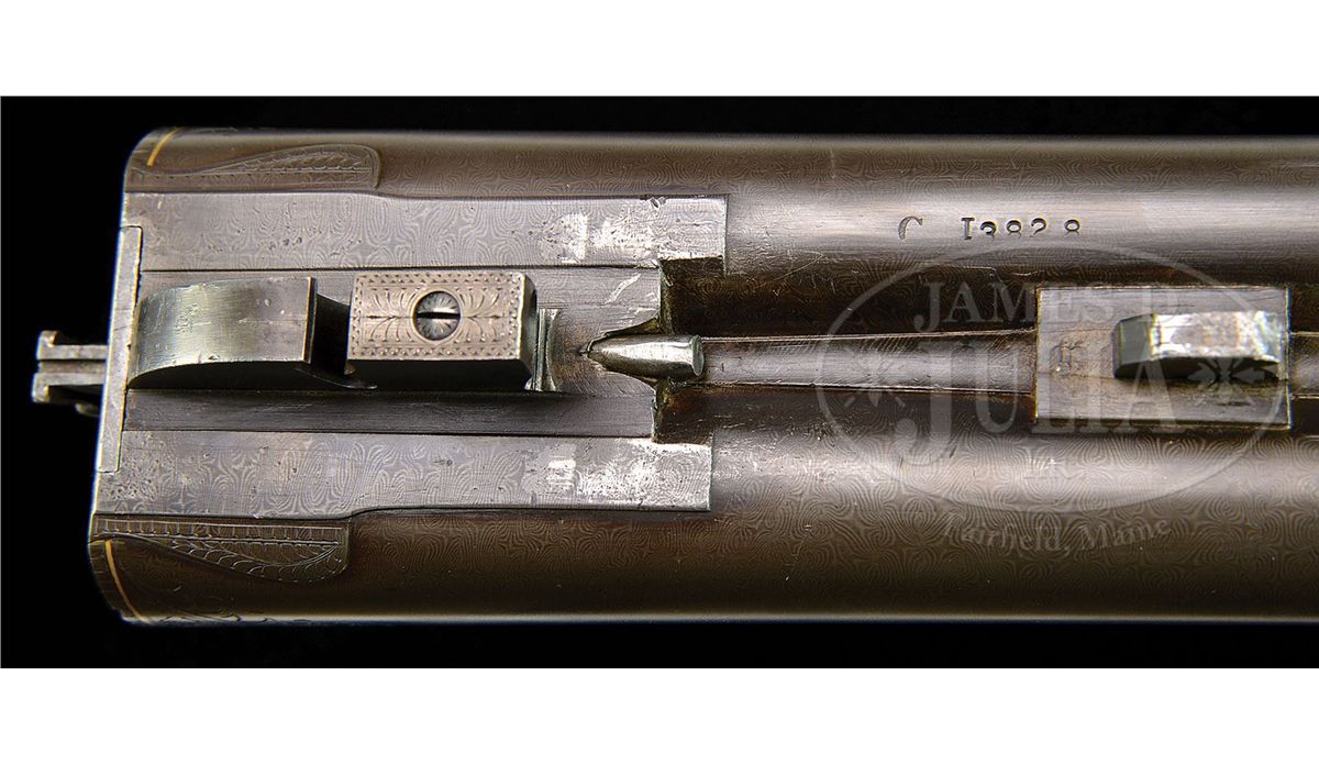 SN 13828. Cal. 8 ga. 3-1/2"Chambers. 33-3/4" Damascus bbls with broad, matted, concave rib have gold bands at breeches which are also engraved with 1-1/2" triangles of diamonds and scroll. Cyma curved returns are cut-in in the style of high grade Lefevers. A large sling eye is screwed to bottom rib. Bottoms of bbls are stamped with "C" (grade) and SN. Early, full compensated action cocked by push rods, is engraved "Optimus" on water table, and features automatic safety, gold-plated single trigger, and cocking indicators. Action is engraved with near full coverage medium scroll in geometric borders outlining vignettes of gold inlaid dogs; setter on left, pointer on right. Front portions of lockplates have gold inlaid ducks. There are also ducks on bottom of action and top lever. A paddling goose is on trigger guard bow. Fences have been relief carved with three stylized shamrocks. Lockplate tails are rebated. Well fiddle figured and nicely streaked European walnut capped round knob semi pistol grip buttstock measures 14-1/8" over checkered wood butt with horn heel and toe plates. There are also inlaid horn "clock hand" drop points with ivory dot decoration. Checkering at grip has fancy border with scrolled ribbons through pattern. There are vacant gold ovals on toe line and at tip of grip cap. Matching splinter forend has fancy inlet black hard rubber tip, with another hard rubber inlay toward rear. It also has push button release, gold inlaid "CN". Bore diameter: left-.955, right -.954. Bore restrictions: left -.130 (Extra full), right -.135 (Extra full). Wall thickness: left -.048, right -.060. Drop at heel: 2-15/16", drop at comb: 1-7/8". Weight: 12 lbs. 7 oz. LOP: 14-1/8". CONDITION: Excellent, as refurbished. Bbls retain nearly all of a grayish re-brown. Action retains nearly all of a muted re-case color. Gold plating of trigger and cocking indicators is somewhat worn. New stocks retain nearly all of their orig rubbed oil finish with a number of marks and light dents, mostly on buttstock. Bores are very fine with some light frosting and a couple of striations. Action is tight. 4-48887 MGM163