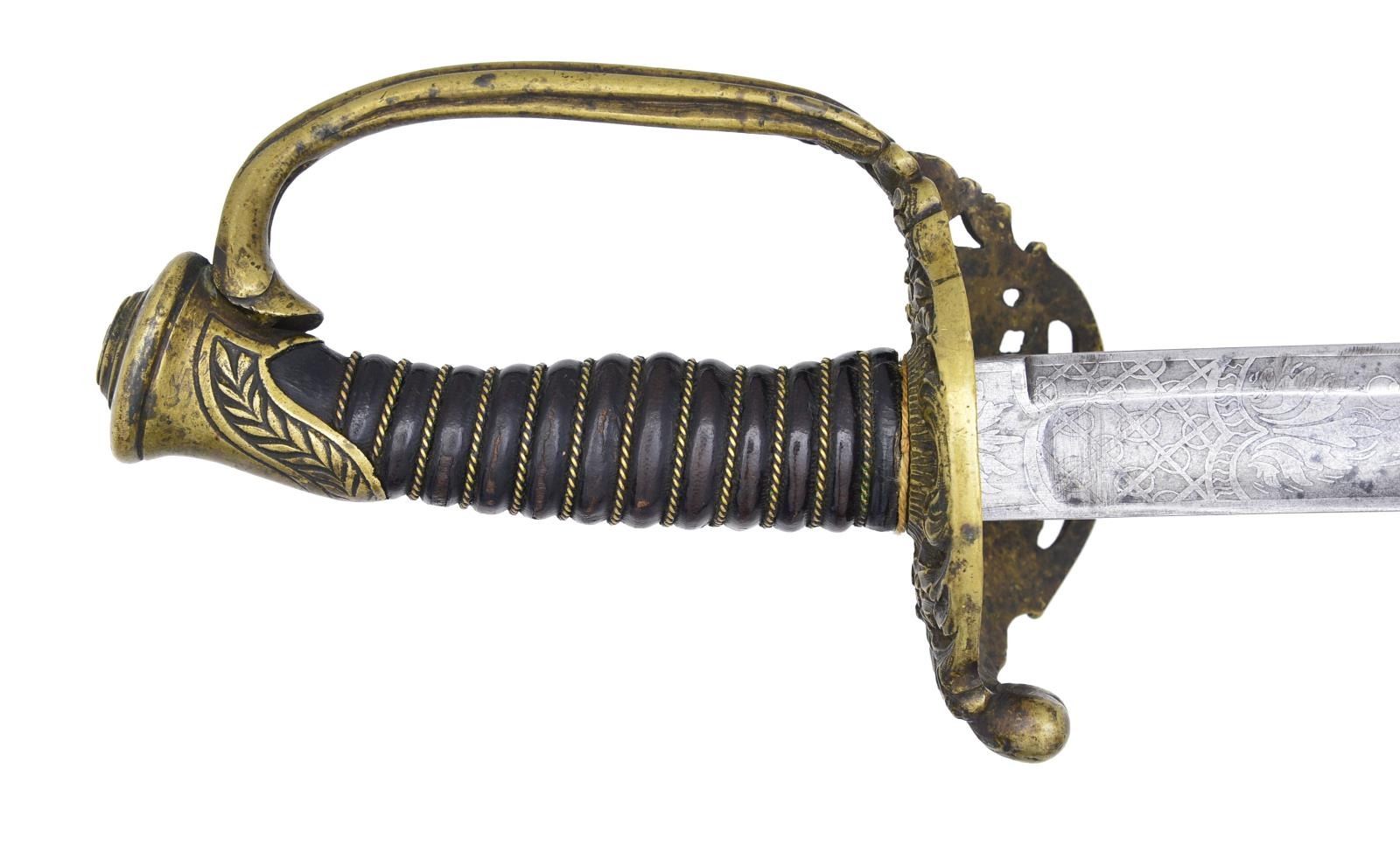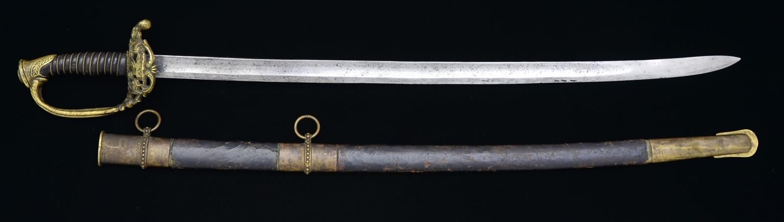 OFFICER’S SWORD BY THOMAS, GRISWOLD & CO. OF NEW ORLEANS, LOUISIANA. Overall length: 37 1/4". Blade length: 30”. This rare & desirable product of Thomas, Griswold & Co. remains one of the most highly sought after of all Confederate edged weapons. Thomas, Griswold & Co. was a prolific producer of arms for the Confederacy and grew out of the dissolution of Hyde & Goodrich in August of 1861. The unprecedented number of arms manufactured by the firm is rendered even more amazing by the fact they were in business for less than a year w/ production being terminated in April of 1862 w/ the capture of New Orleans by Union forces. There are 2 theories as to the castle depicted on the guard of the sword. Some believe it to be a rendition of Fort Sumter, others believe it may be a depiction of Fort Proctor near New Orleans. Fort Proctor was constructed in the 1850s and is sometimes referred to as Fort Beauregard after P.G.T. Beauregard, a famous Confederate general, who oversaw construction of the fort. The blade is etched over 2/3 of its length w/ various foliate & military motifs. One side of the blade features crossed cannons along w/ a spray of arms & flags. The other side has a large gothic style “C. S. “. Gilded brass hilt w/ a down turned guard w/ pierced foliate decoration that includes a central castle motif. The top of the guard is decorated w/ similar foliate forms along w/ 2 large flowers. A single branch knuckle bow divides just before entering the pommel. The stepped ovate pommel is decorated on the lower edge w/ laurel leaves. Wire wrapped leather grip. Gilded brass mounted, leather covered, brass scabbard. Scabbard rings on the top & middle mount are surrounded w/ a simulated beaded motif & support 2 brass suspension rings. Plain brass tip & drag. This scabbard features an interesting & somewhat unique construction technique in that the scabbard body is made of solid brass, as all Thomas, Griswold & Co. swords were, the scabbard was then covered w/ leather between the mounts. This technique yields a much stronger scabbard capable of withstanding extended field use but remaining visually attractive for the officer. CONDITION: the blade exhibits a medium to light gray, slightly mottled patina. The etching remains quite distinct & attractive to the eye. The hilt retains only traces of original gilding but the overall motif remains quite sharp & visually impactful. The leather on the grip generally shows light wear w/ a few high spots being worn through. Wire is complete. Scabbard mounts show traces of original gilded finish coupled w/ a deep, rich, dark mustard patina. The drag has a few scattered, shallow dents. Leather shows expected scuffs & scrapes w/ no major losses. The leather has shrunk slightly from the edges of the mounts revealing the solid brass scabbard beneath. A rare opportunity to acquire one of the most iconic swords produced by Thomas, Griswold & Co. of New Orleans. It is estimated that there are fewer than 20 of these swords in existence & the vast majority are in public collections. (02-14716/BF). $75,000-110,000.