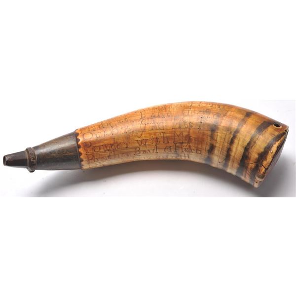 Authentic carved American Powder Horn inscribed “Edmund Austin’s Horn, Made at Lake George, Octobry Ad 1758, I Powder with My Bro
