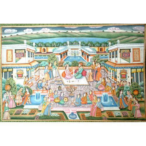 The painting is about a king visiting one of his queens. The king and queen sitting in centre on a well made carpet are surrounded by the queens maids. Various bunches of flowers in different colors and fountains are seen at various places. <p>