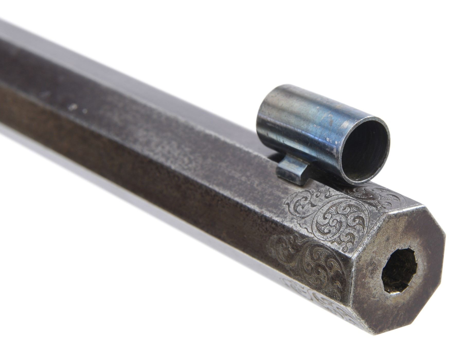 MODEL 1852 SPORTING RIFLE. Cal. 90 bore (about 37 cal). S# 8319. Very rare configuration and probably the finest engraved 1852 rifle. 26" heavy octagonal browned barrel, 3-line address, iron mounted, double set triggers, 4" tang sight, cut-off folding rear sight, inset hooded globe pin front sight and an additional German silver blade front sight in tool box. Barrel breech & muzzle, frame, lock, hammer, lever, trigger plate, tool box & buttplate are beautifully engraved with extra-fine foliate arabesque scrolls with 2 scenes with deer. Mounted on high gloss varnished figured walnut. CONDITION: fine overall, all matching, barrel retains about half of its mottled thinning brown finish. Engraving is crisp, case colors are found in protected areas, balance of engraving has silvered patina. and surfaces "silvered", areas of pin-prick pitting on tool box. Stock is sound, well fit retaining most of its original high gloss varnish with scattered dents, nicks, and scratches. Mechanics are excellent, bright shiny crisp rifled bore. PROVENANCE: Norm Flayderman family collection. (01-27177/JS). ANTIQUE. $12,000-15,000.