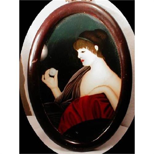 When you see this up close you are really going to appreciate the painting on this. I have one close-up of the work and you can see the delicate brush strokes. This has the most vibrant reds against this black background. The glare takes away from it but you can see the woman?s white skin which is almost Asian and it looks like Chinese paintings you see on ivory with the soft natural shading. . This is reverse painted . I am not sure if this is the original frame but it fits it well. The full length is 9 ½" and it is in very good condition the frame has one nick on it .