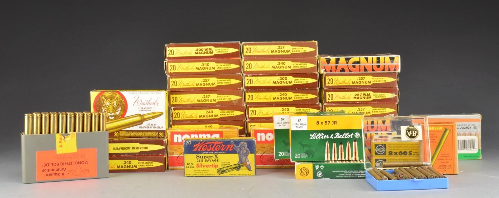 Lot contains hollow point ammunition. 8X57JR: 4 Boxes of 20 rds. Sellier & Bellot 196 grain soft point. 8X60S: 2 Boxes of 20 rds. RWS H Mantel 187 grain hollow point. 9.3X72R: 1 Box of 20 rds. Sellier & Bellot 193 grain soft point. / 1 Box of 10 rds. Altdorf. / 1 Mixed group of 20 assorted loadings. 416 WEATHERBY MAG: 1 Box of 20 rds. solids. Box end flaps are missing. 300 WEATHERBY: 1 Box of 19 rds. A-Square 220 grain monolithic solids. / 1 Box of 20 rds. 180 grain soft point. / 1 Box of 20 rds. 150 grain soft point. / 270 WEATHERBY: 1 Box of 20 rds. 130 grain soft point. 257 WEATHERBY: 1 Box of 20 rds. 120 grain Nosler. / 1 Box of 20 rds. 117 grain Nosler. / 6 Boxes of 20 rds. 100 grain soft point. / 1 Box of 20 117 grain rnd. nose soft point. / 1 Partial box of 11 rds. 117 grain rnd. nose. 240 WEATHERBY: 8 Boxes of 20 rds. 100 grain soft point. / 3 Boxes of 20 rds. 70 grain soft point. / 2 Boxes of 20 rds. 100 grain PT-EX. 6.5X54: 2 Boxes of 20 rds. Norma 139 grain soft point. CONDITION: condition ranges from fair to very good, boxes may have wear, scuffing, tears or missing end flaps. (02-14124-6/RW). $500-900.