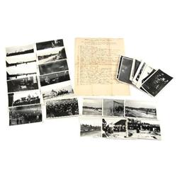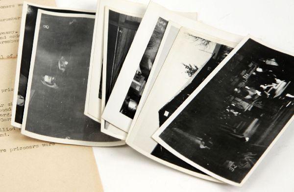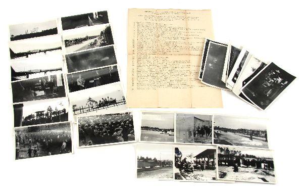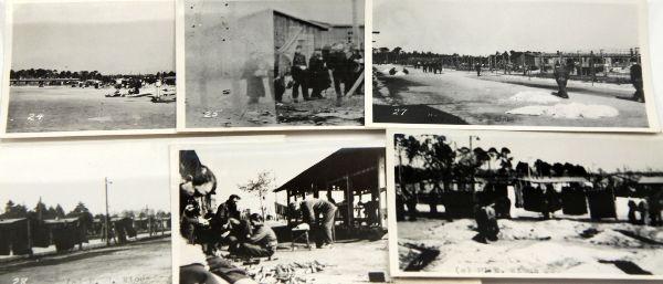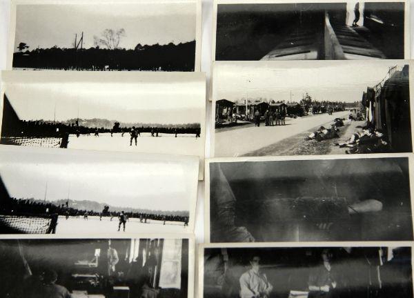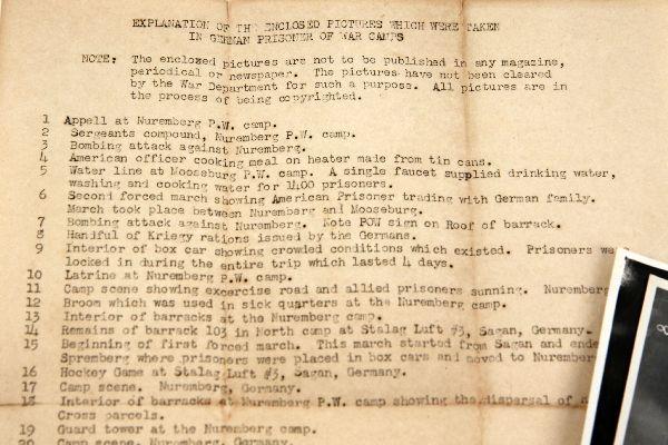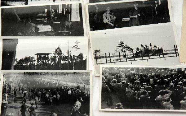 A grouping of photos with a bit of mystery. According to the family, Ed Tovrea had a dark room and presumably produced these pictures and while developing placed a number on each picture. Some, but not all pictures are marked Copr. H.E. Kious. Kious was at Stalag III for over a year. Without question these photos were taken with a smuggled camera. According to the family Ed compiled a corresponding explanation of the photos, in part reading as follows: "EXPLANATION OF THE ENCLOSED PICTURES WHICH WERE TAKEN IN GERMAN PRISONER OF WAR CAMPS" then a sub text as follows "NOTE: The enclosed pictures are not to be published in any magazine periodical or newspaper. The pictures have not been cleared by the War Department for such a purpose. All pictures are in the process of being copyrighted" It appears nothing further was ever done with the photos aside from writing the description, the photos detail camp life from Stalag III to Nuremburg. The description list 35 pictures, and there are 27 in this grouping. The family felt certain Ed developed the photos for Kious and after the film "The Great Escape"came out had hoped to somehow market them.