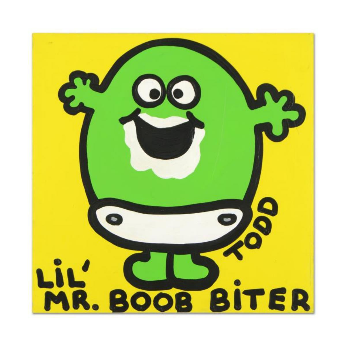 We acquired this piece as part of a larger collection. We do not approve of its inappropriate content. "Lil Mr Boob Biter" is an original acrylic painting on canvas by Todd Goldman, hand signed by the artist. This piece comes gallery wrapped. Includes Certificate of Authenticity. Measures approx. 24" x 24" (image). Please note: There are minor scuffs on this piece; particularly on the corners and edges. Reference #: 234823